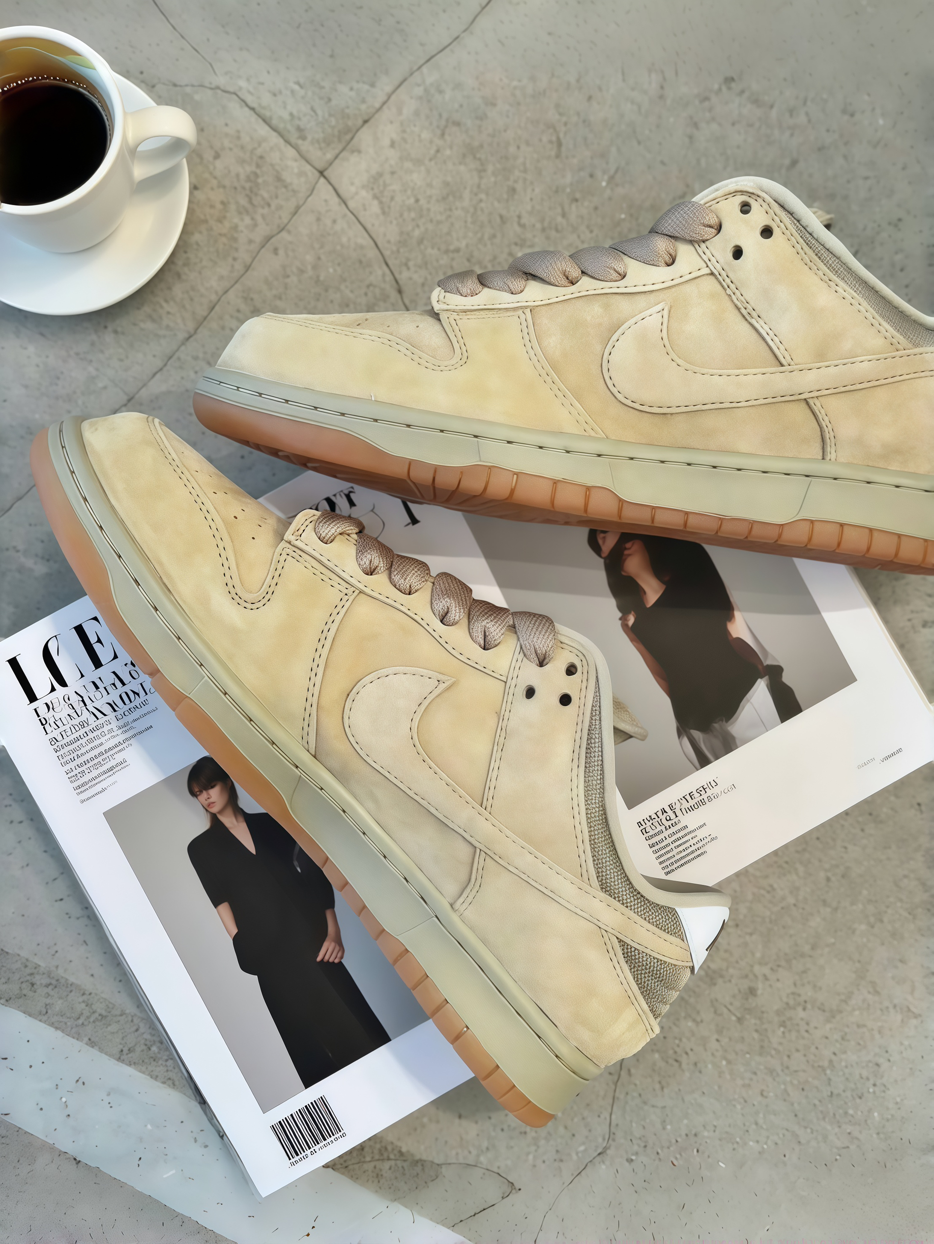 救命!这双浅卡其Dunk的质感我能摸一天!麂皮软乎乎的像云朵,鞋带是粉棕调的灯芯绒材质,和鞋底的浅粉边一搭,温柔到骨子里~ 上脚那天搭了条燕麦色针织裙,朋友说我像把“秋日拿铁”穿身上了。而且脚感绝了,鞋底软软的,我上周穿它逛了一下午家具店,回家脱鞋居然没觉得累。最惊喜的是耐脏,有天咖啡溅了一点在鞋头,拿湿巾擦完居然没痕迹,现在天天穿都不心疼,后悔没早点发现这种舒服又省心的款!