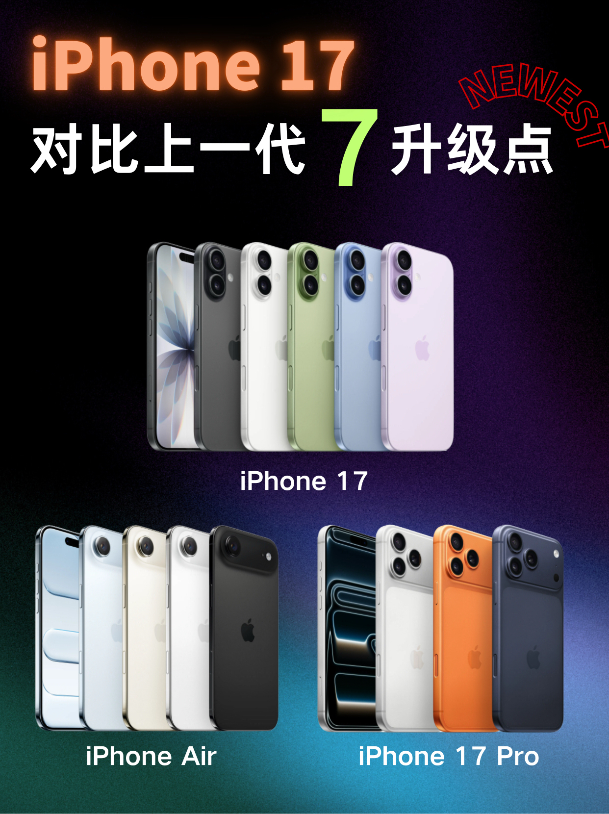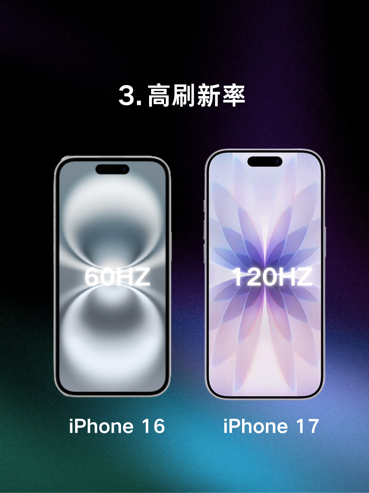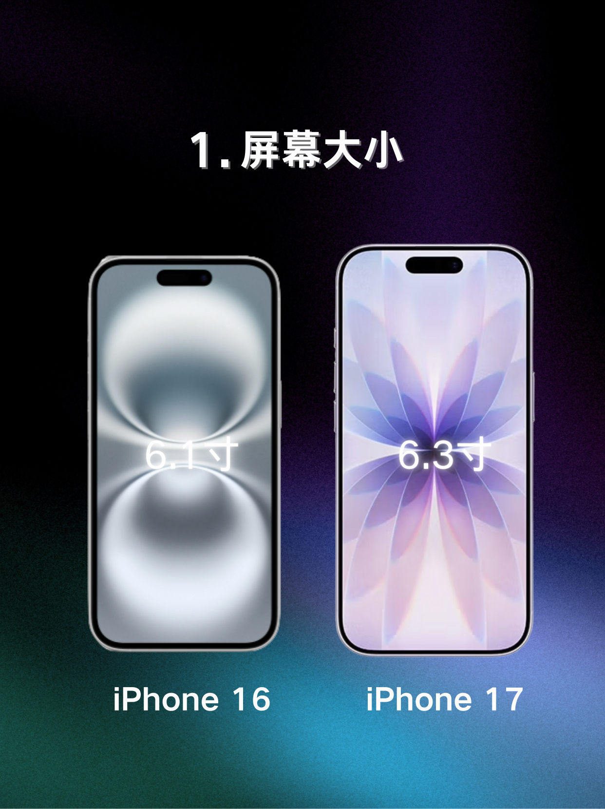 1️⃣屏幕升级 🖥️标准版iPhone 17尺寸升级到6.3,iPhone 16是6.1; 2️⃣ 更薄设计 👀史上最轻薄的 iPhone!Air版机身厚度仅 5.6mm极致纤薄,配合钛合金中框,手感和质感双双提升; 3️⃣ 高刷新率 ✨标准版也告别“60Hz时代”,全系支持120Hz高刷新率ProMotion,峰值亮度达 3000 尼特,滑动更跟手、画面更流畅: 4️⃣ 性能升级 🔥17搭...