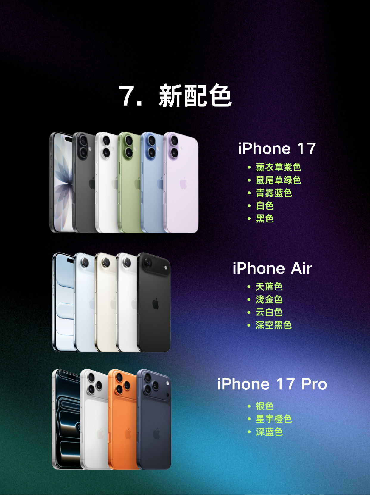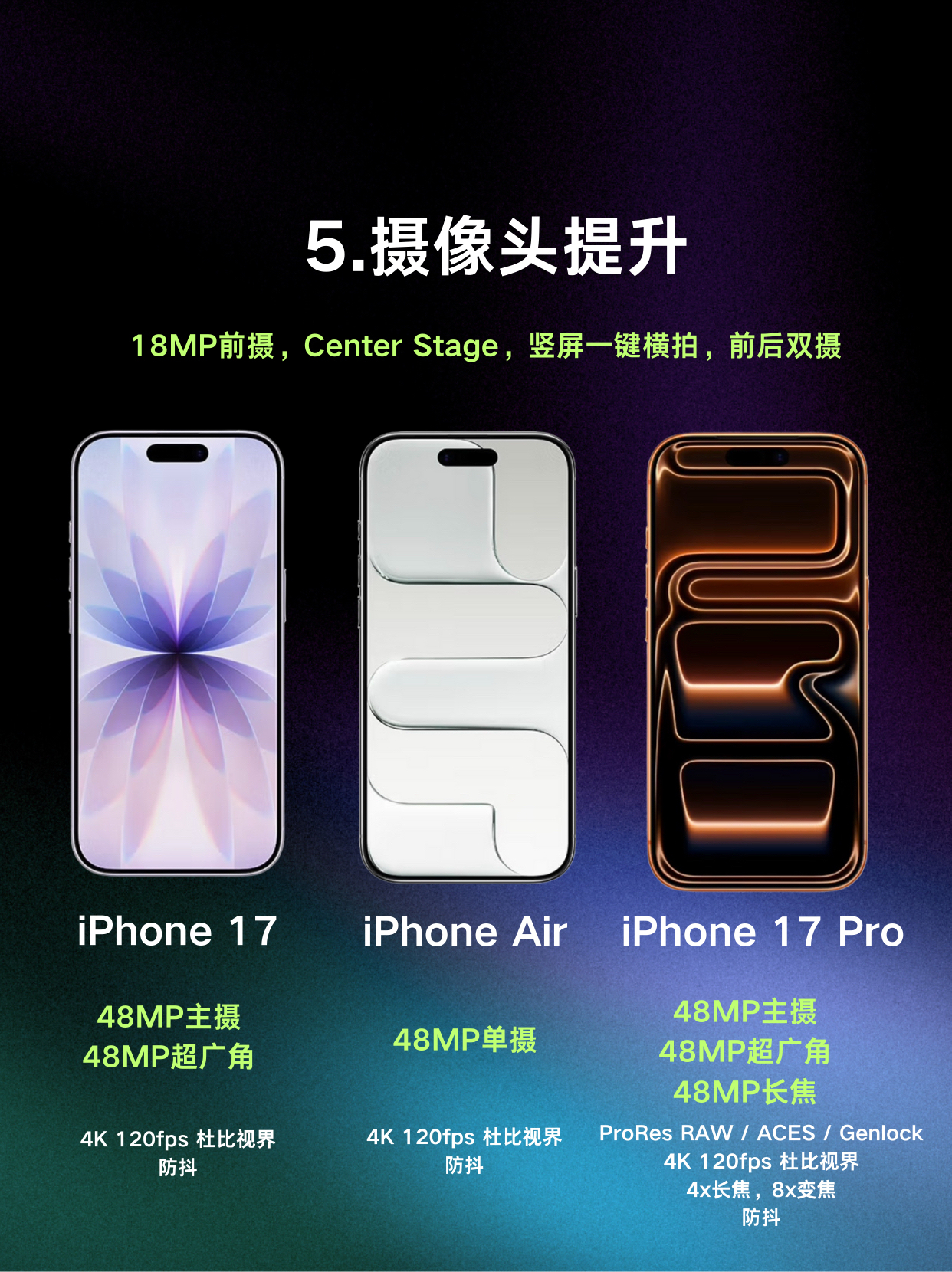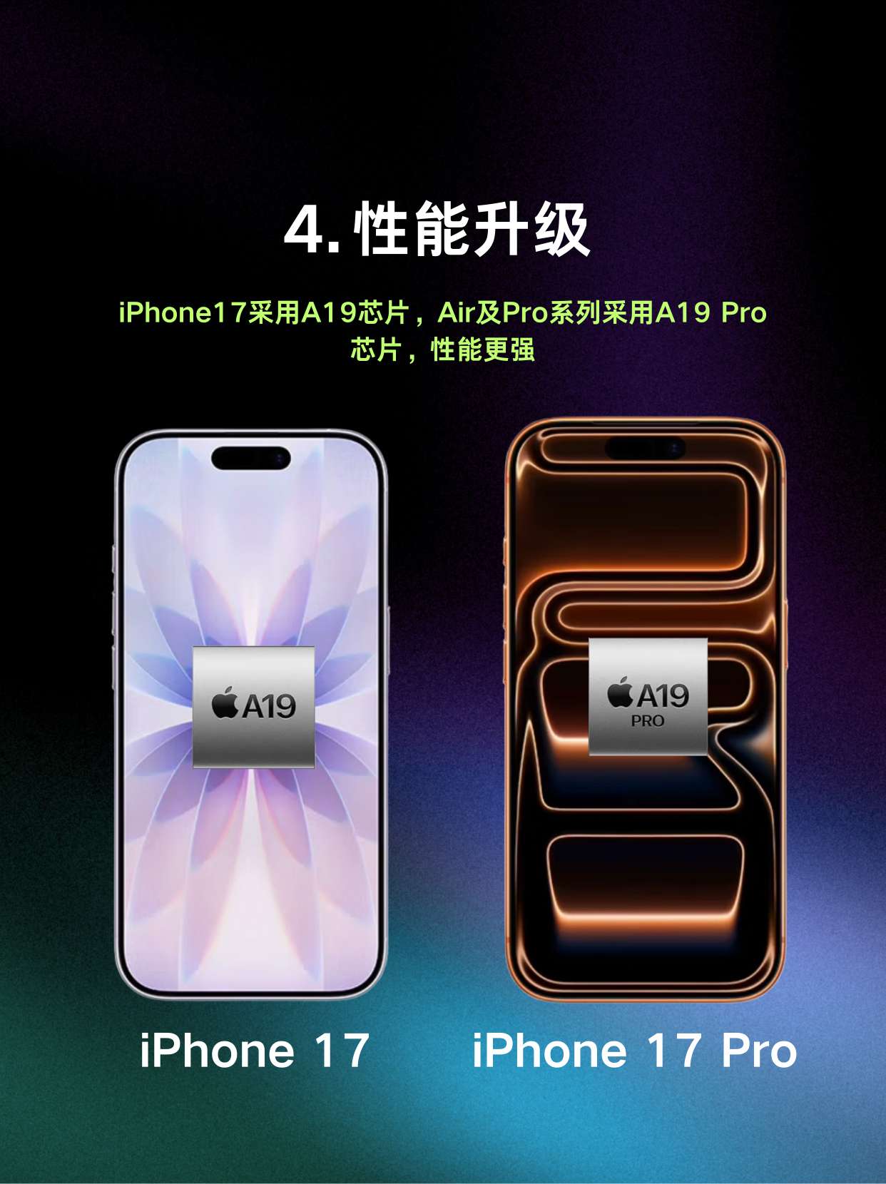 1️⃣屏幕升级 🖥️标准版iPhone 17尺寸升级到6.3,iPhone 16是6.1; 2️⃣ 更薄设计 👀史上最轻薄的 iPhone!Air版机身厚度仅 5.6mm极致纤薄,配合钛合金中框,手感和质感双双提升; 3️⃣ 高刷新率 ✨标准版也告别“60Hz时代”,全系支持120Hz高刷新率ProMotion,峰值亮度达 3000 尼特,滑动更跟手、画面更流畅: 4️⃣ 性能升级 🔥17搭...