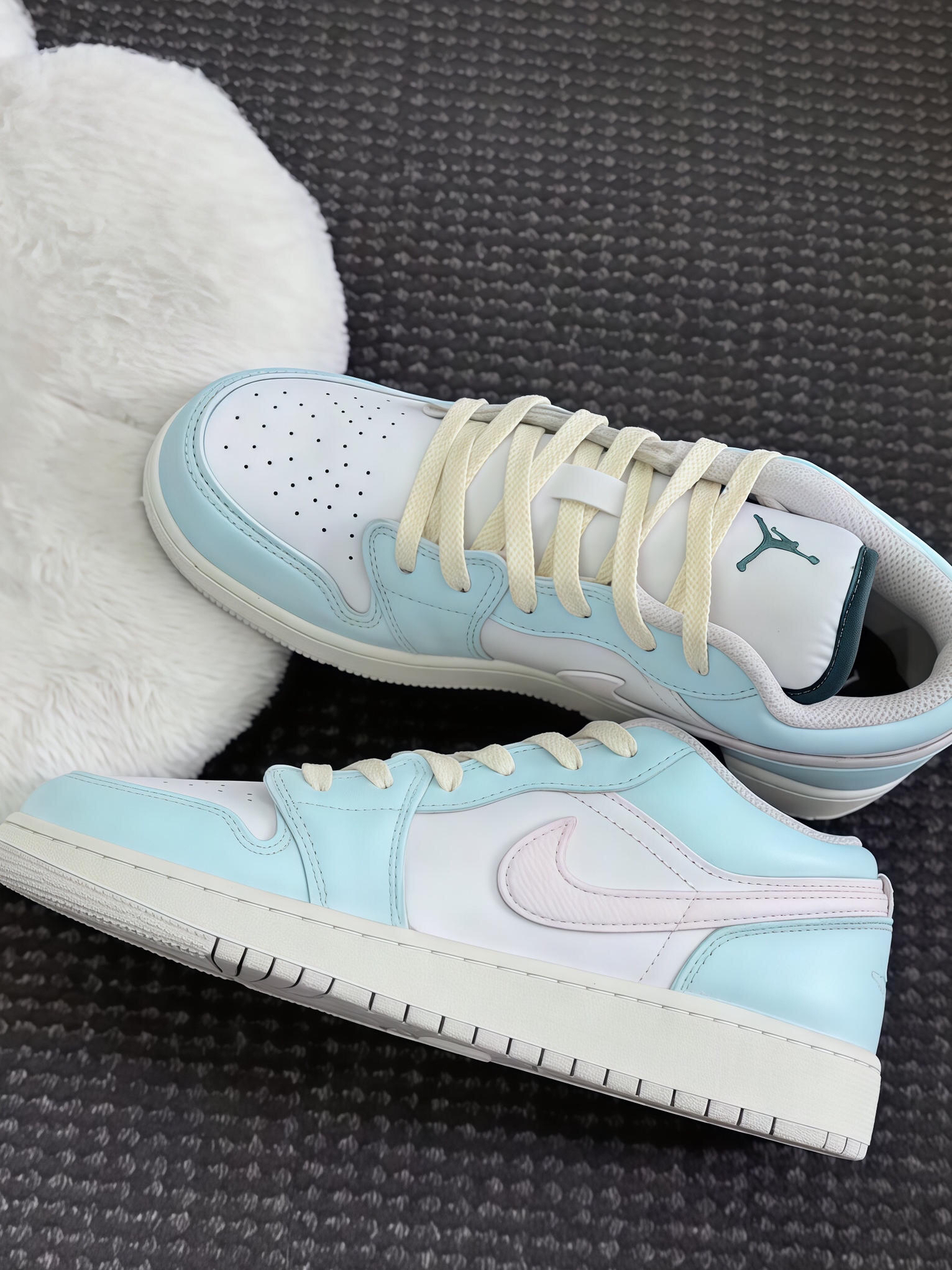 家人们,这双AJ的配色真的戳到我心巴上了!淡蓝和浅粉的搭配,像把春天的温柔都揉进去了,奶乎乎的鞋带也很有质感。拿到手就赶紧上脚,皮质软软的,包裹性特别好,