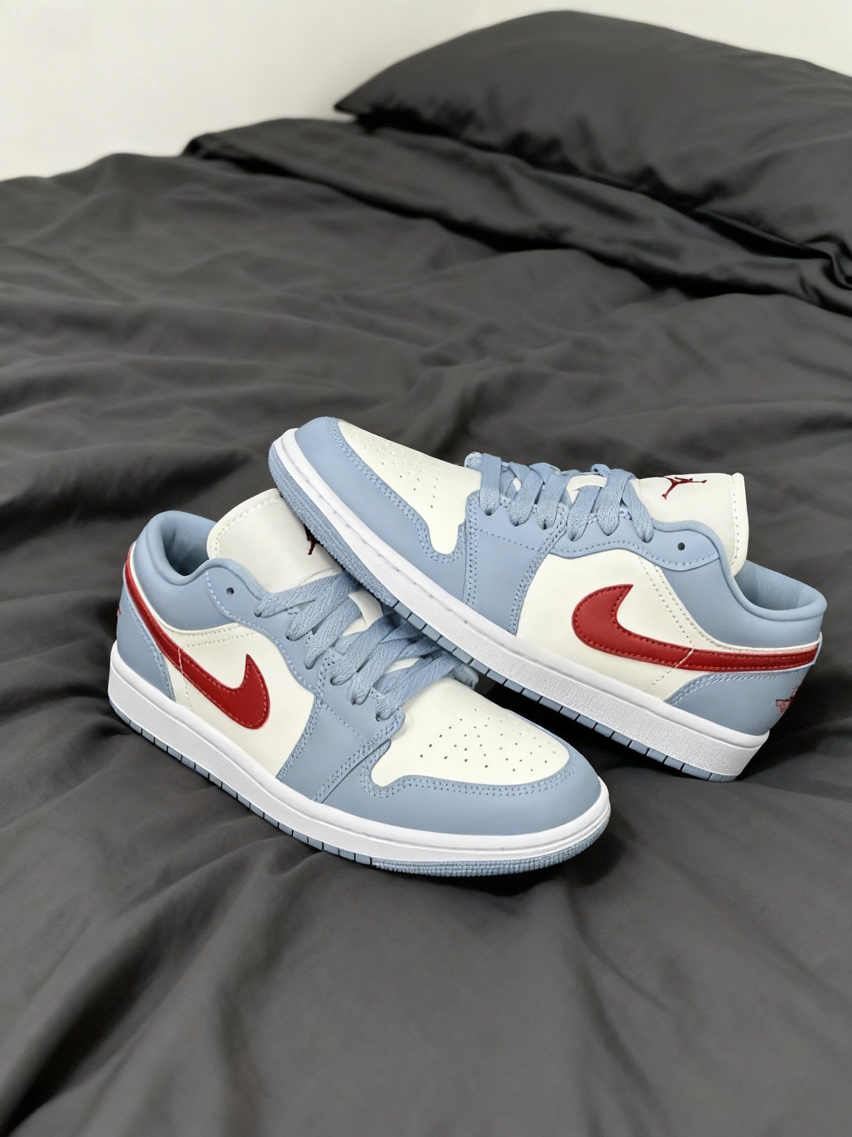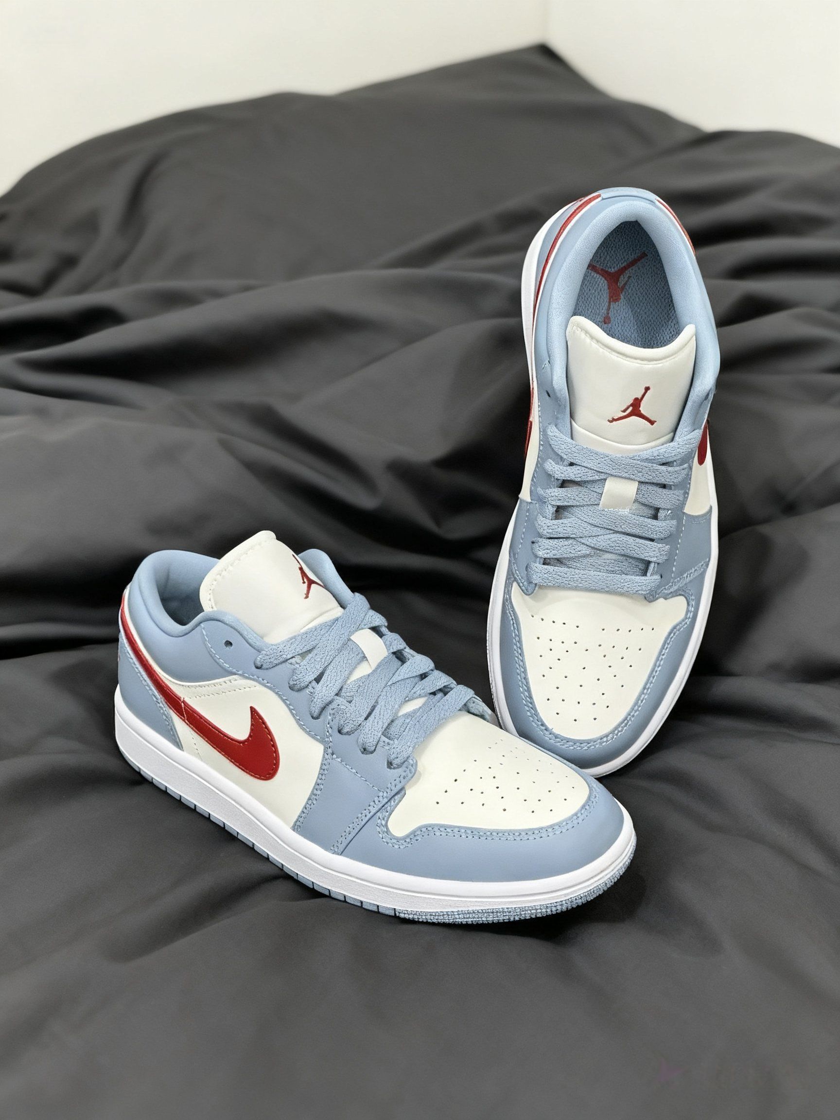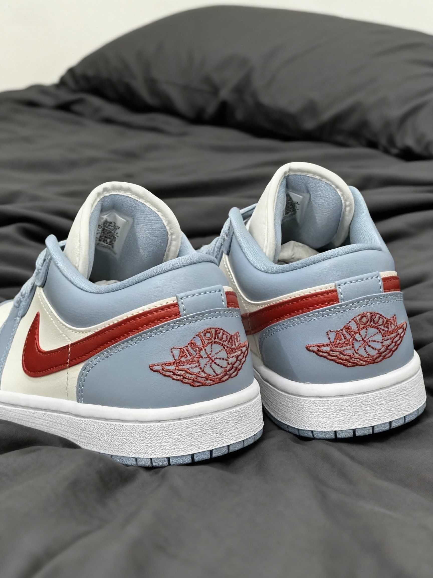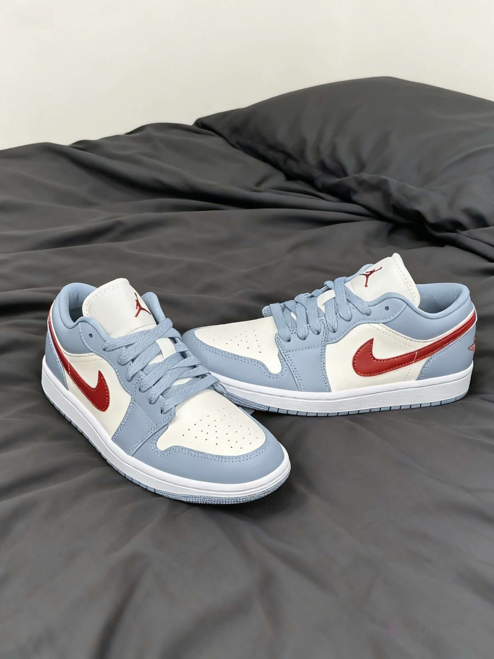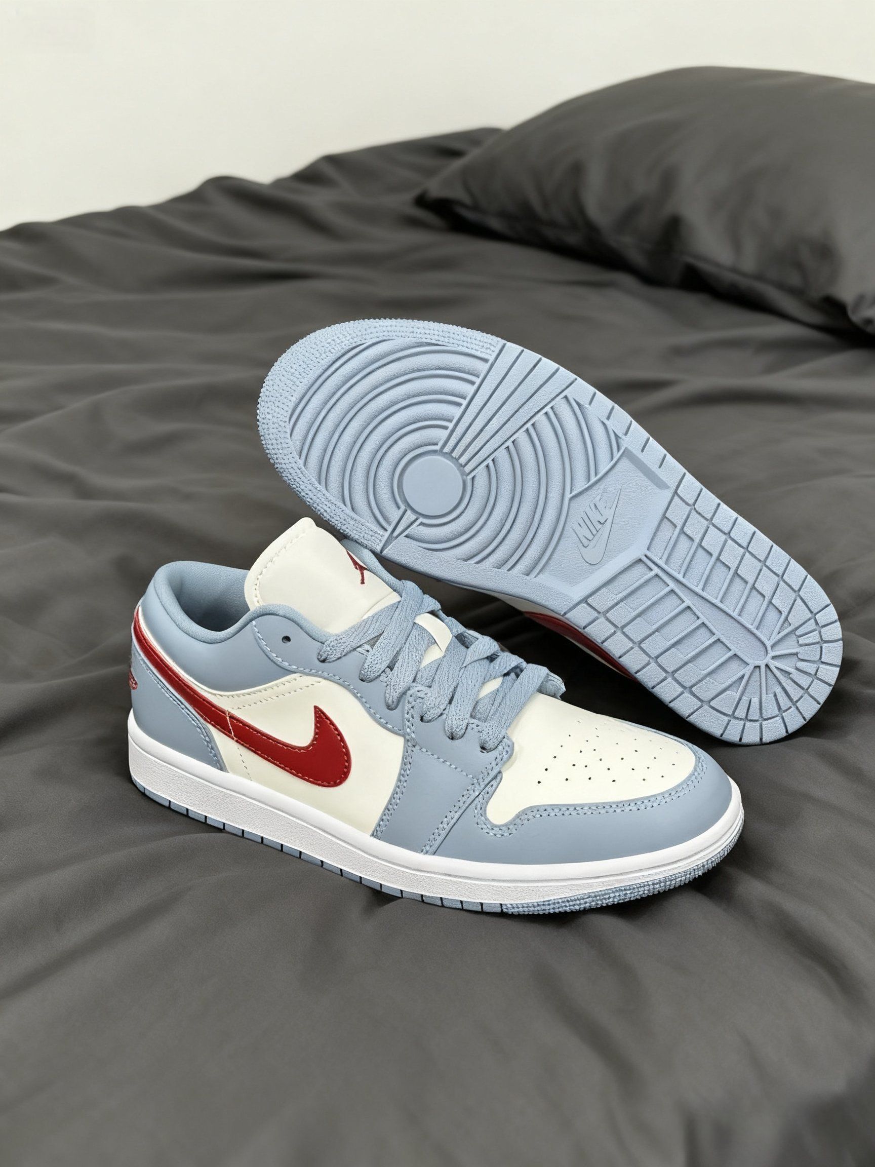 刚收到这双AJ1 Low,上脚的瞬间就被惊艳到了!浅蓝、米白和红的配色组合太绝了,低帮设计让脚踝活动很自由,夏天穿也不会闷。皮质很软,包裹感恰到好处,走路久了也不觉得累。搭配牛仔裤、运动裤都很合适,随便一穿就很有范儿,感觉自己的穿搭质感都提升了。每次出门都想穿它,真的越看越喜欢,算是近期买到最满意的鞋子啦~