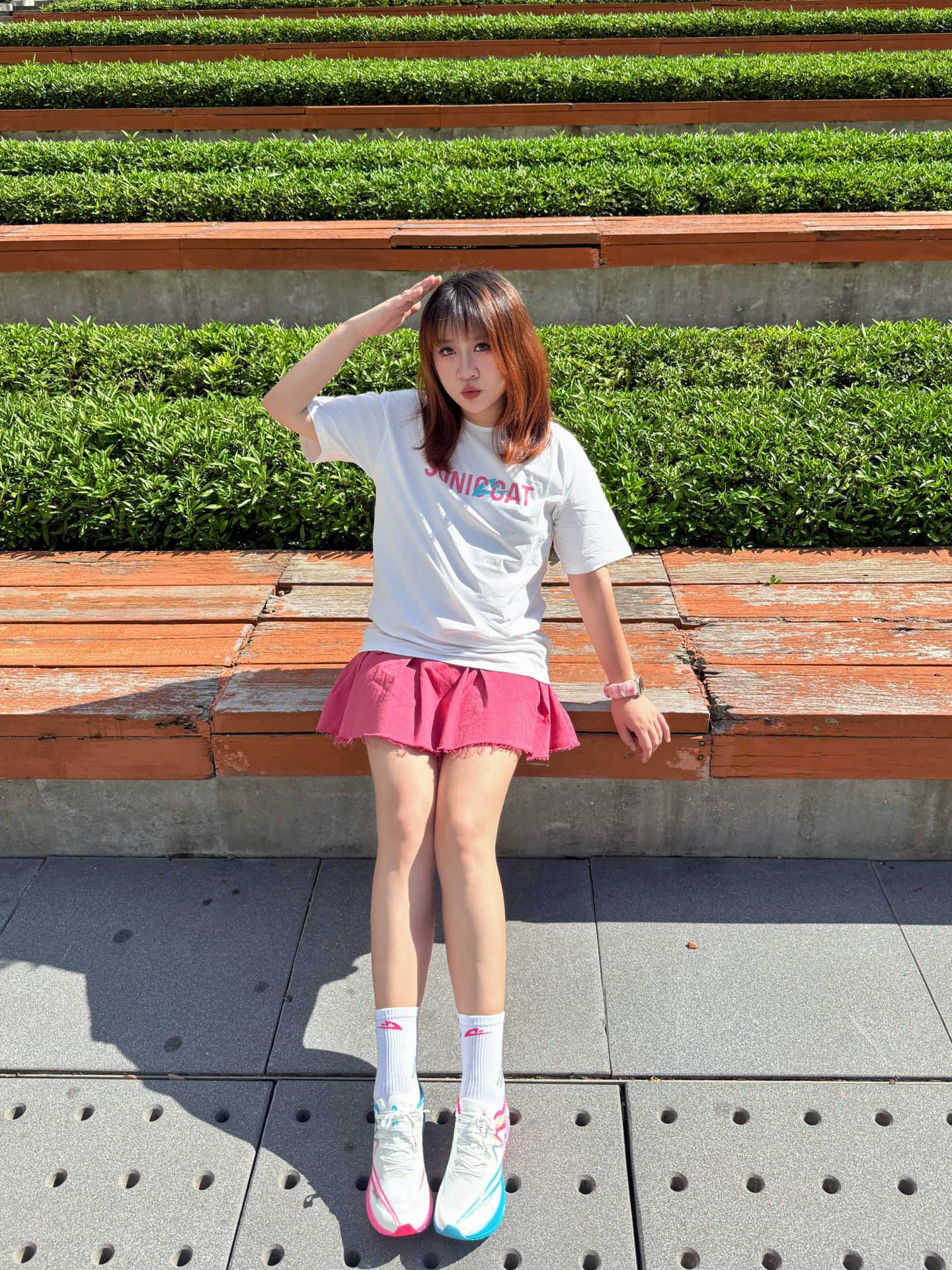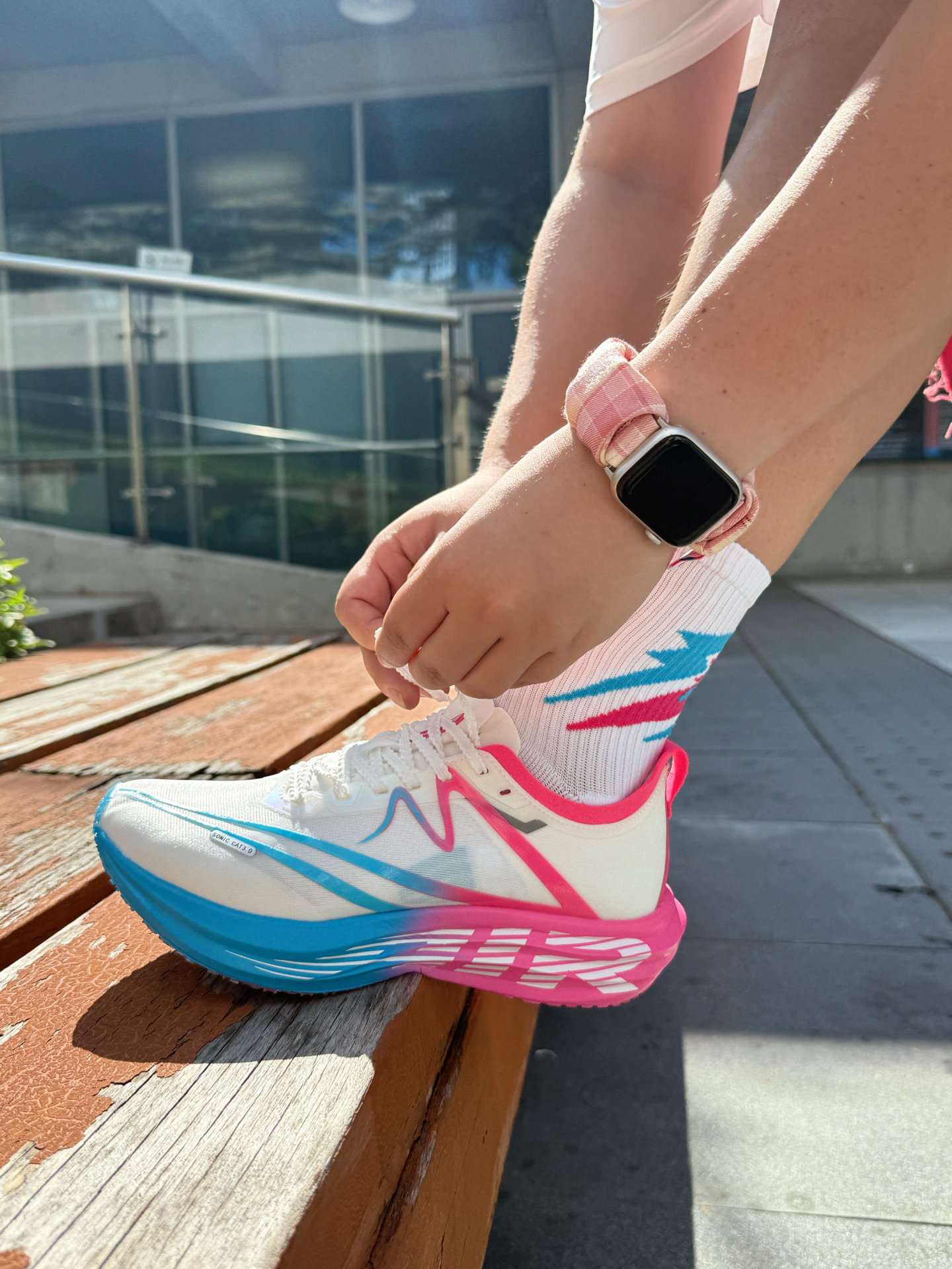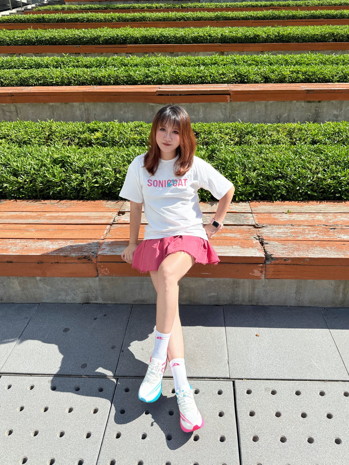 蹲在长椅边调整鞋带时风刚好掀起裙角—— 入秋第一套运动穿搭 「白粉蓝」彻底拿捏💫 / ▫️ 上衣:软fufu速干白T 胸前浅粉字母像偷偷盖的甜章🎀 不闷汗不贴背 抬手时连风都变轻了~ ▫️ 裙子:会呼吸的玫粉裙 长度运动正合适!走路带点小幅度~ ▫️ 灵魂C位:气垫碳板跑鞋 白是基底,粉是甜,蓝是灵—— 三色撞得像咬开颗水果糖🍬 低帮设计露脚踝 配短裙刚好显瘦! (悄悄说:体育生训练/体测/竞...