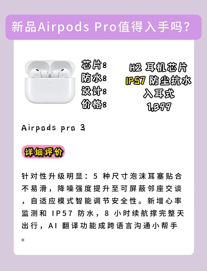本篇笔记关联了Apple/苹果 AirPods Pro3 入耳式 蓝牙耳机 多国语言实时翻译 运动健康监测功能 主动降噪 白色等商品,为用户提供真实的使用体验和购买参考。