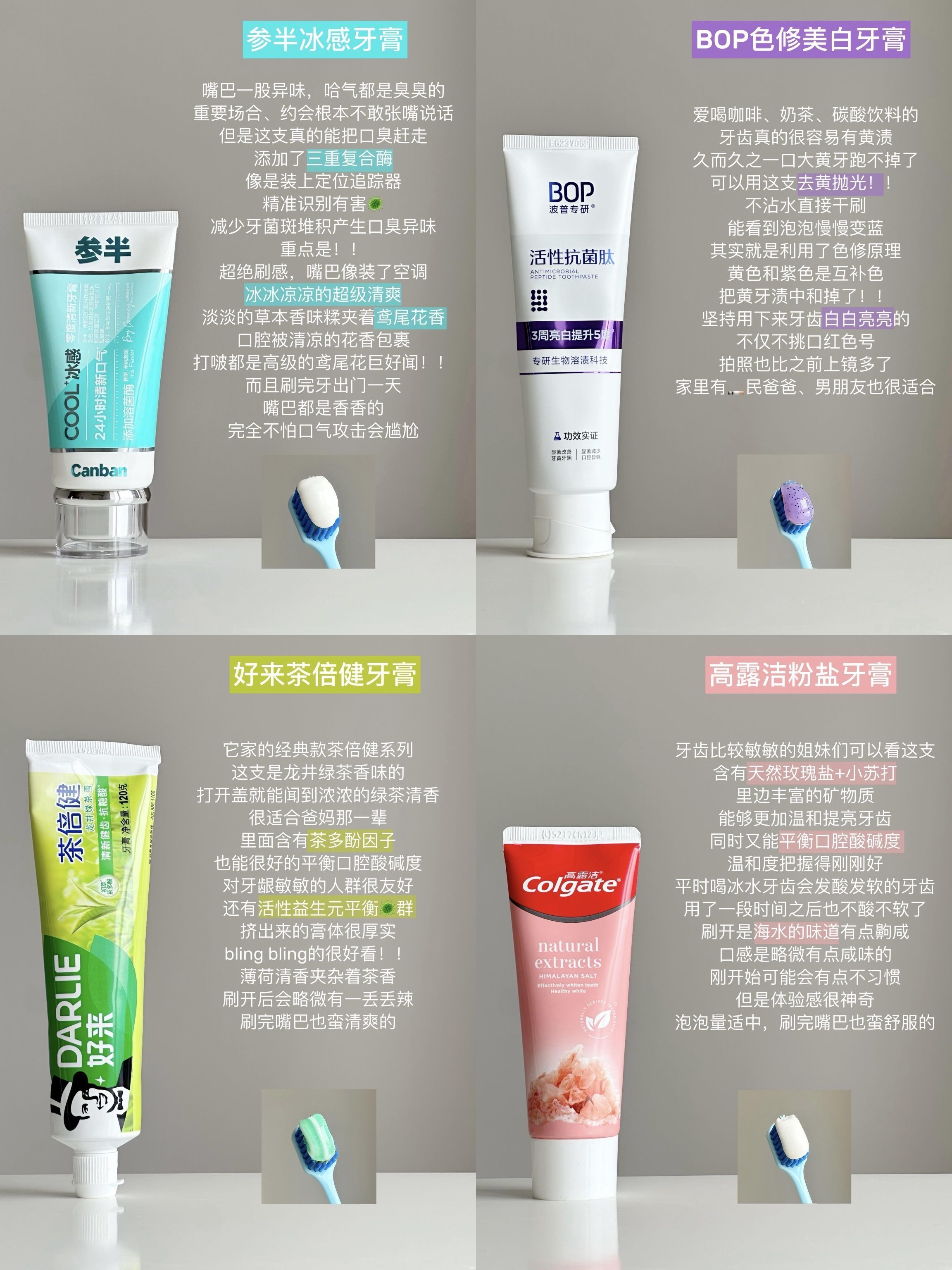 爱喝咖啡奶茶还爱吃重口味的小女孩真的要碎了! 牙黄不说嘴里还有一股味🤢 人前根本不敢张嘴说话 用了不下20款牙膏 才发现口腔问题更应该有针对性的解决 今天就来跟大家分享一下家里反复回购的4款火出圈的牙膏 大家按需求购买就好~ - 清单list: 🧊参半冰感牙膏 🟣BOP色修美白牙膏 💕高露洁粉盐牙膏 🍃好来茶倍健牙膏 #参半牙膏 #牙膏推荐 #牙膏测评 #参半零度清新牙膏#清新口气#BOP色修美白...