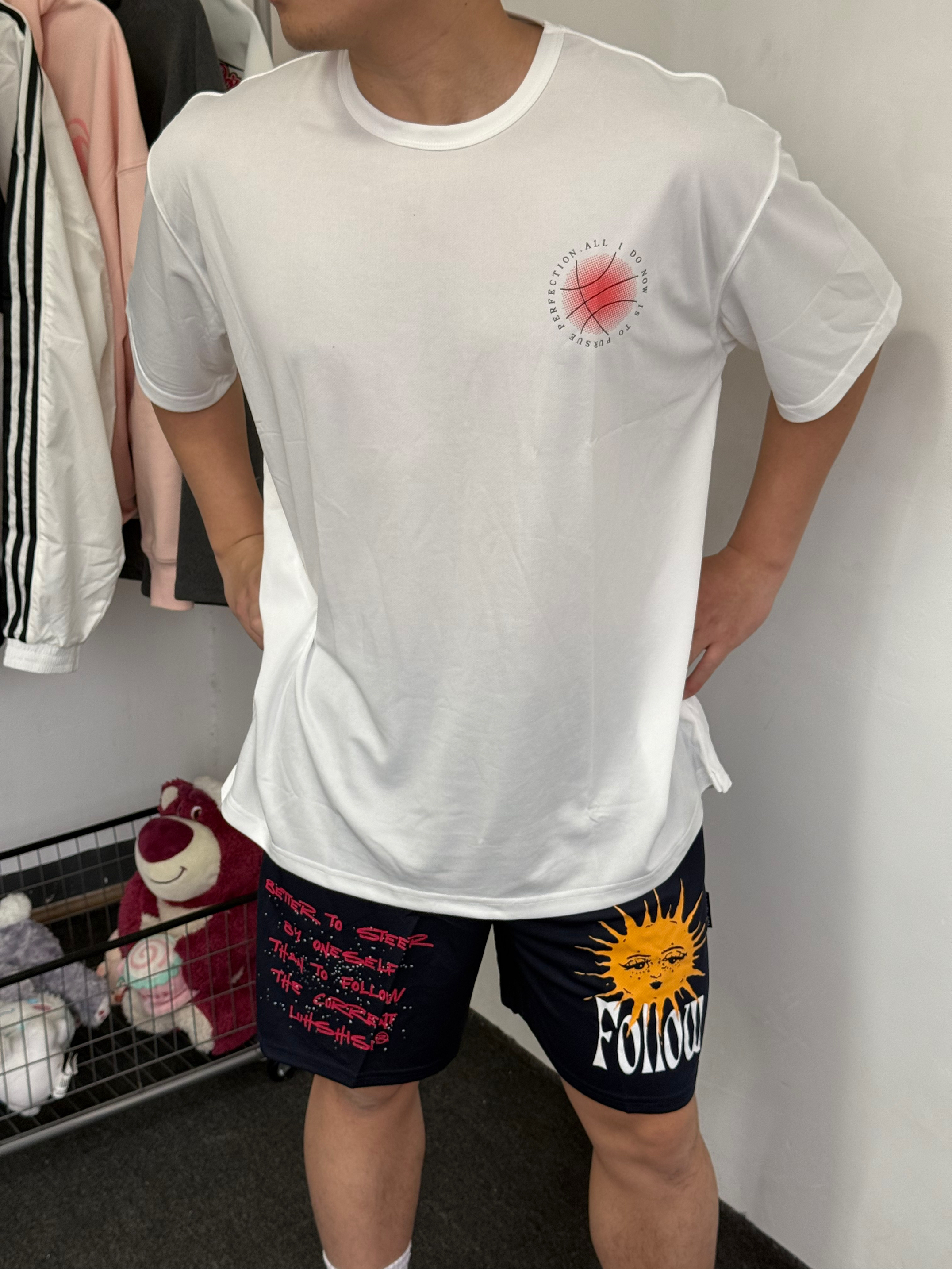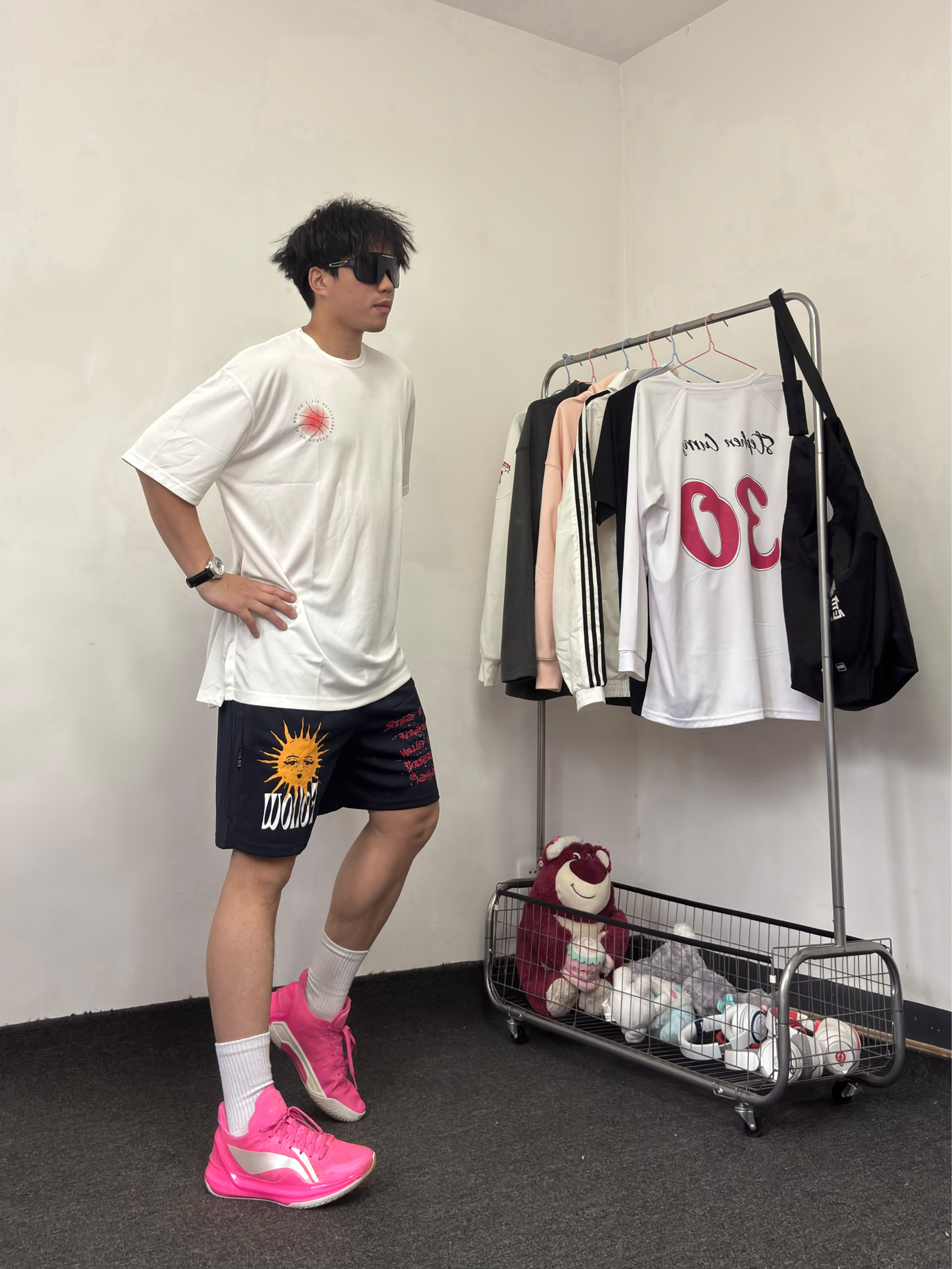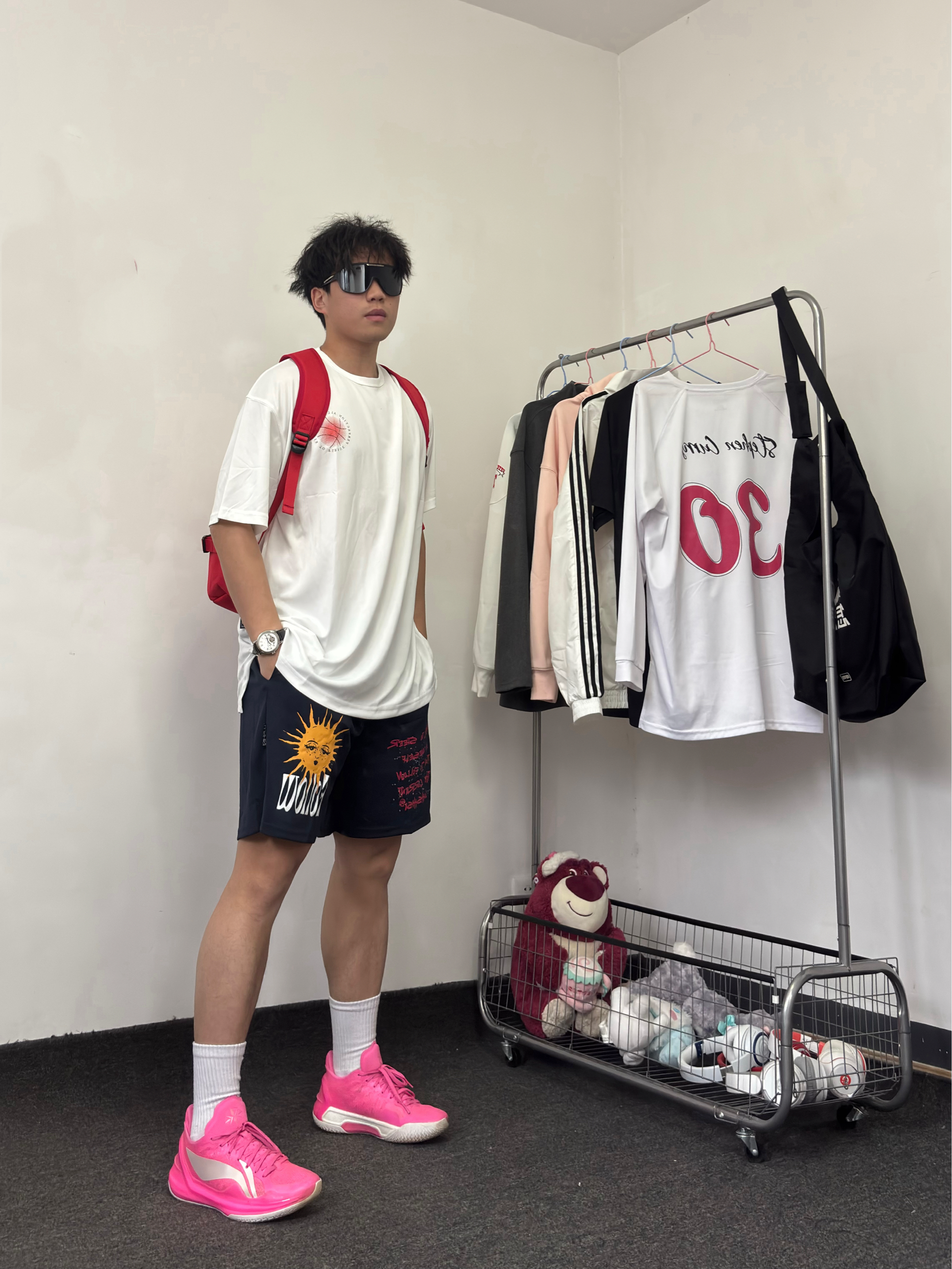 今天来一身白色的美式短袖 下身搭配一条深蓝色的短裤,一整套挺有美式风,再加上一双粉色的球鞋,你们觉得怎么样?