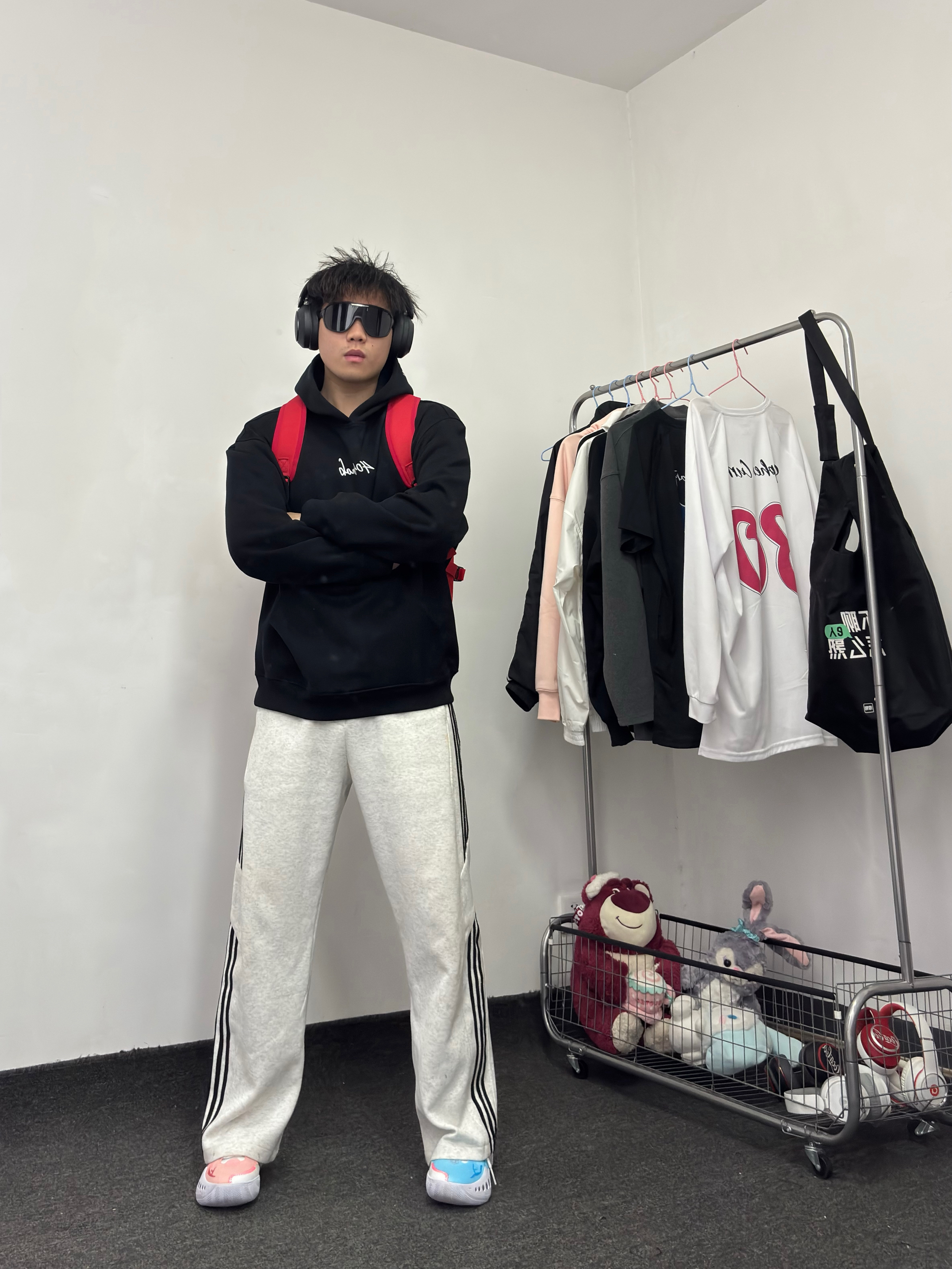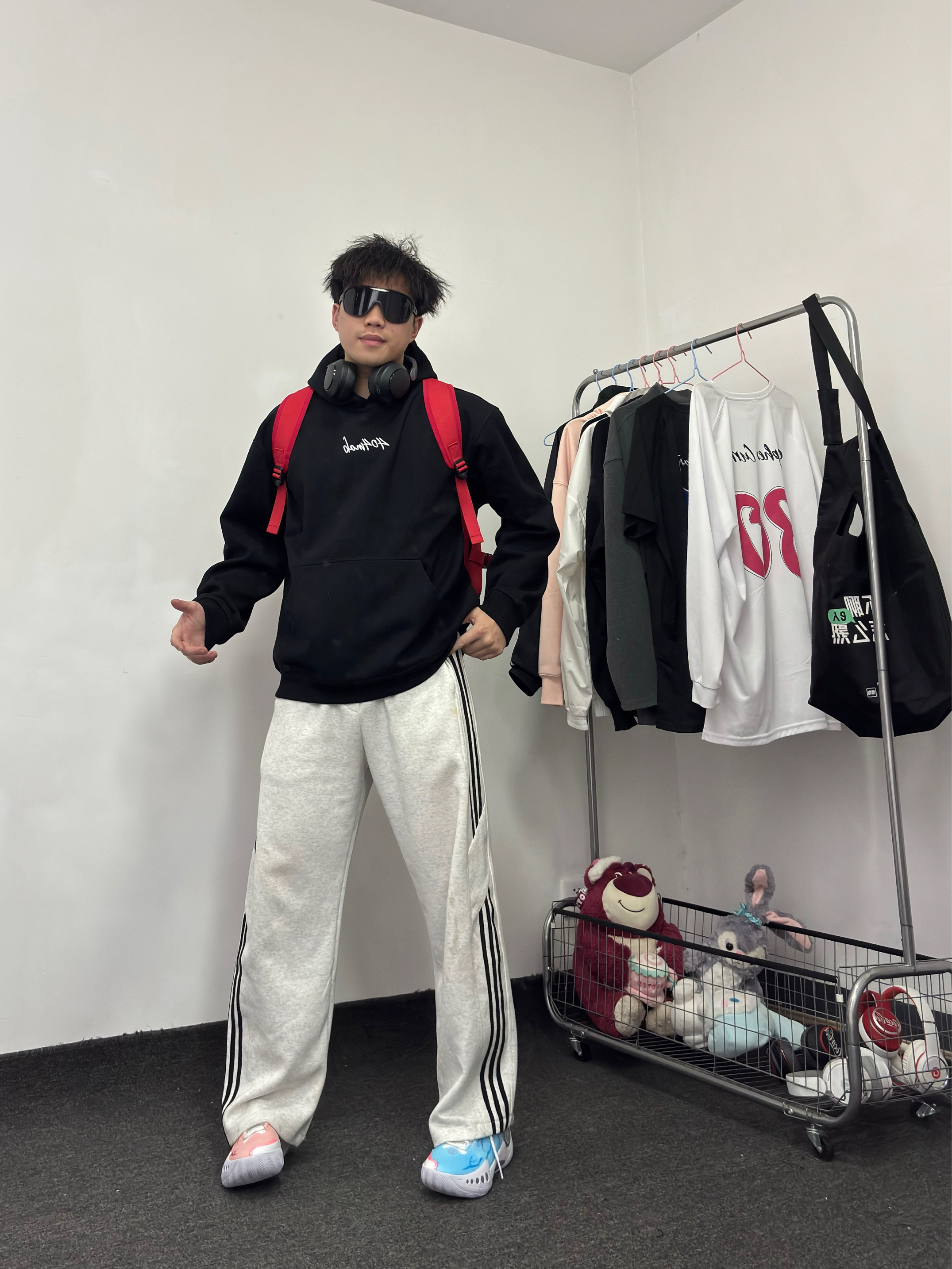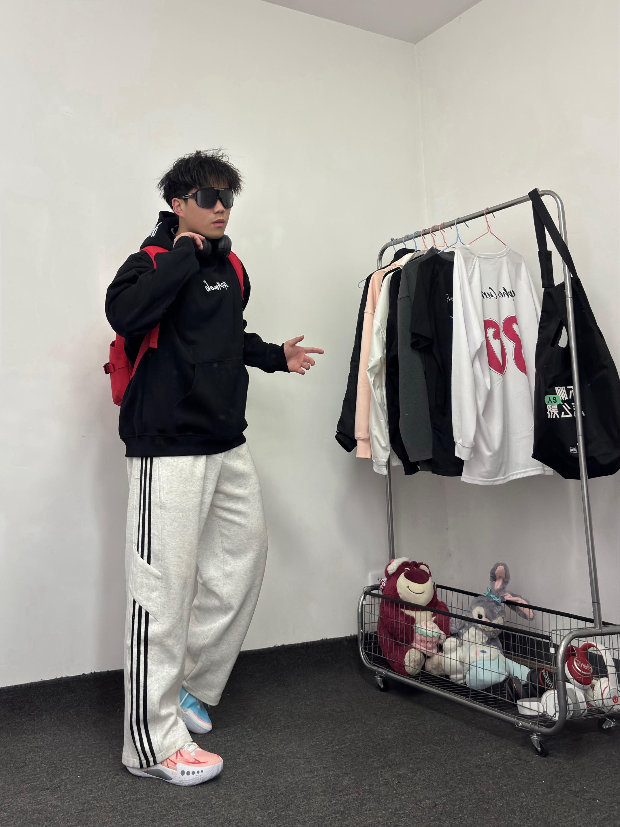 什么?不知道穿啥 就套一件黑色卫衣吧bro 纯色耐脏又百搭 套一条白色条纹裤 再搭配鸳鸯球鞋挺酷~