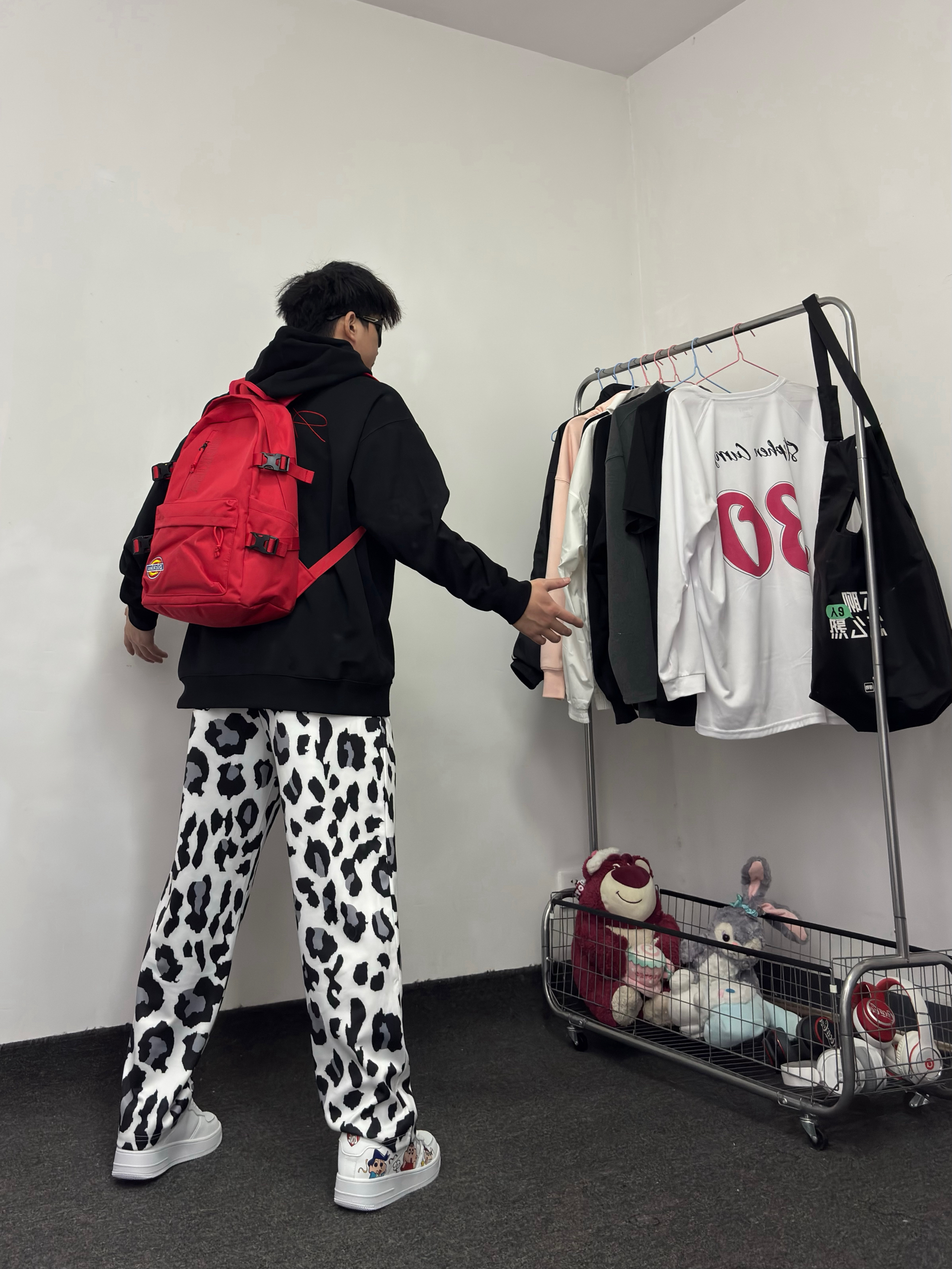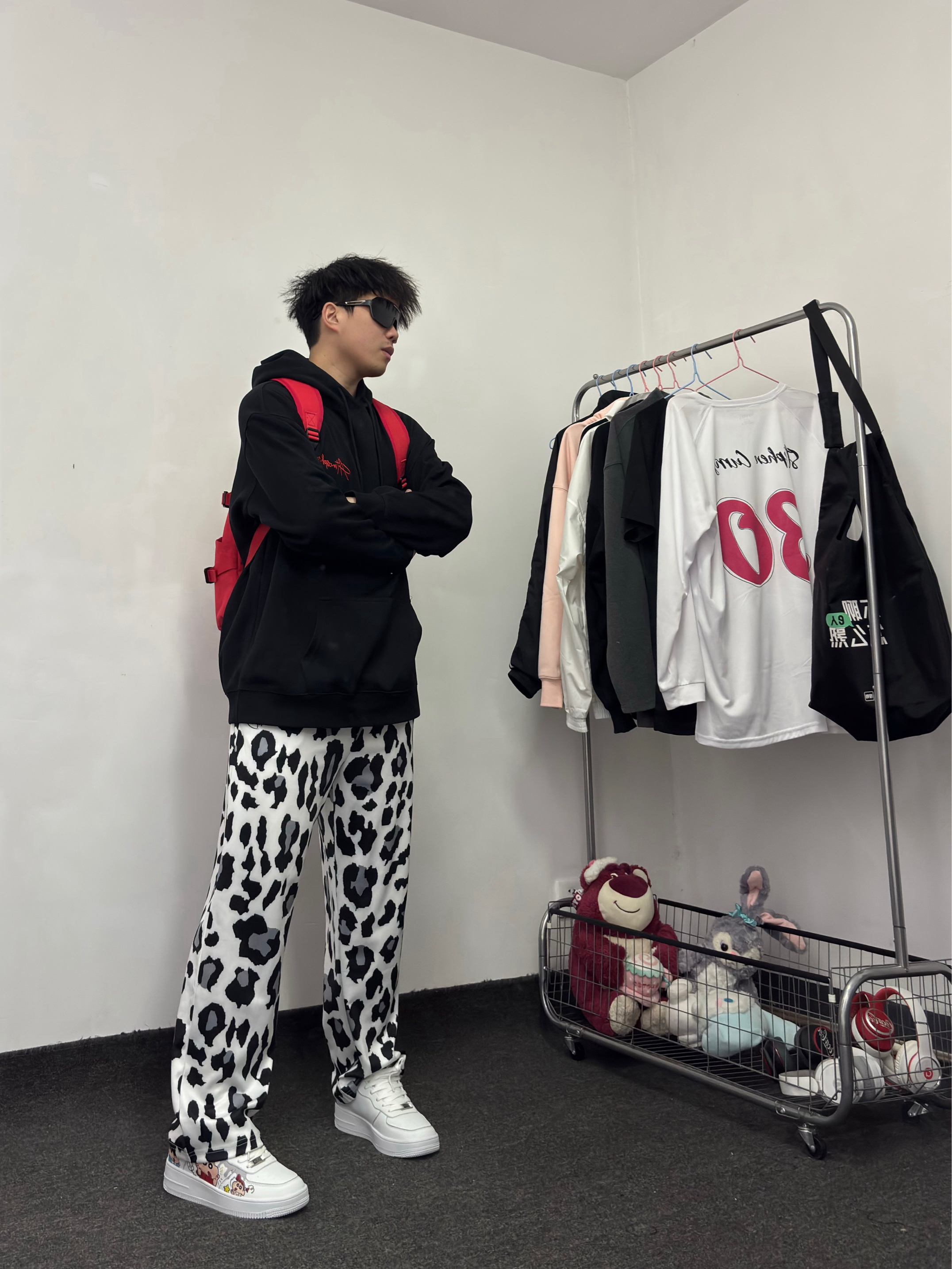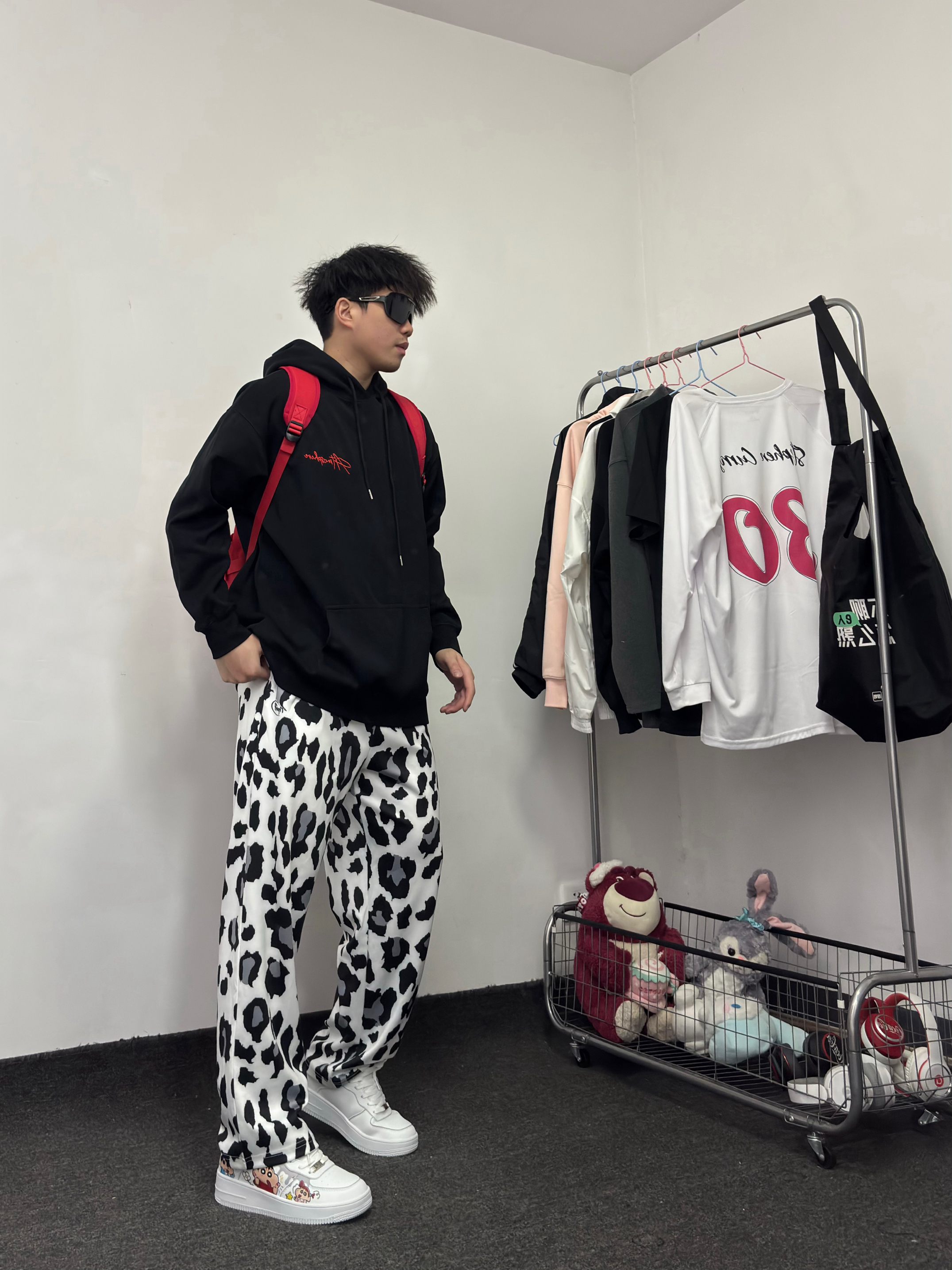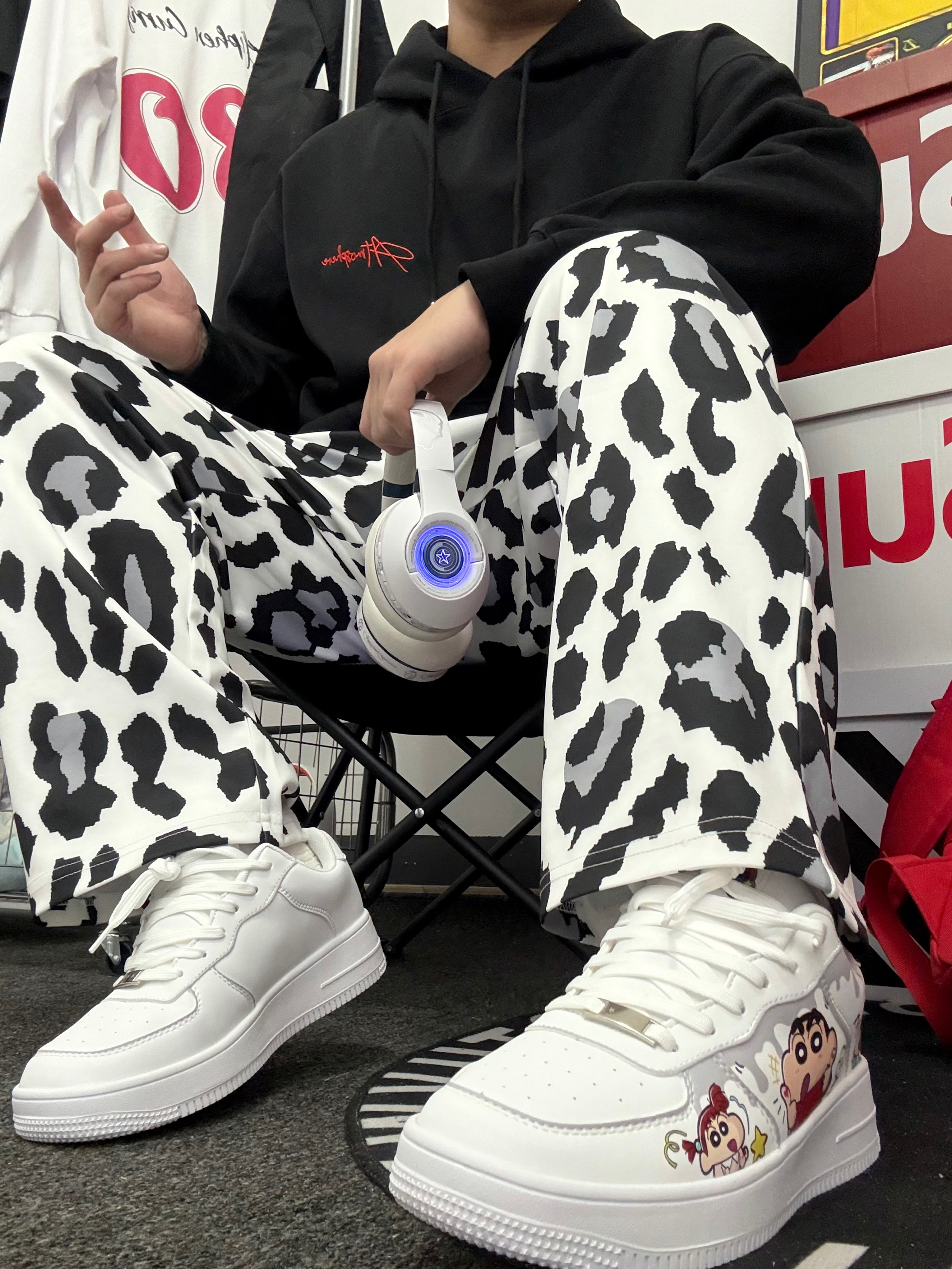 哈哈今天又是黑色卫衣身上穿 黑红色挺有美式风格 下身搭配一条豹纹长裤 一整套又帅又能打