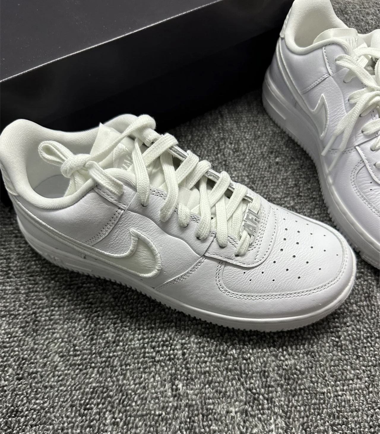 颜值没的说 《好》 也算是穿上倒钩😊 1️⃣口舌 后跟的Logo都是反着的 谁懂!还蛮喜欢这种不按常理来的感觉2️⃣侧面大钩子做成刺绣工艺 还不错3️⃣扣子从一个小方牌做成AF1字母 整体质感真的拉满了