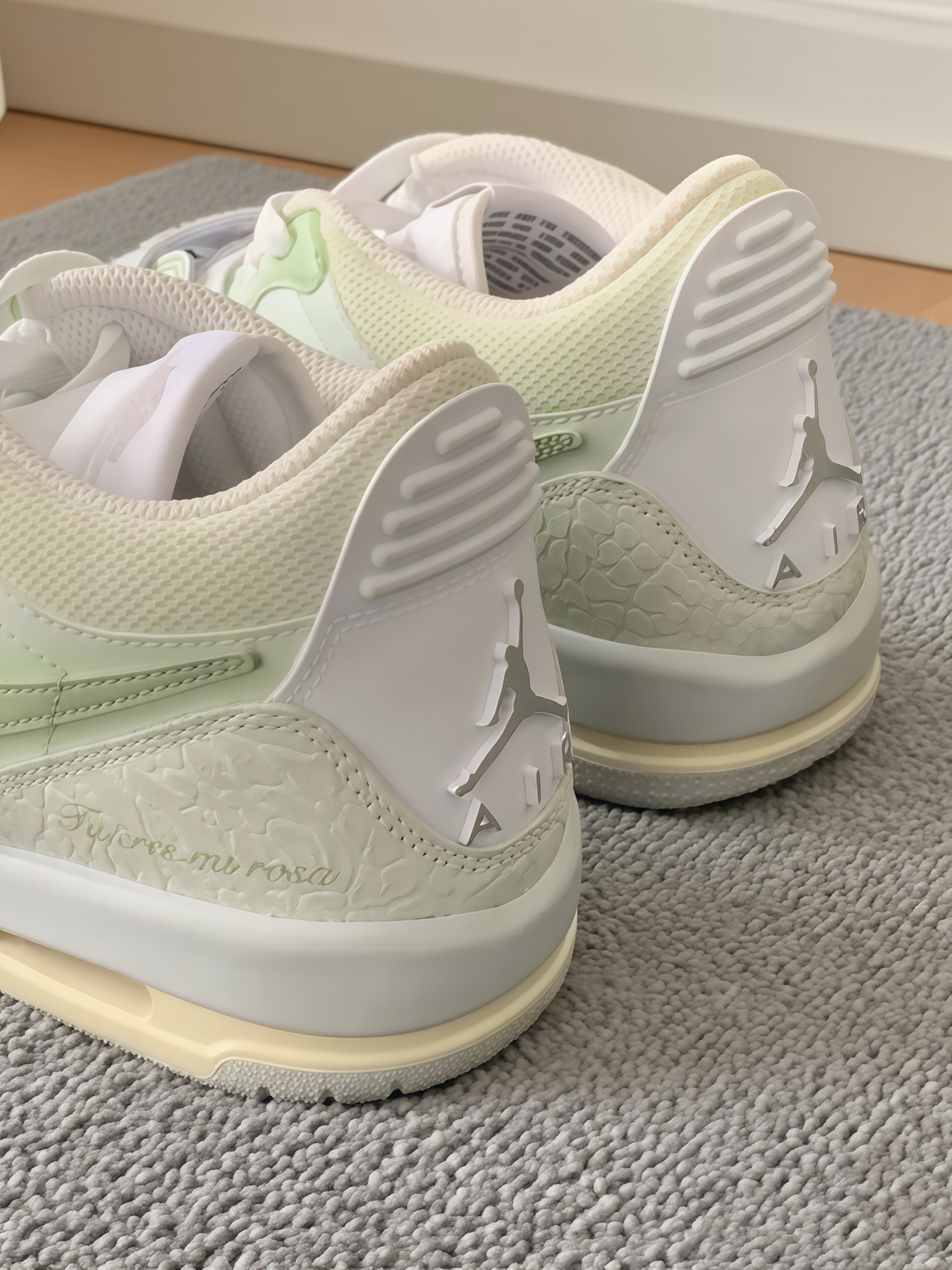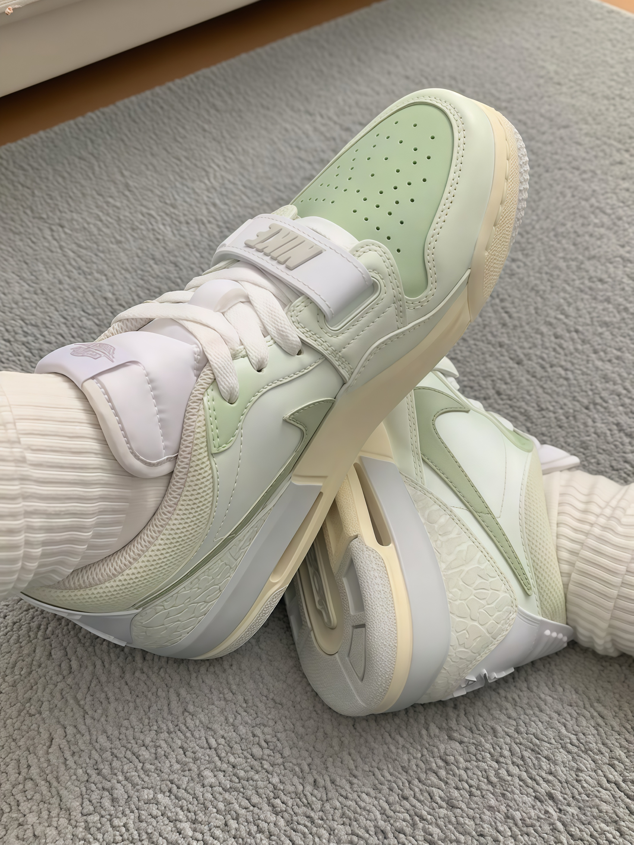 我终于拥有这双超美的AJ啦!拿到手就被它清新的淡绿色系戳中,不同层次的绿搭配得恰到好处,还有那精致的纹理,细节感直接拉满。 上脚试了下,脚感太舒服了,包裹性很强,走起来稳稳的,像踩在云朵上似的。而且这颜色太百搭了,我搭了下牛仔裤,很休闲;又很有青春活力的感觉。现在每天都想穿着它出门,真的越看越喜