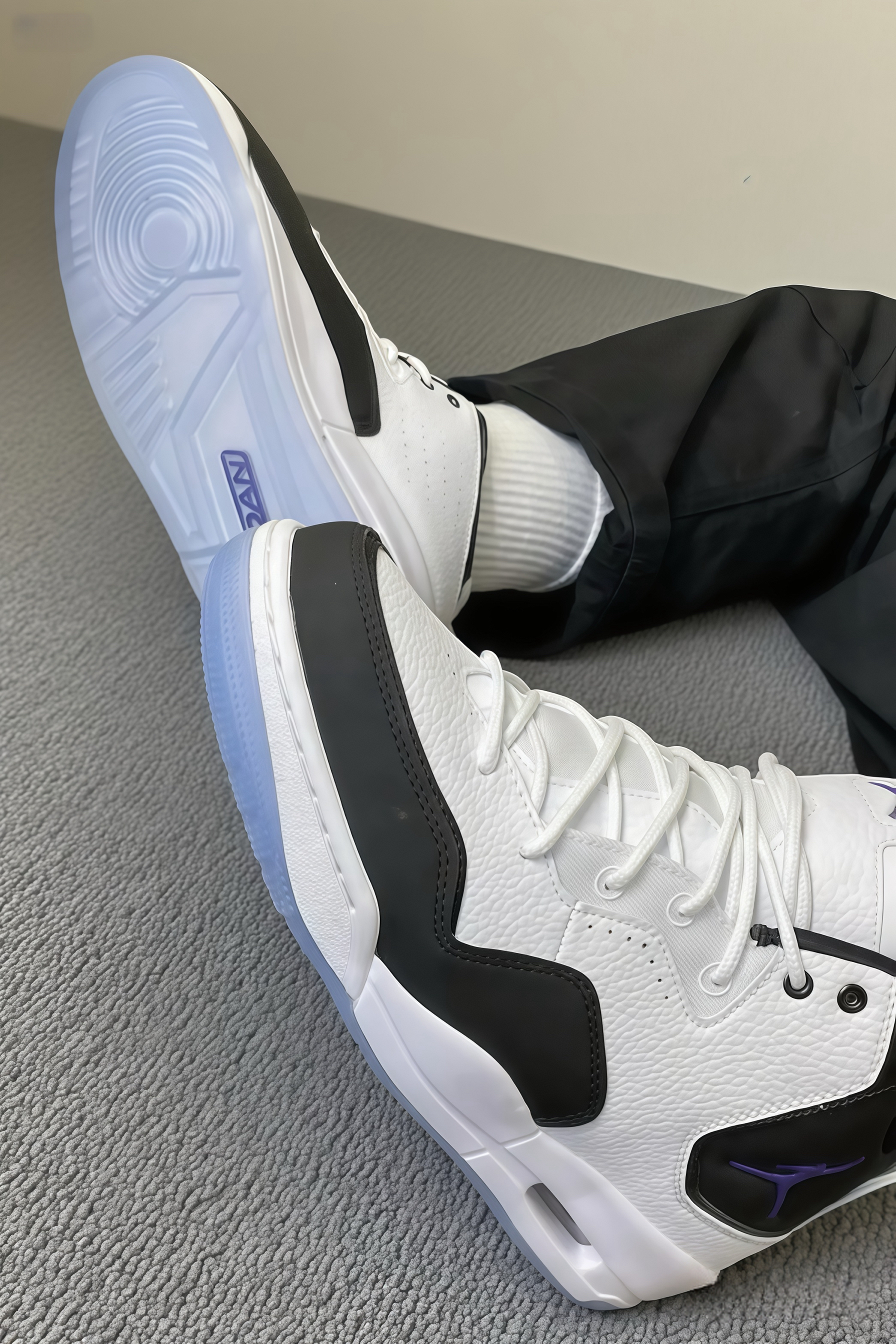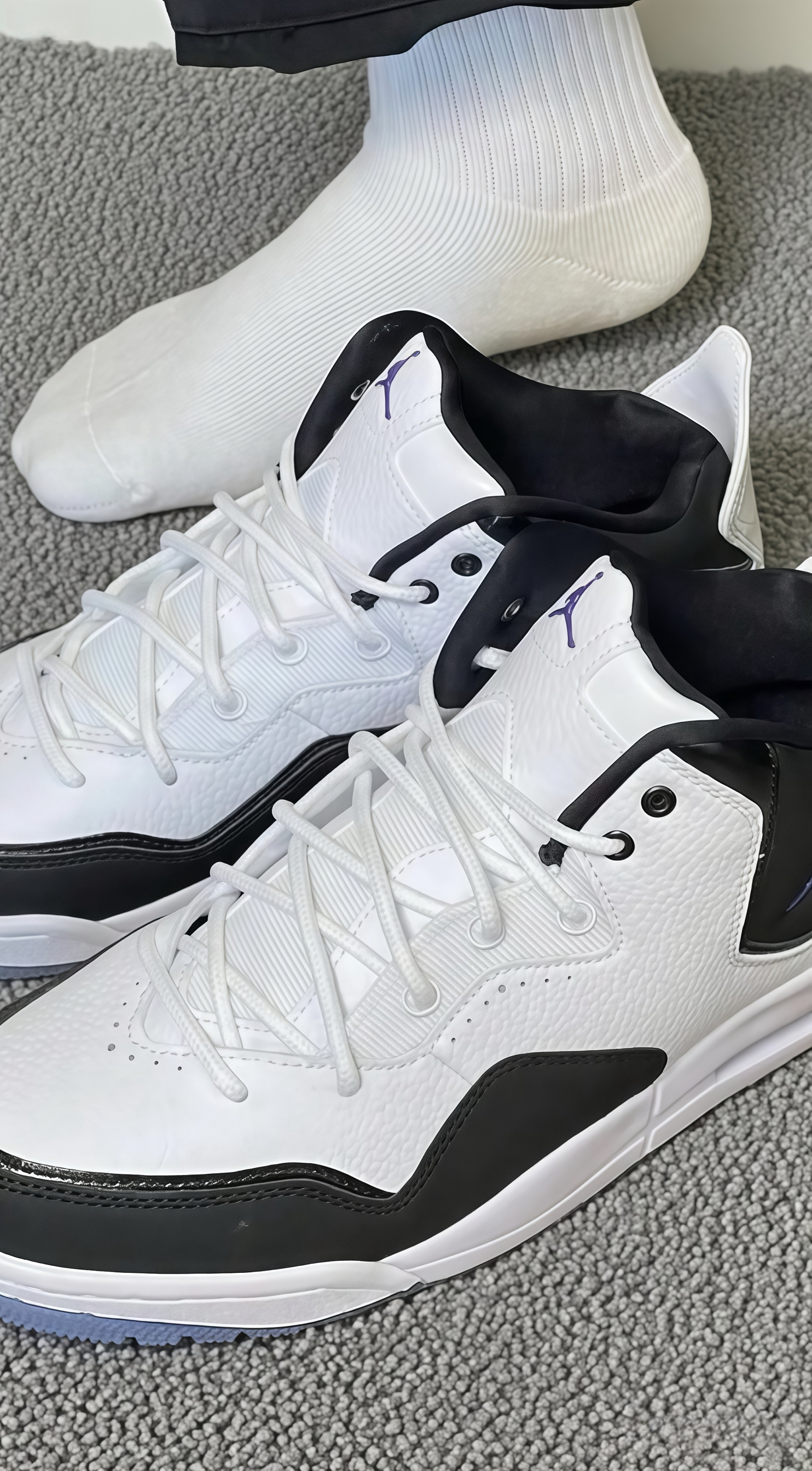 咱就是说,这双Jordan鞋真的长在我审美点上!白黑主调,搭配紫色飞人标,简约又有亮点,质感绝了。上脚特别舒服,包裹性好,走路久了也不累。搭配黑裤子,一整个高级住,街头感拉满。每次穿都觉得自己超酷,真的很爱这种随性又有范儿的感觉~