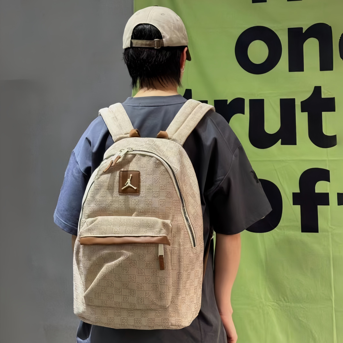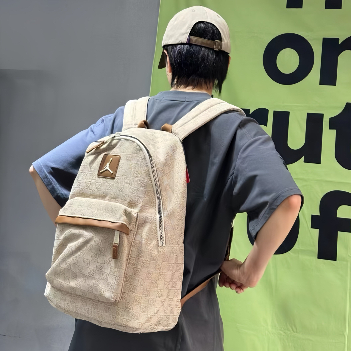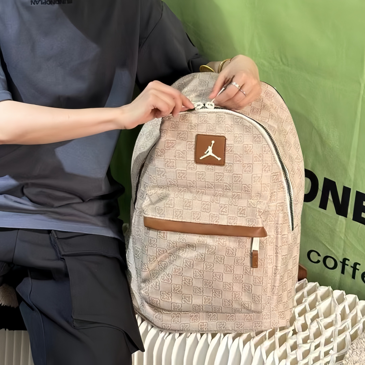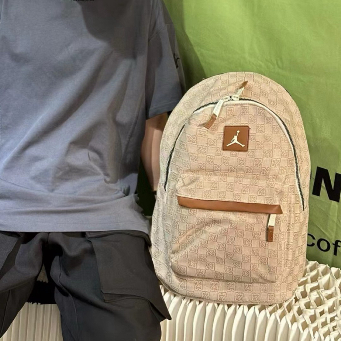 开学后的日常📸 这个浅棕老花的Jordan双肩包真的是近期心头爱~首先摸起来是那种有质感的面料,不是轻飘飘的,上面的老花图案加上飞人标,复古感一下子就出来了,而且皮质的小细节做得很精致。 容量我真的要夸!看着是那种很日常的大小,但实际巨能装。我装了课本、平板,甚至塞了件薄外套都还有空间。昨天看到一个男生背同款,听他和朋友说装篮球鞋和球衣也没问题,果然是男女都能背的款,情侣背估计也很搭~ 肩带...
