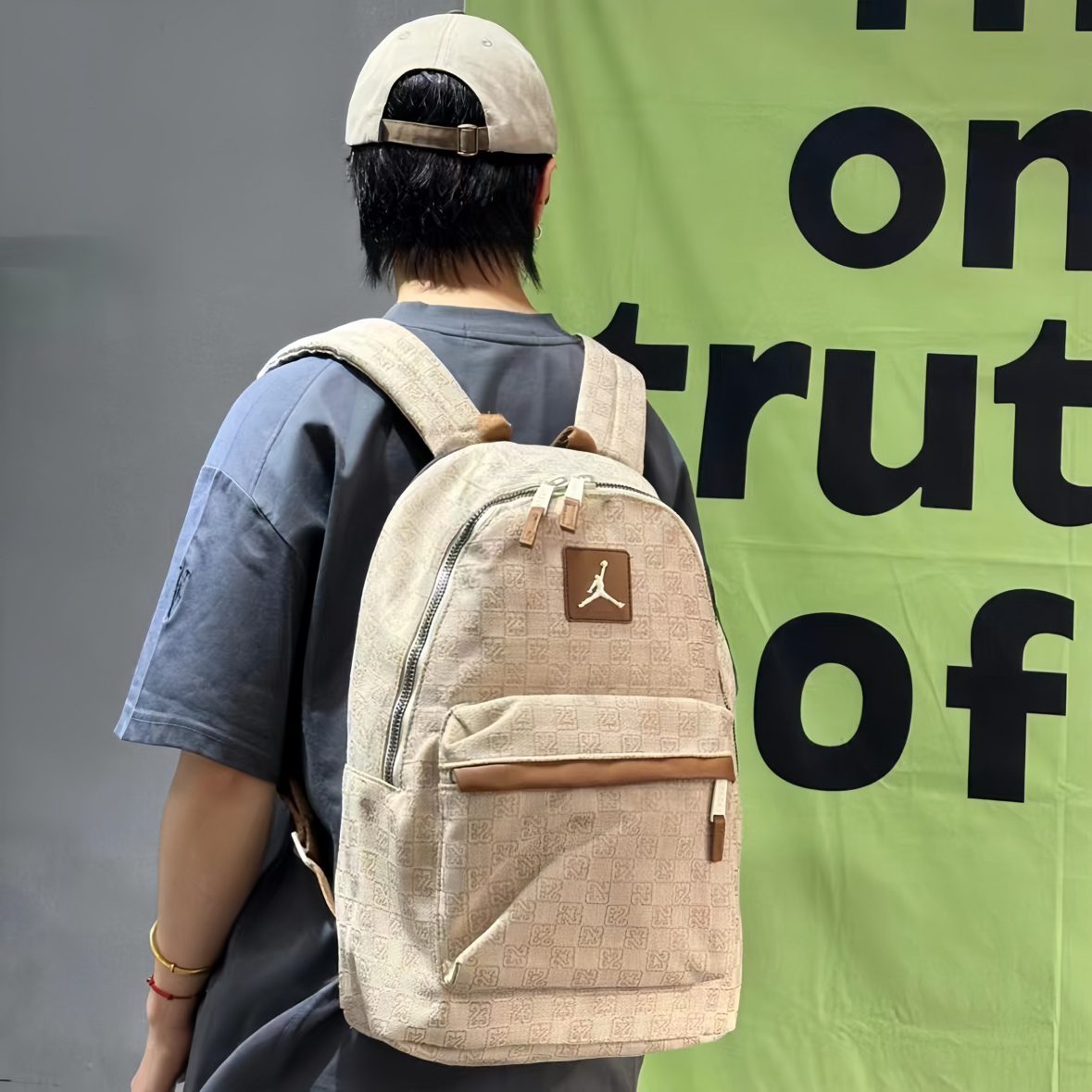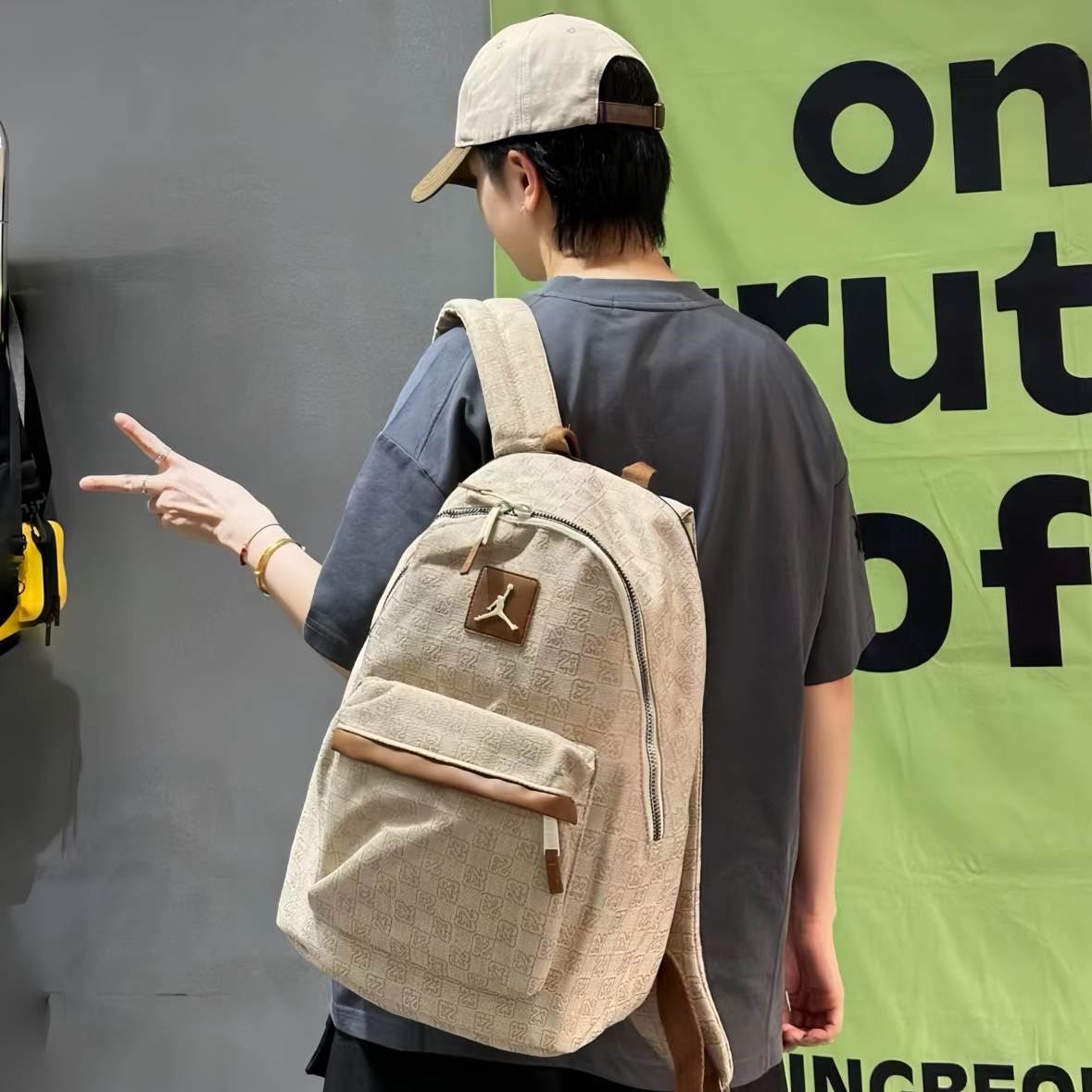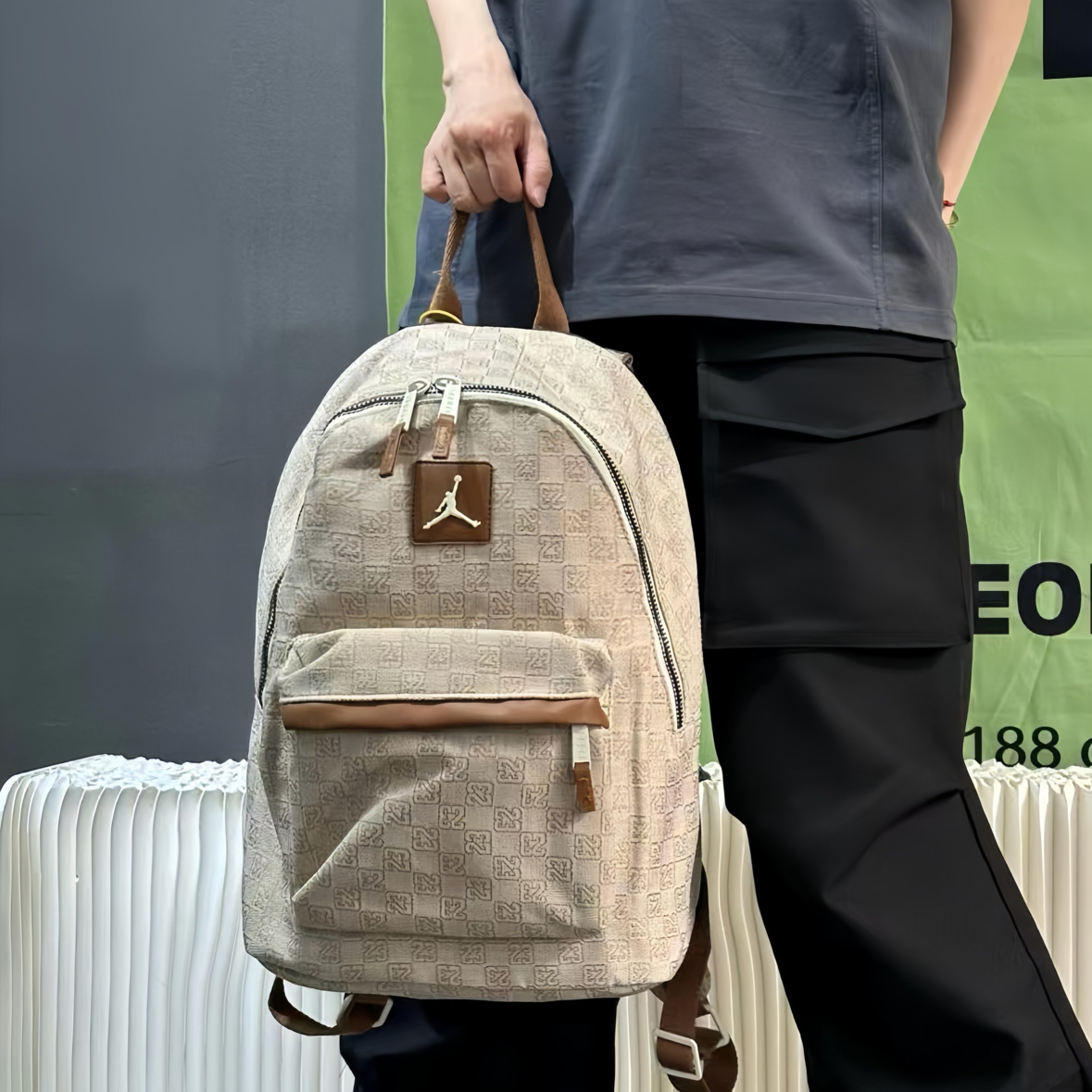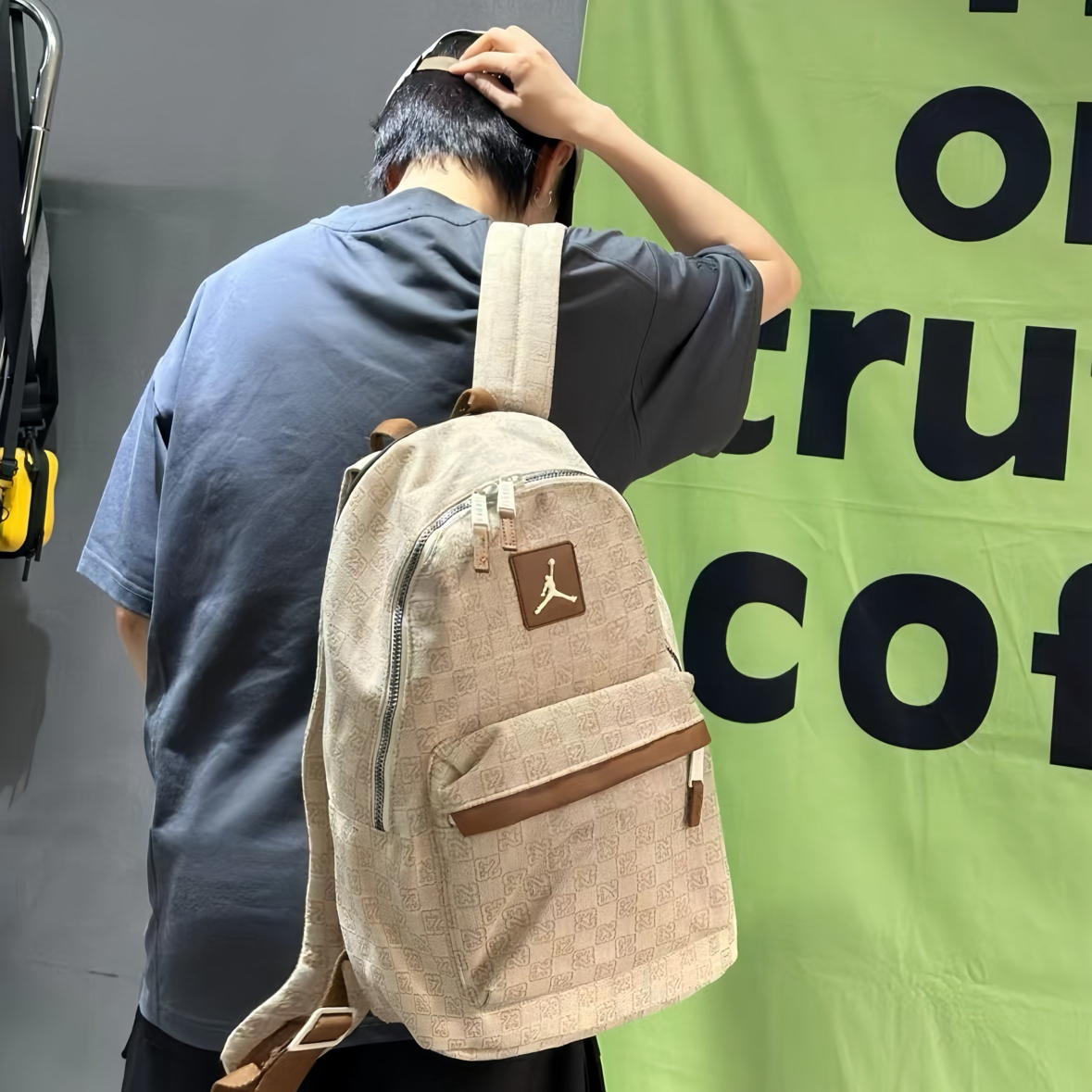 开学后的日常📸 这个浅棕老花的Jordan双肩包真的是近期心头爱~首先摸起来是那种有质感的面料,不是轻飘飘的,上面的老花图案加上飞人标,复古感一下子就出来了,而且皮质的小细节做得很精致。 容量我真的要夸!看着是那种很日常的大小,但实际巨能装。我装了课本、平板,甚至塞了件薄外套都还有空间。昨天看到一个男生背同款,听他和朋友说装篮球鞋和球衣也没问题,果然是男女都能背的款,情侣背估计也很搭~ 肩带...
