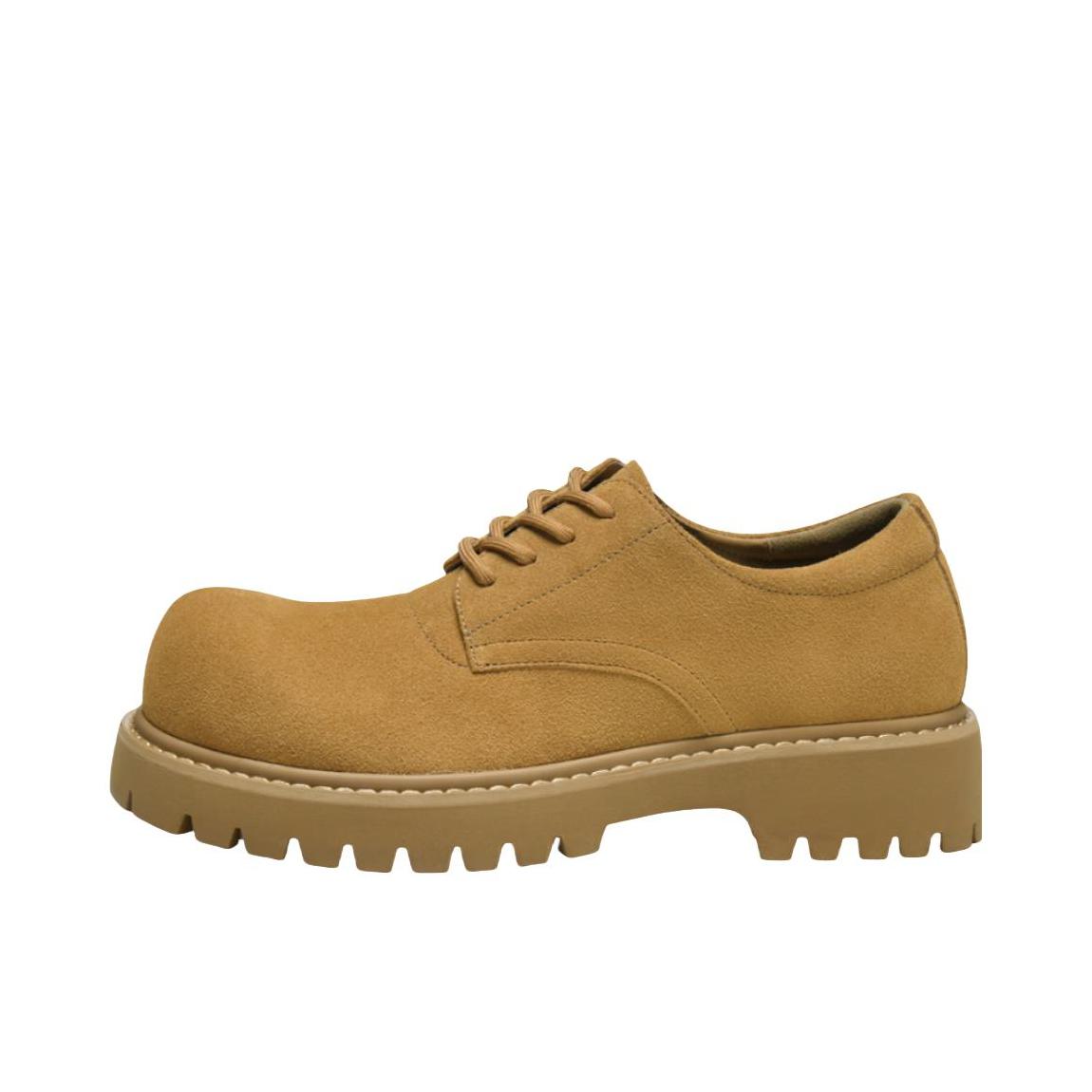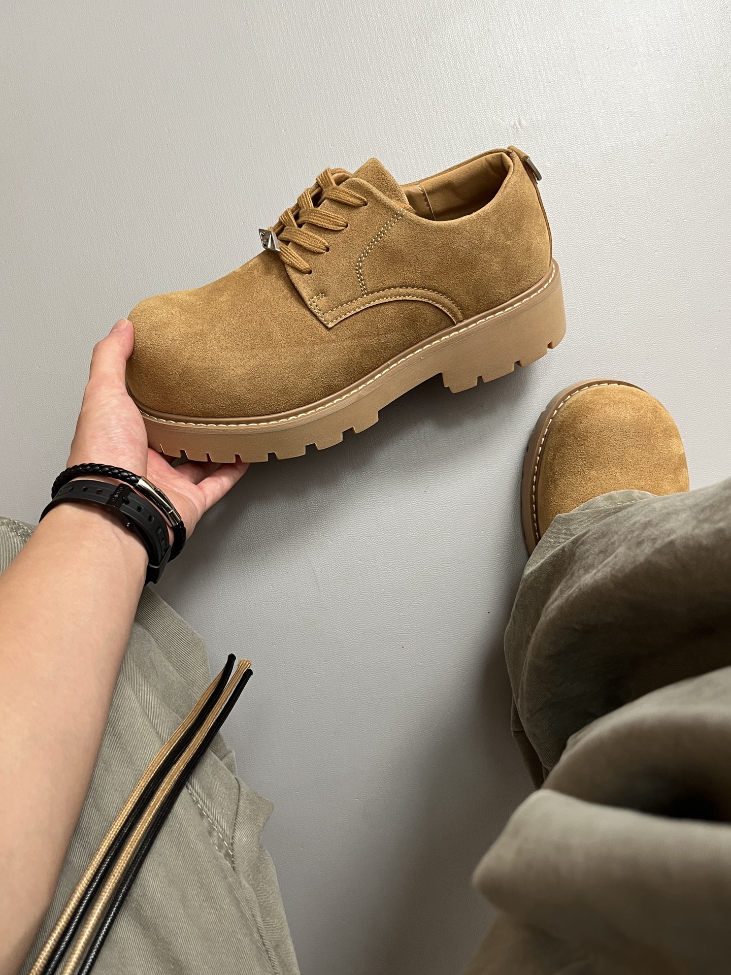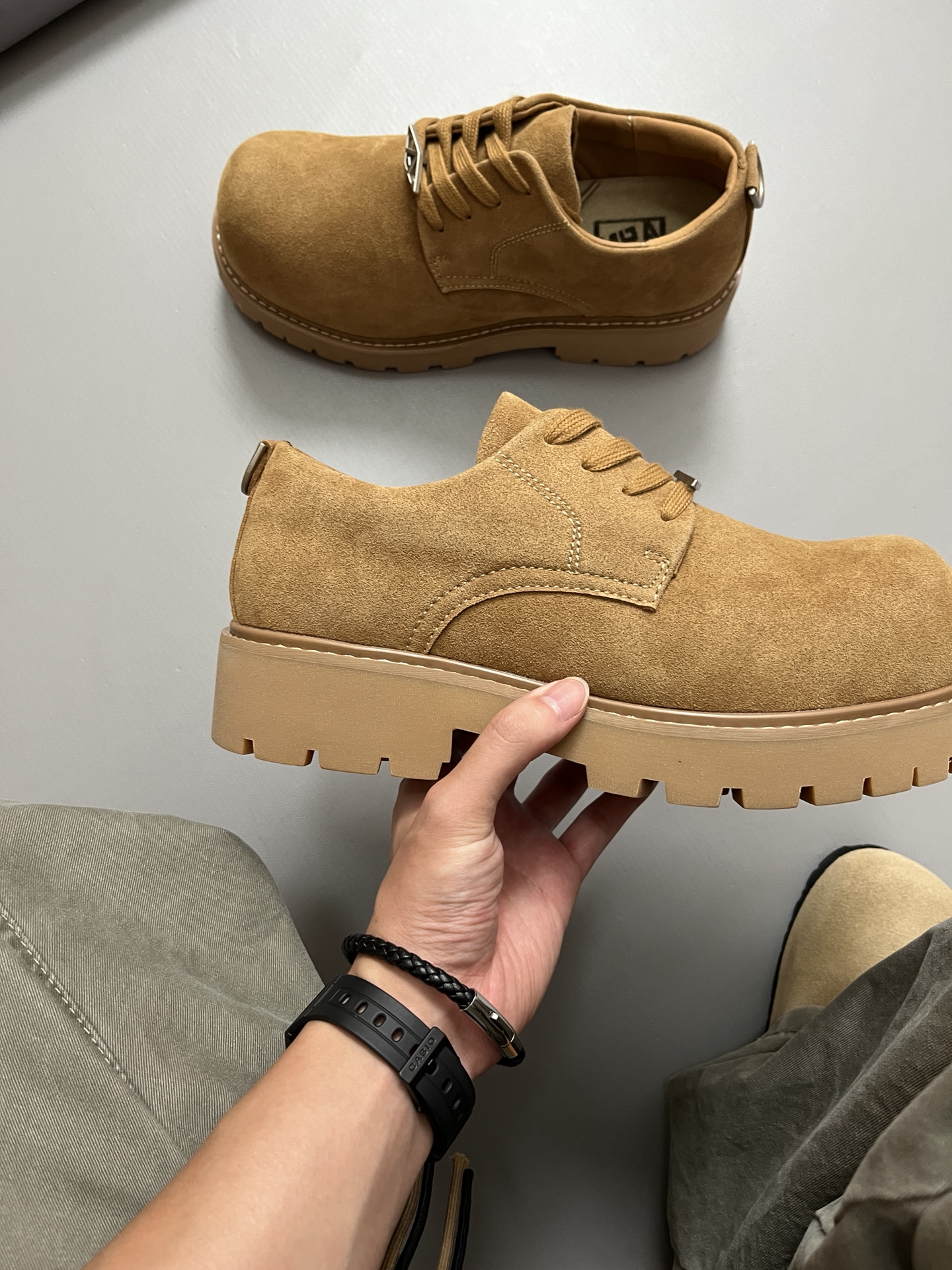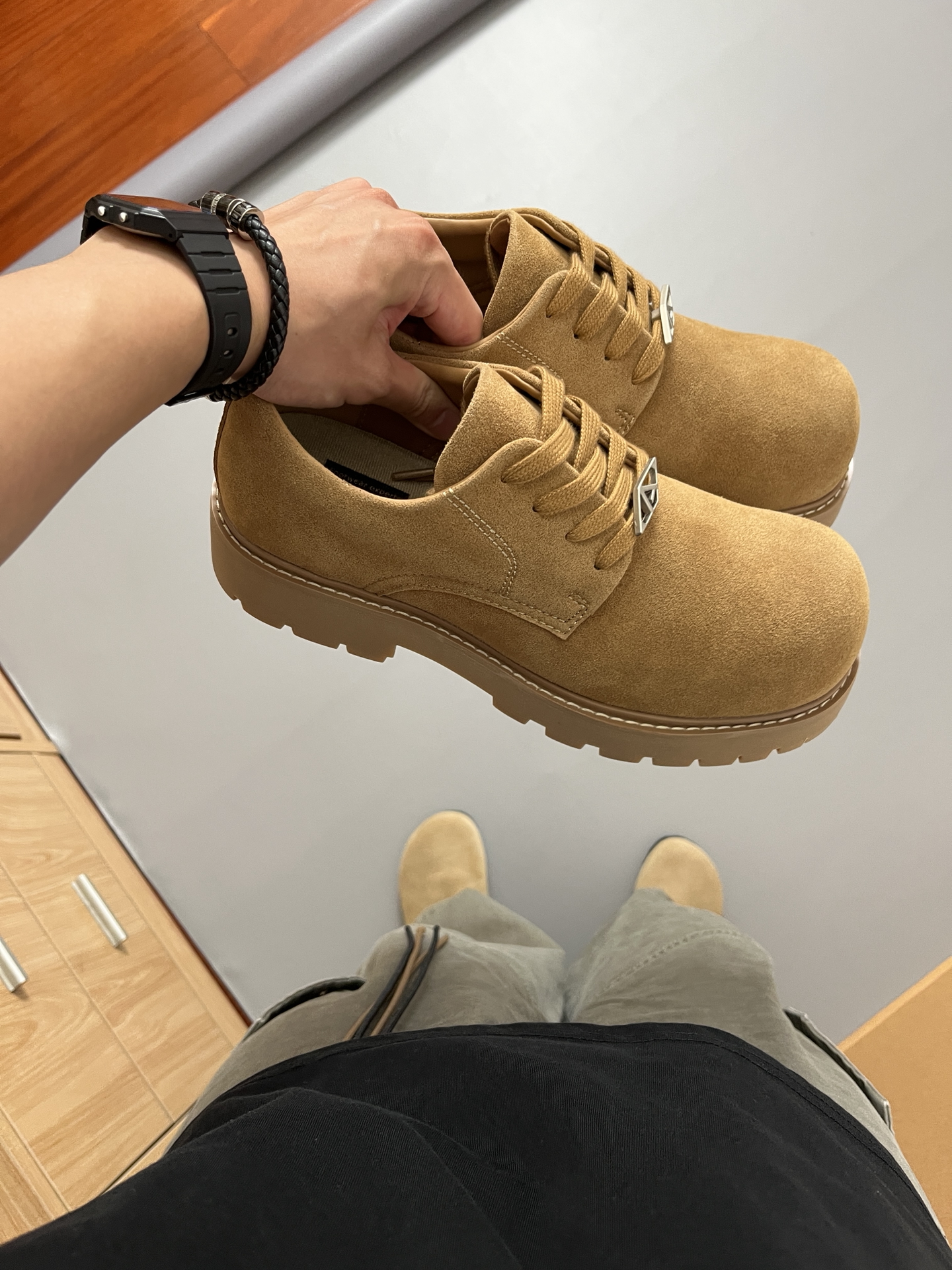 上脚 #MR.A 家的德比靴,尊嘟不想脱下来了! ✅复古做旧的棕色麂皮配上3cm厚底,视觉上直接拉长腿线!鞋头是圆润的工装设计,配牛仔裤👖瞬间美式复古感拉满,搭西裤居然也能穿出利落感,完全打破我对工装靴的刻板印象。🤔 ✅鞋面的磨砂皮摸起来软乎乎的,连鞋眼都是黄铜的,下雨天也不怕生锈。实测防水性不错,👌橡胶底在瓷砖上也不打滑。 ✅现在每天通勤直接套上它,配条直筒牛仔裤就能出门,连搭配都省了。这...