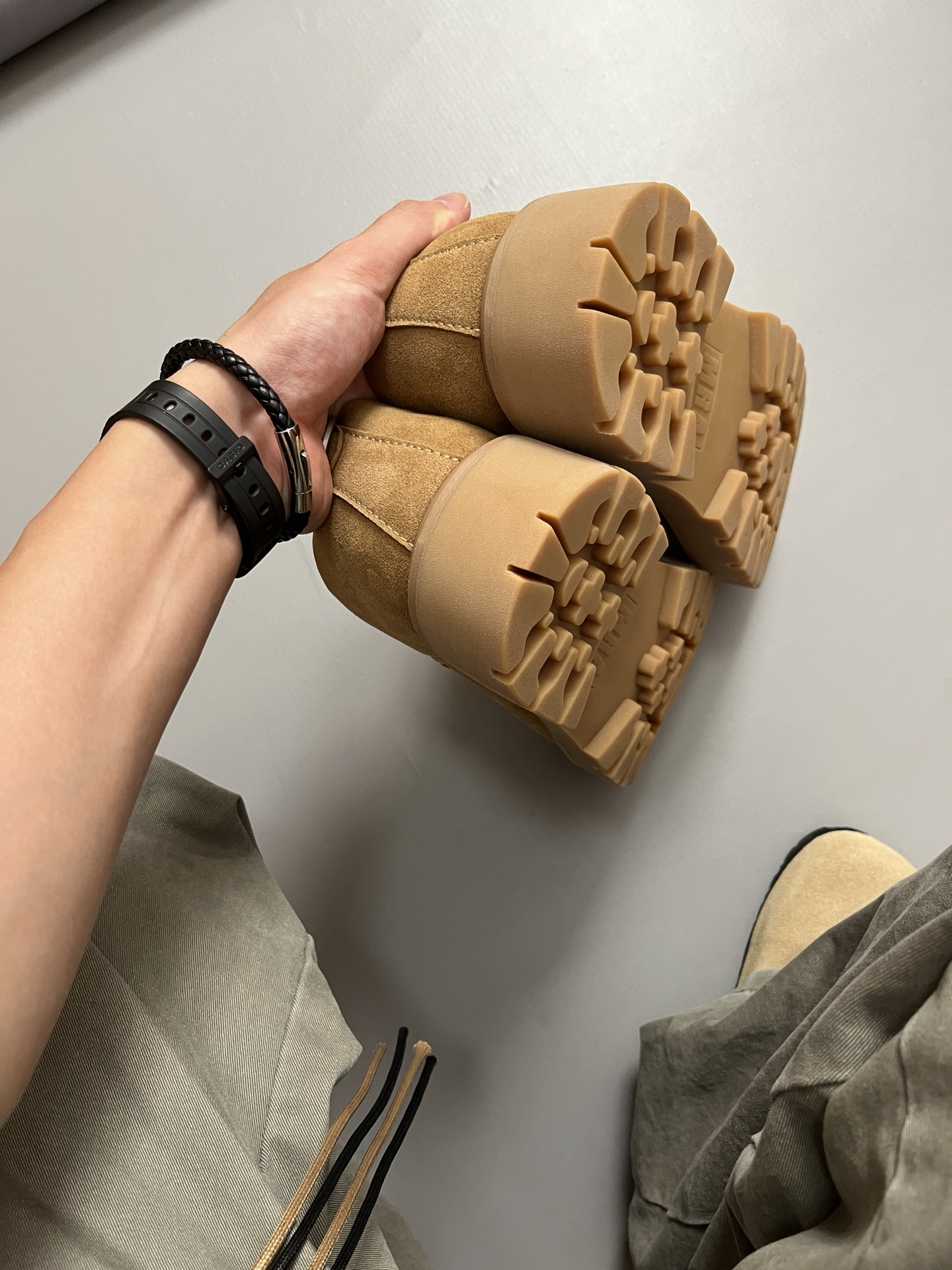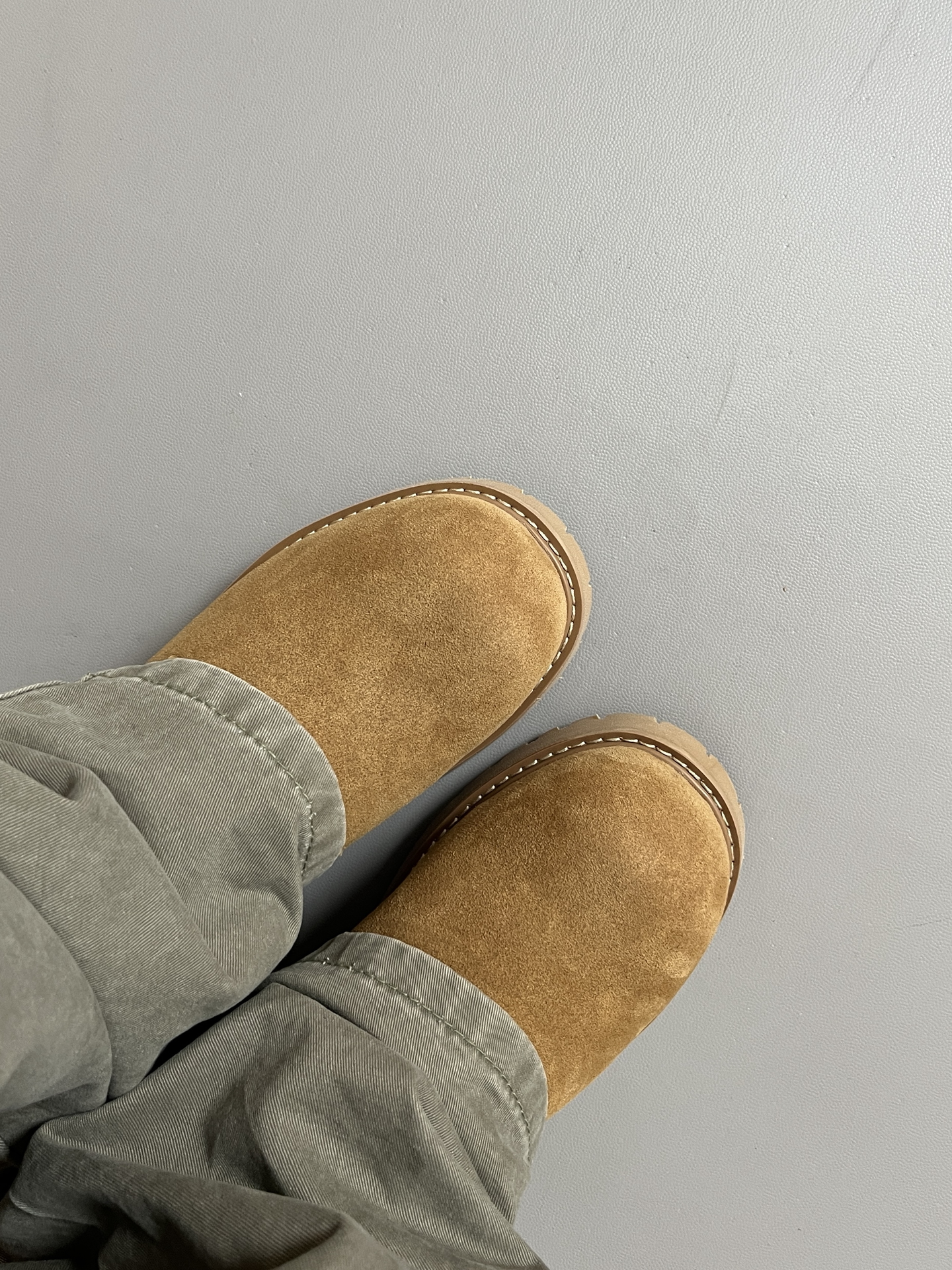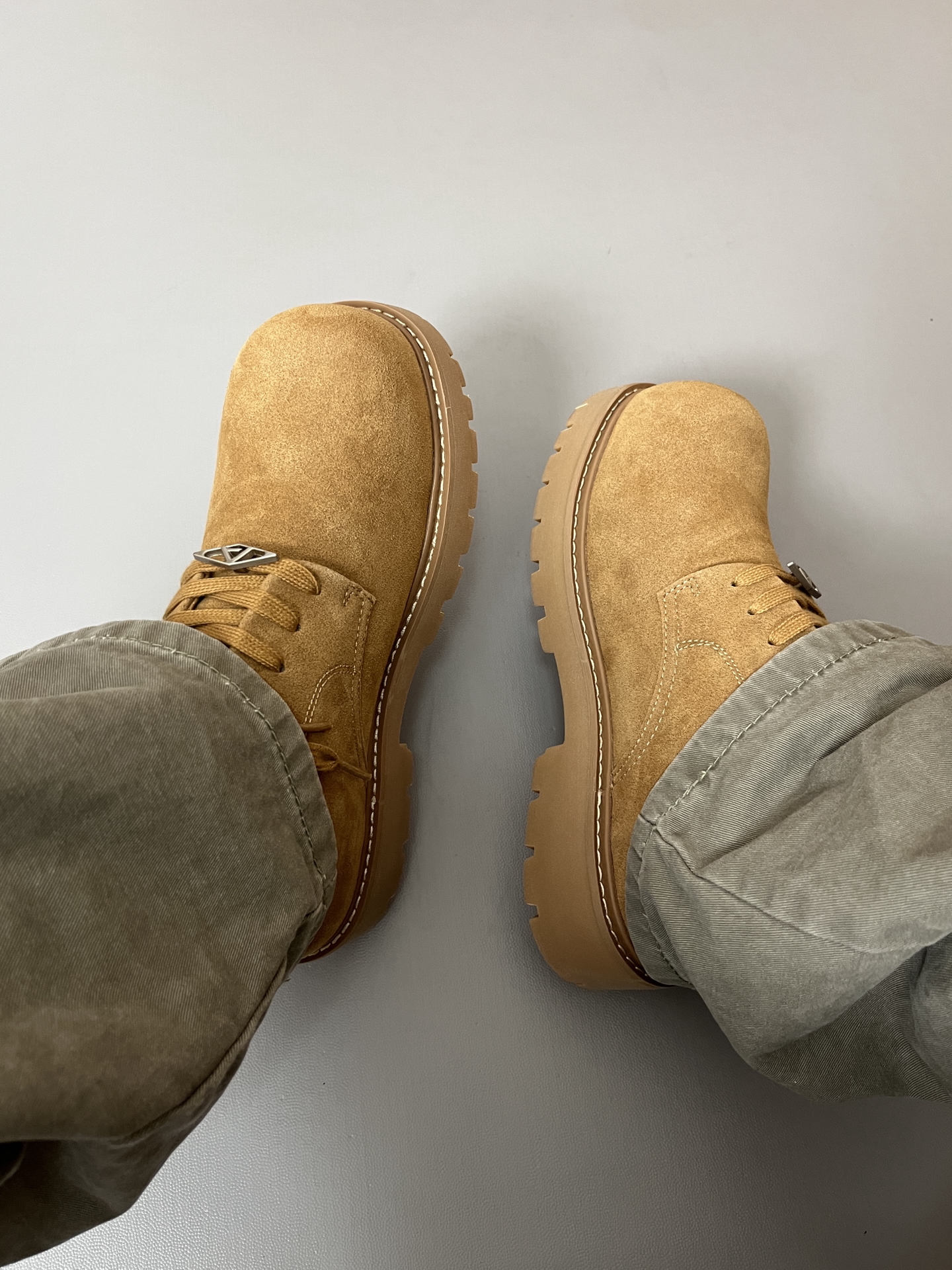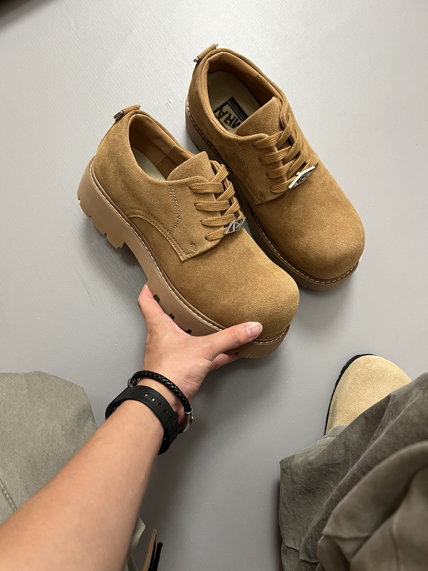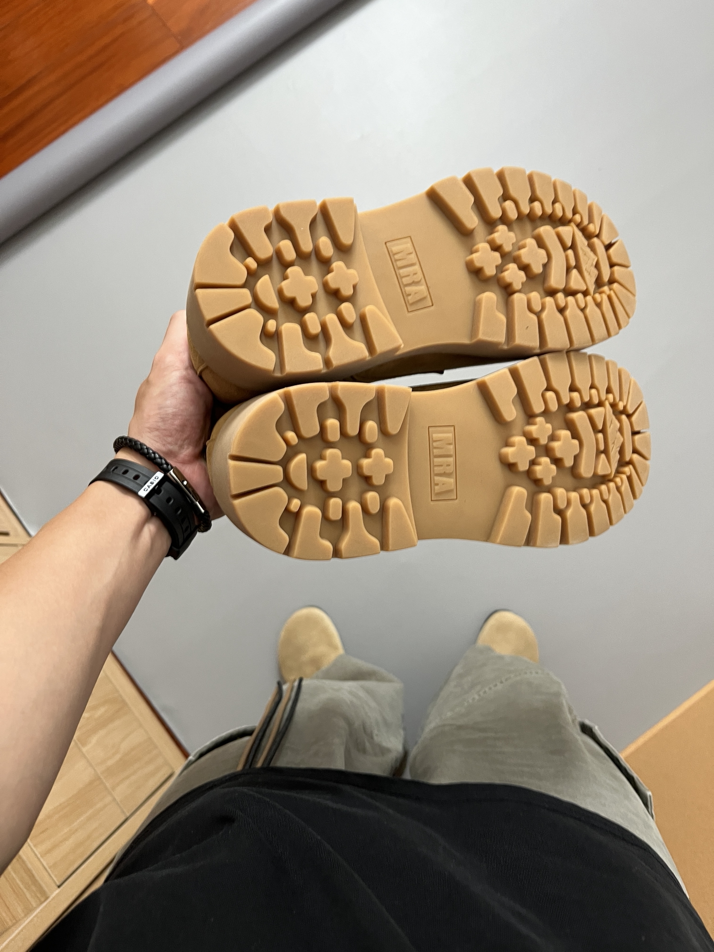 上脚 #MR.A 家的德比靴,尊嘟不想脱下来了! ✅复古做旧的棕色麂皮配上3cm厚底,视觉上直接拉长腿线!鞋头是圆润的工装设计,配牛仔裤👖瞬间美式复古感拉满,搭西裤居然也能穿出利落感,完全打破我对工装靴的刻板印象。🤔 ✅鞋面的磨砂皮摸起来软乎乎的,连鞋眼都是黄铜的,下雨天也不怕生锈。实测防水性不错,👌橡胶底在瓷砖上也不打滑。 ✅现在每天通勤直接套上它,配条直筒牛仔裤就能出门,连搭配都省了。这...