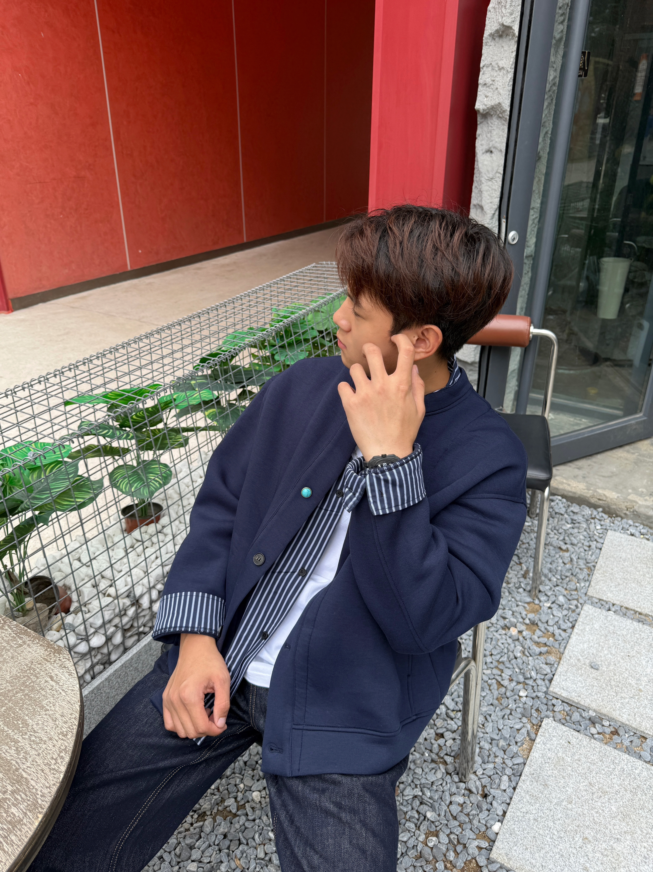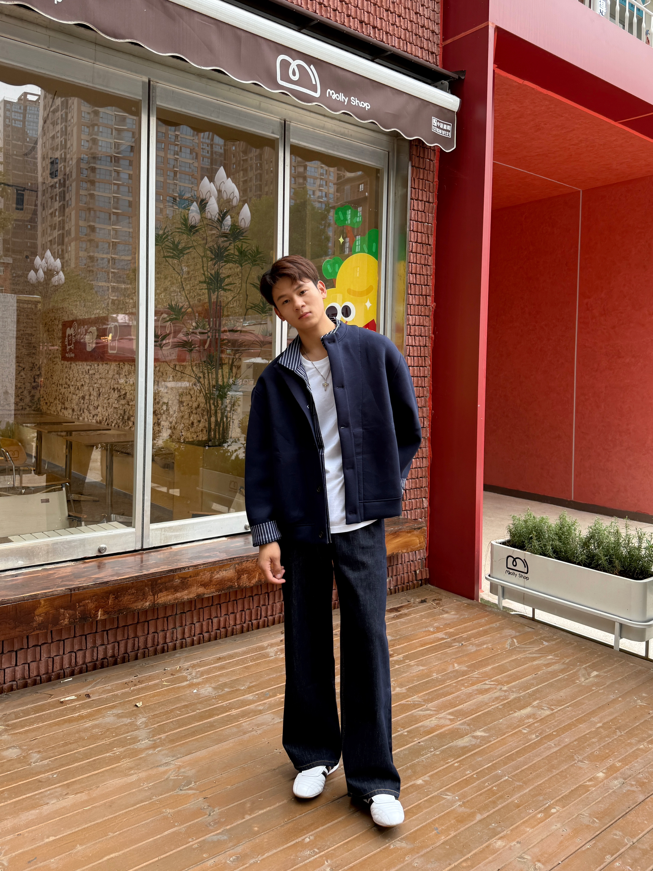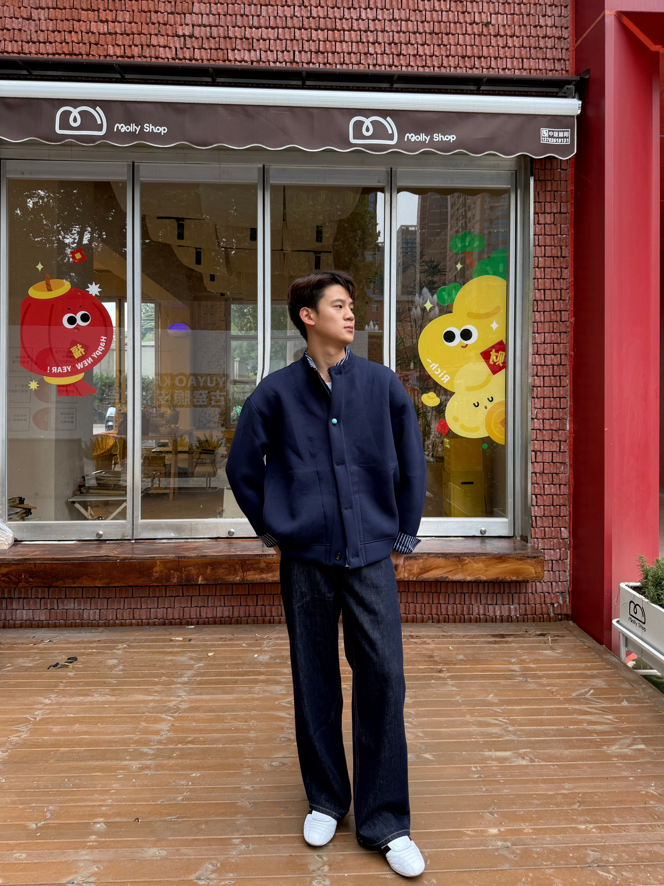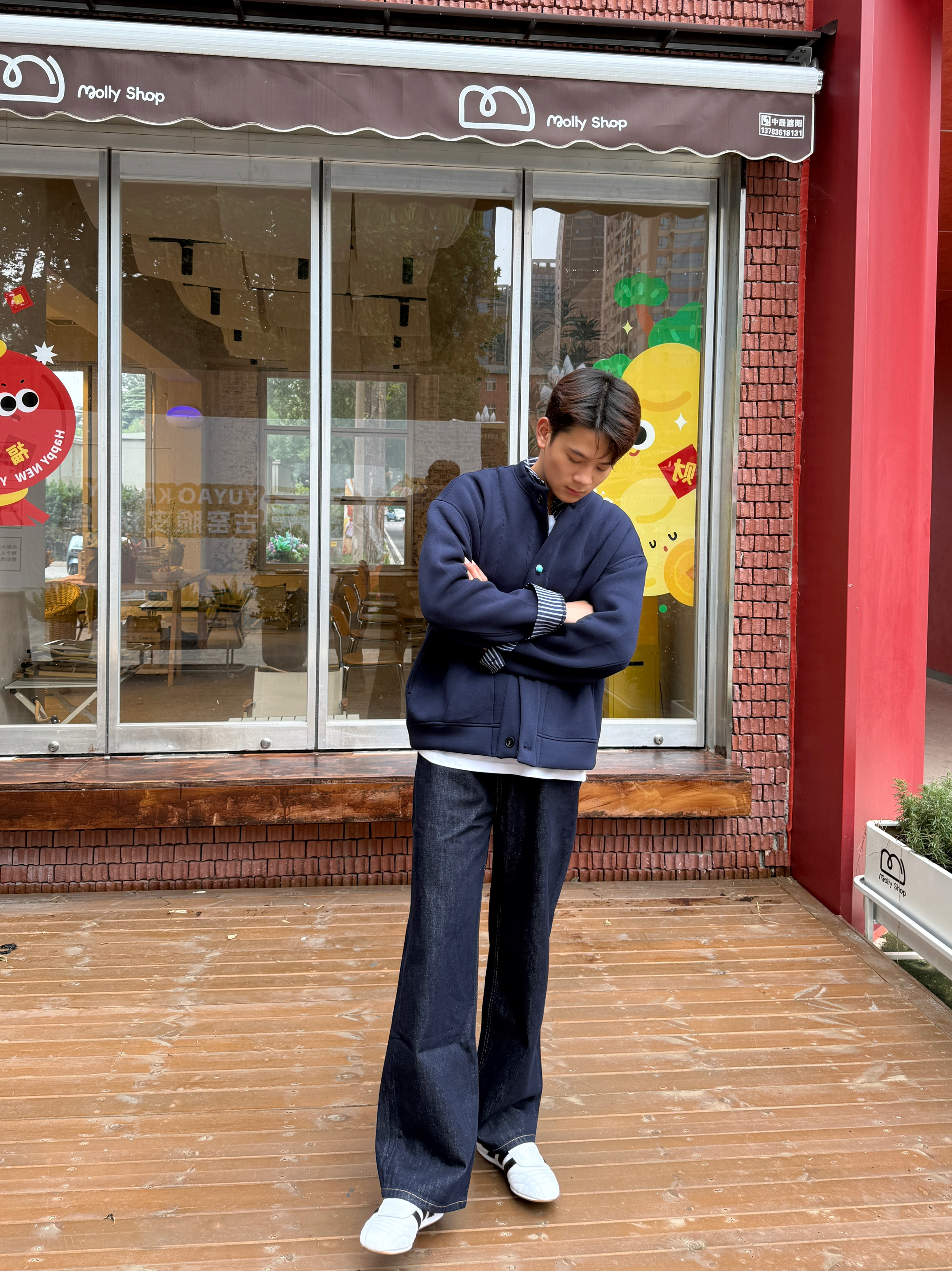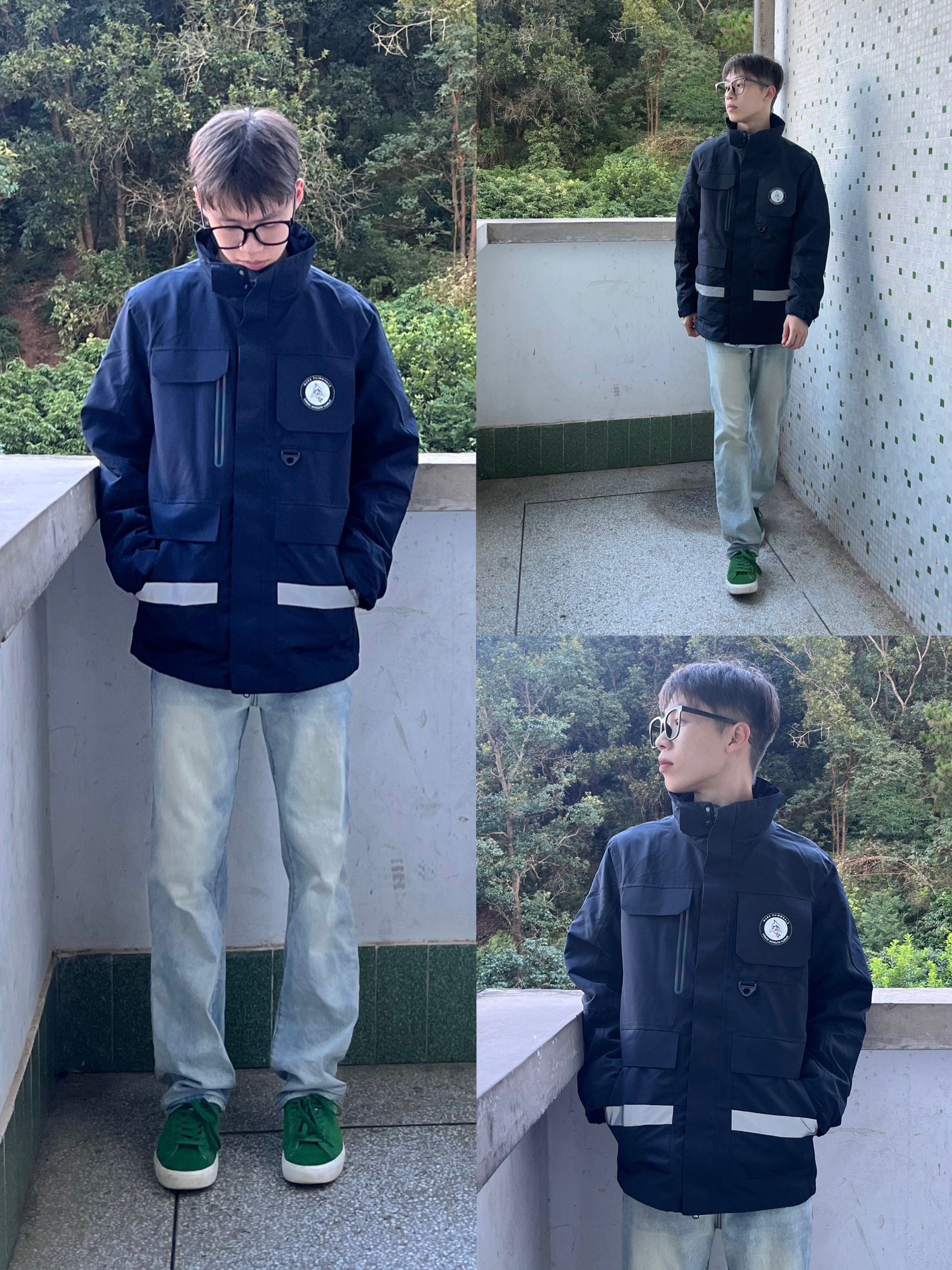 显白颜色当然是藏青色 亨利领的设计穿起来显的更精神 飞行夹克的版型,穿起来显高显瘦 搭配上一条牛仔裤,学院风十足 秋天这样穿包帅的!!!