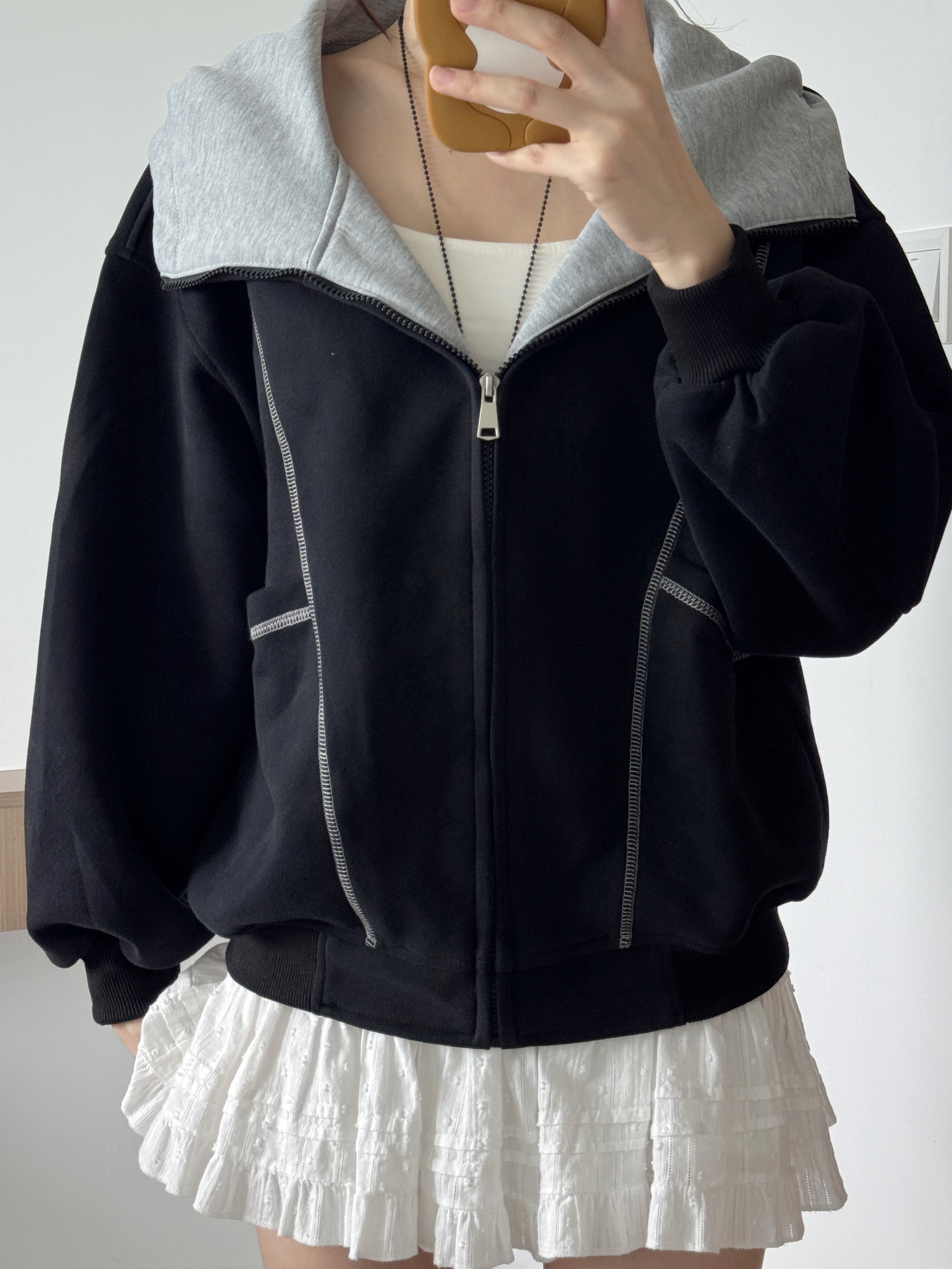 入秋少不了的黑色卫衣外套 经典又百搭 不挑人穿哦 面料很重磅 上身硬挺有型! 日常搭配裤子裙子都好好看呀🥰