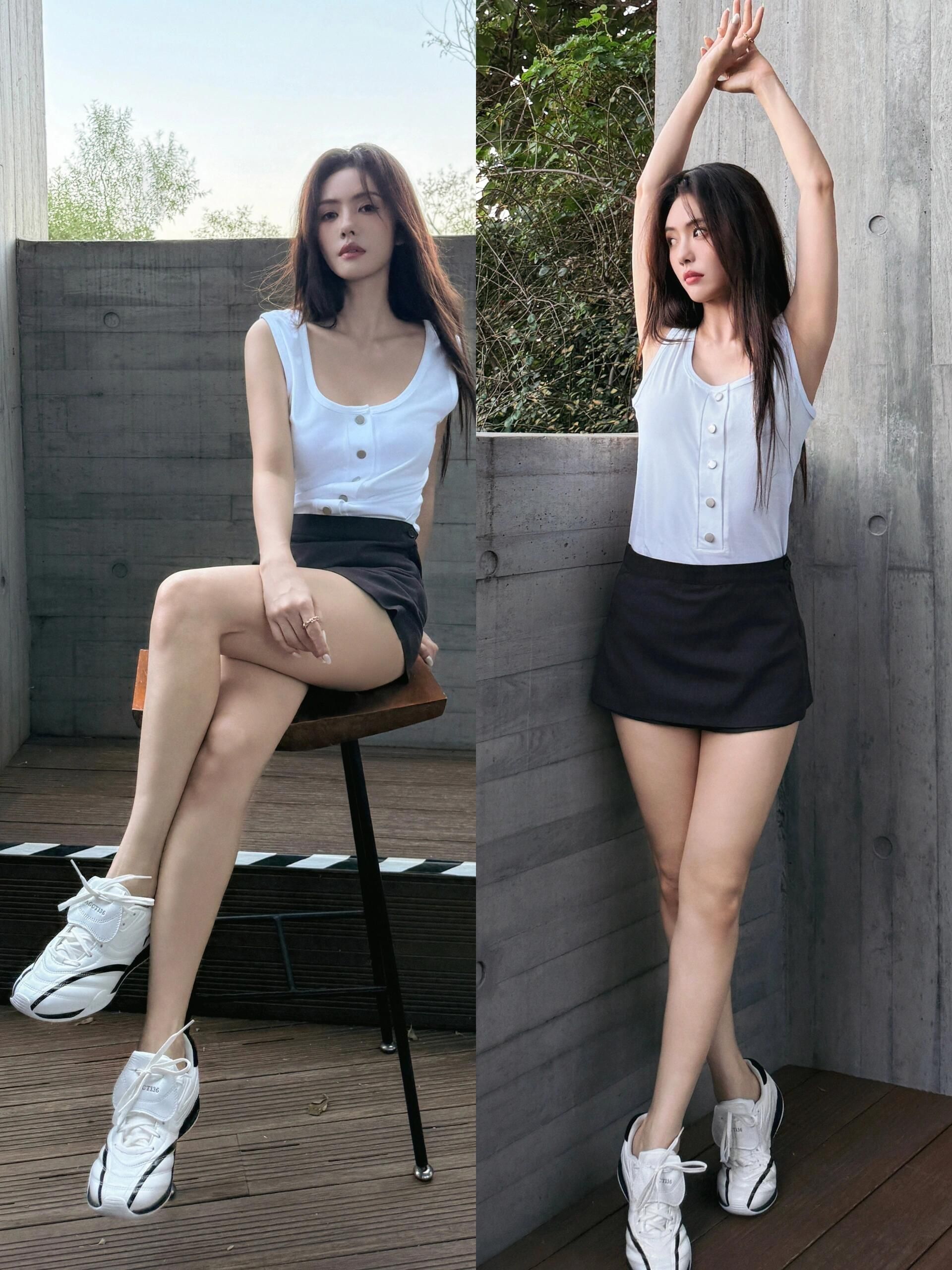 谁懂每次蔡文静私服一出,我就忍不住疯狂存图!📸 高挑的身材+不俗的审美,甜酷风格与摩登气场完美融合,怎么看都时髦得毫不费力。 最近她的一套造型尤其惊艳:简约的白色半开襟纽扣背心,搭配利落黑色短裙,清爽又显气质。最亮眼的是脚上轻盈又复古的 #李宁菲林[话题]# Pulse足球风薄底鞋,瞬间为整体注入潮流感,显得双腿更加修长笔直~ 她真的太懂如何用细节点亮全身啦,立马又加入日常穿搭灵感库中🛒!