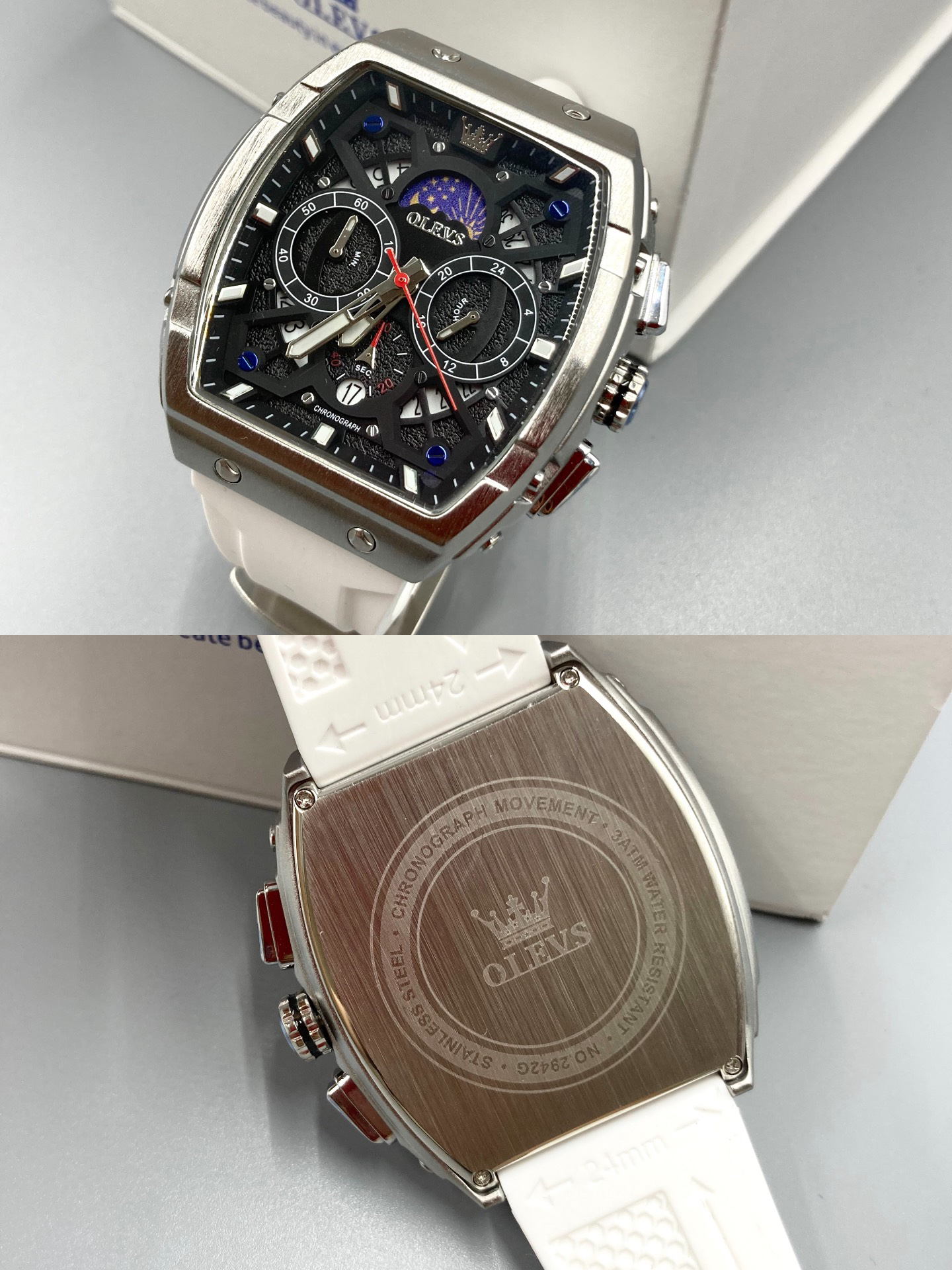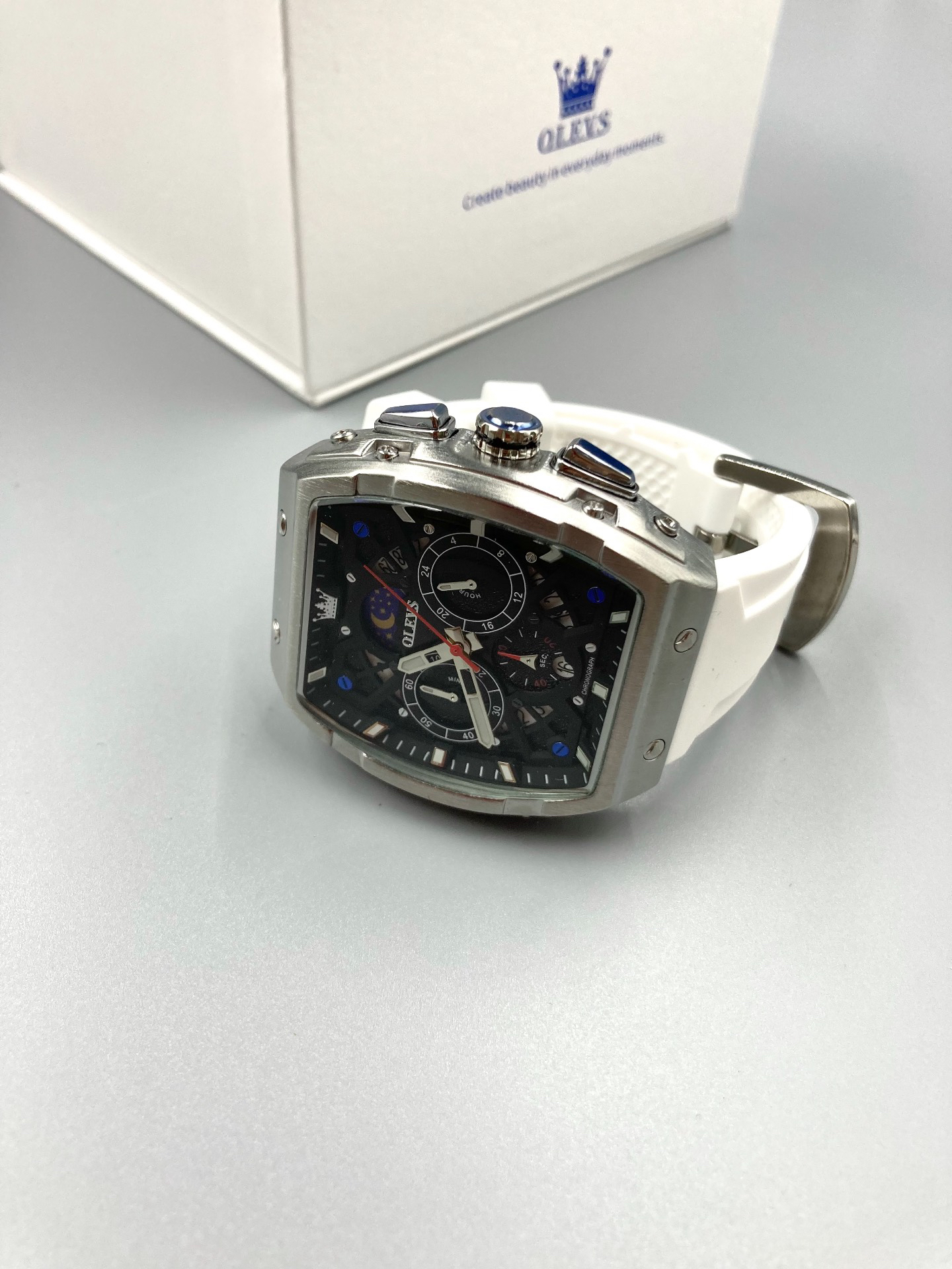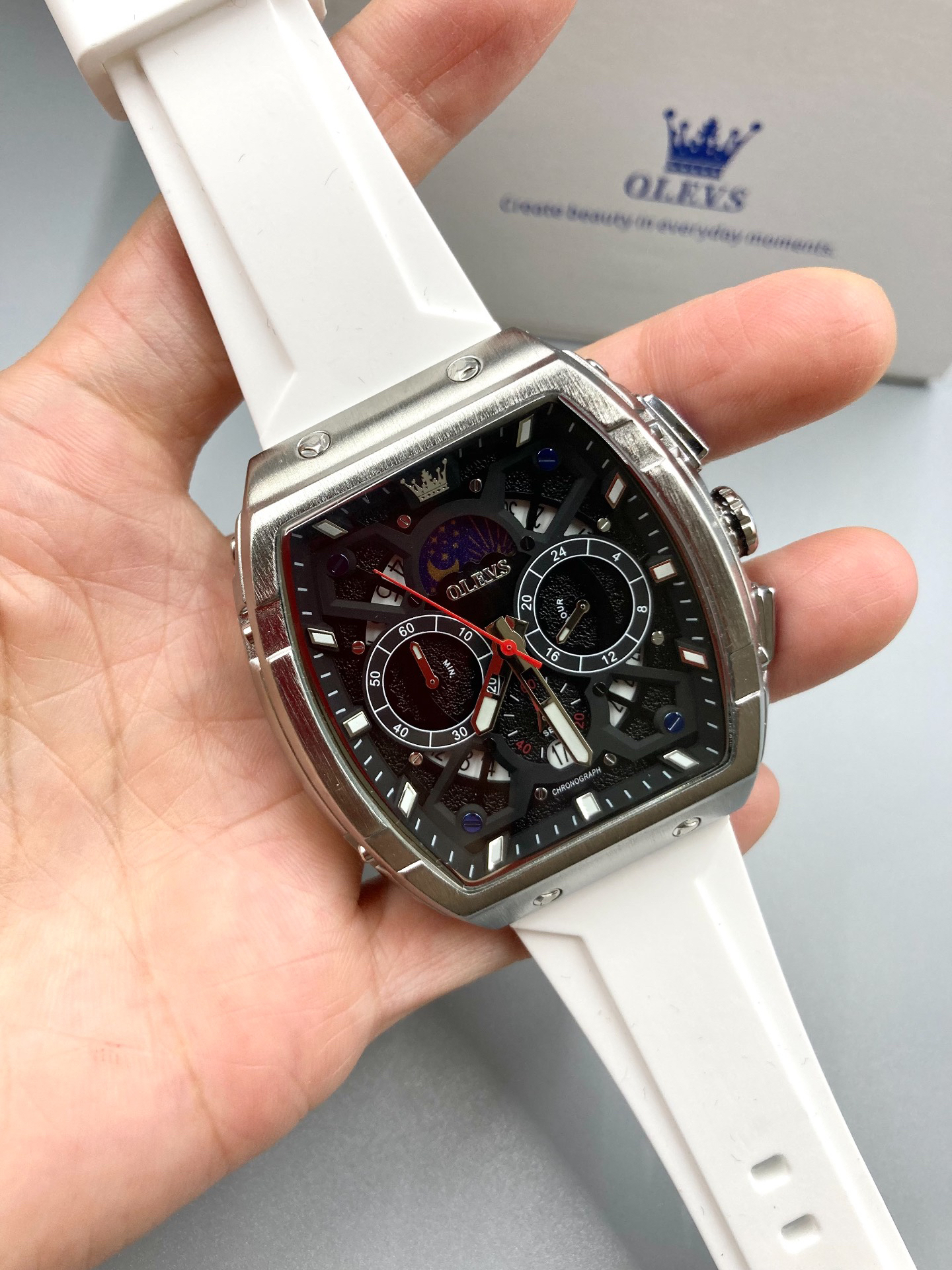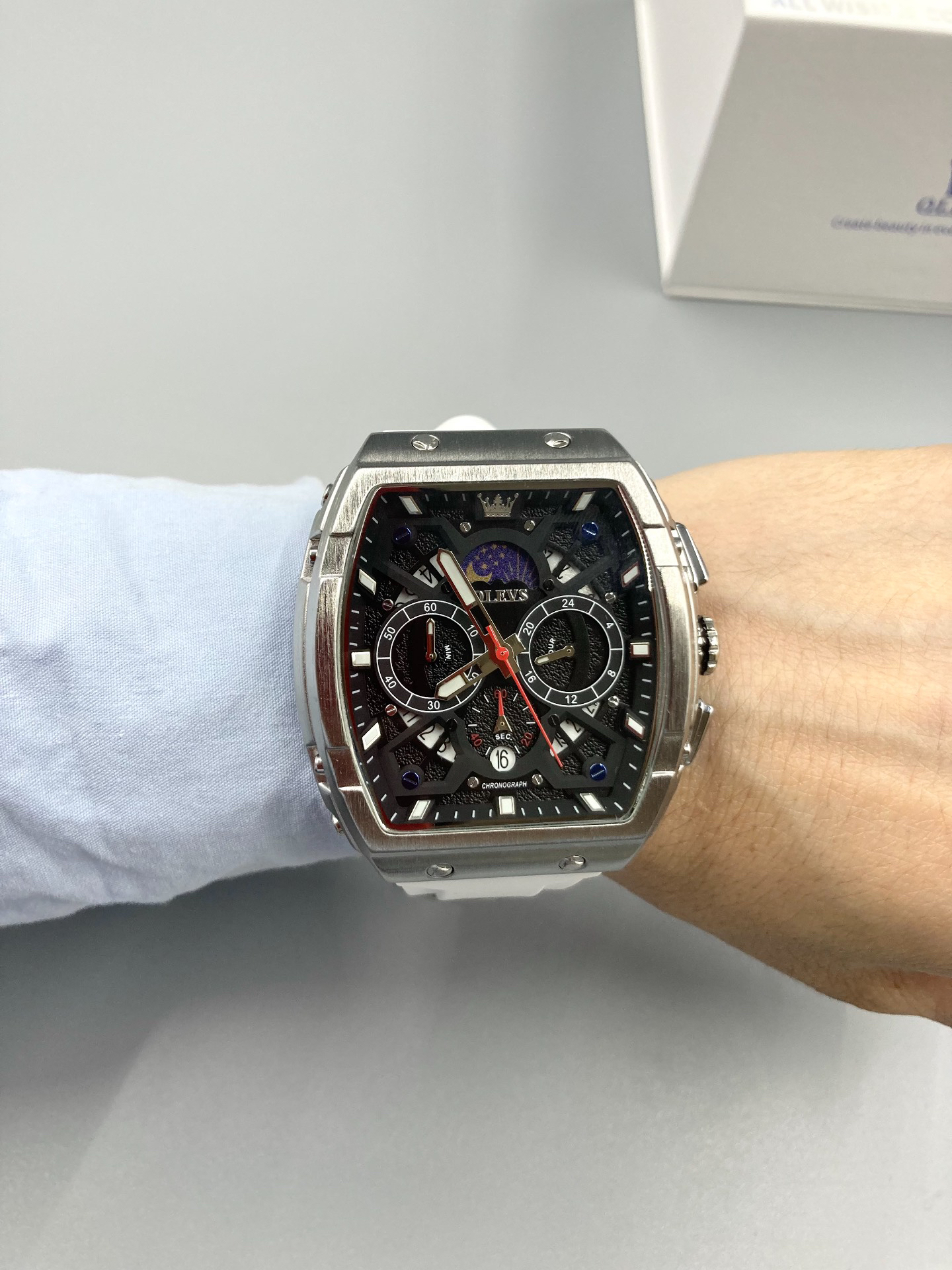 本篇笔记关联了OLEVS/欧利时 酒桶形大表盘时尚霸气多功能防水石英男士手表 白色等商品,为用户提供真实的使用体验和购买参考。