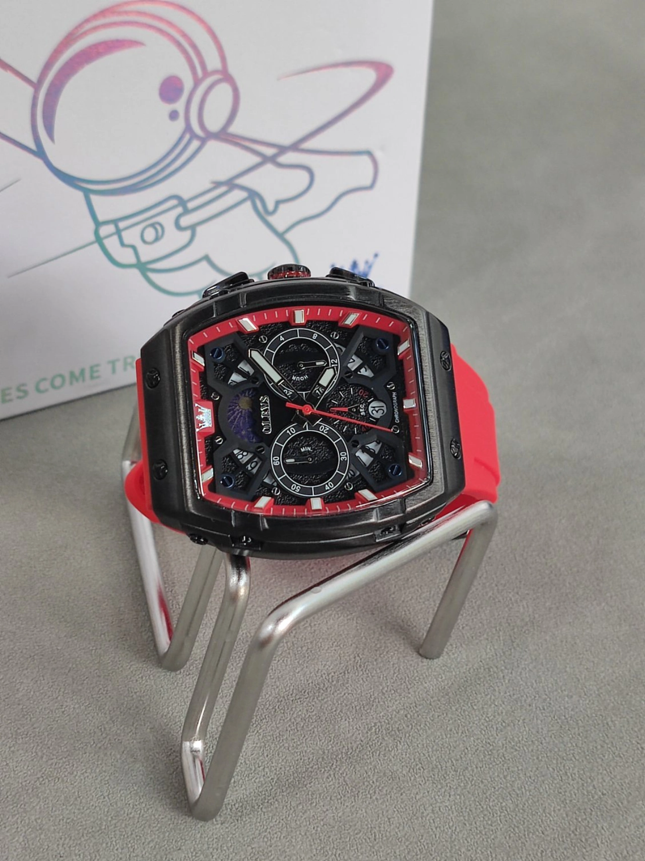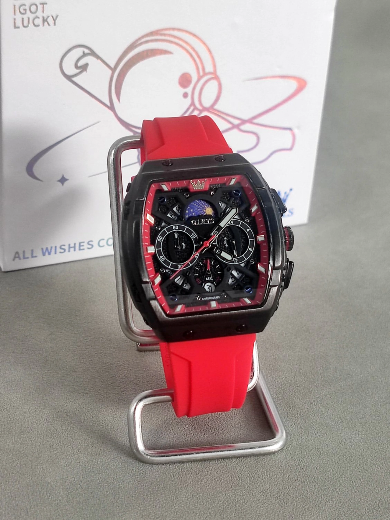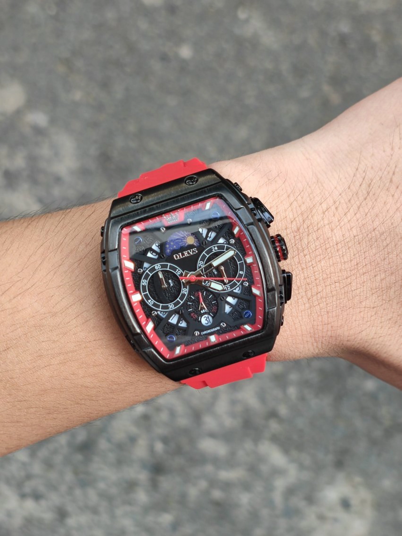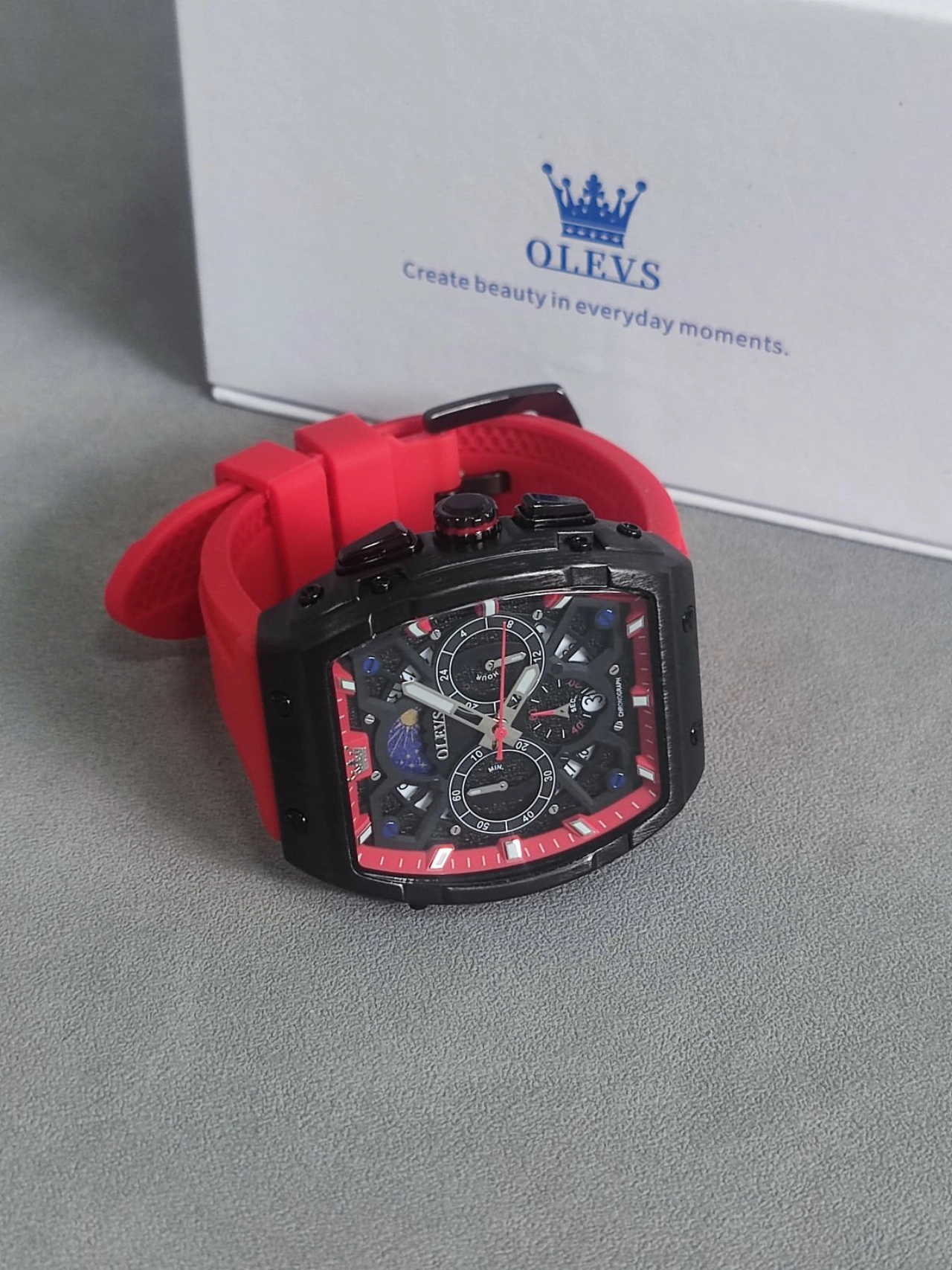 本篇笔记关联了OLEVS/欧利时 酒桶形大表盘时尚霸气多功能防水石英男士手表 红色等商品,为用户提供真实的使用体验和购买参考。