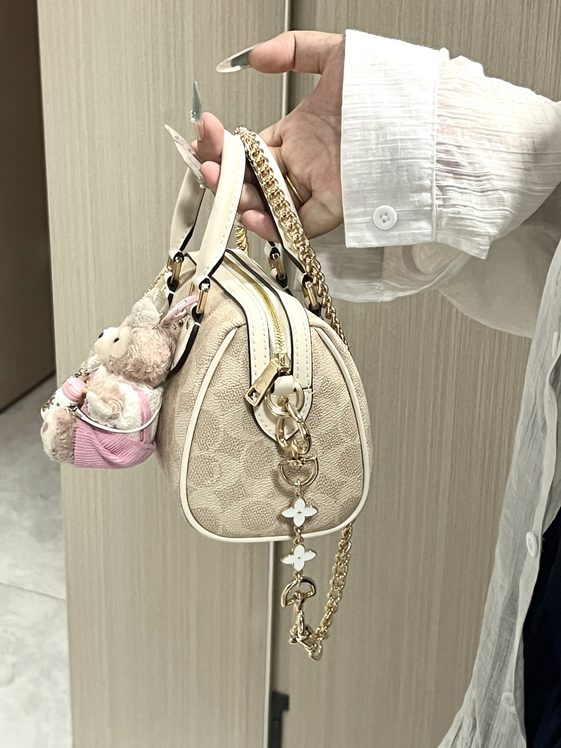 最近出油佩戴的包包就是介个蔻驰波士顿包包啦 有没有发现小细节 就是这个四叶草延长链 这个是我自己搭配的 感觉佩戴起来好温柔 更精致了一点 出门背着或者拿着 都很好看 拍照也hin出片~