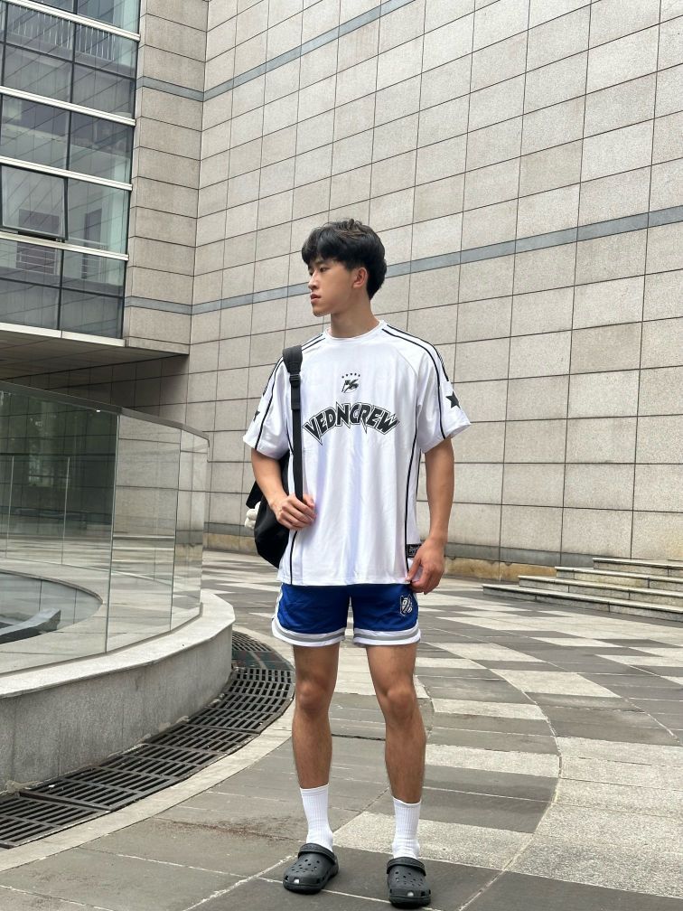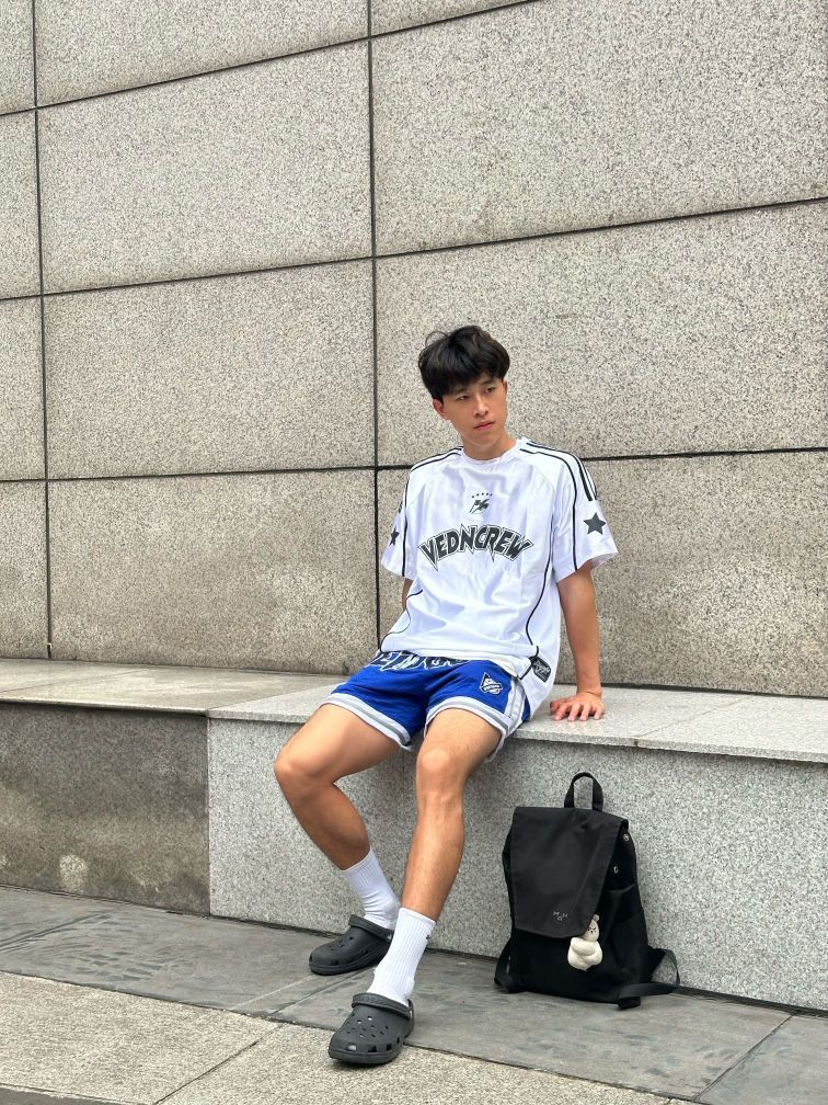 身高|体重:185 80kg 🧍♂️ 穿搭风格:运动丝绸风,运动少年快上身 👔 上衣:维动得新款绸缎面的短袖,很有风格,衣服穿着够亮眼 👖 下装:维动运动短裤 👟 鞋子:卡洛驰洞洞鞋,好穿yyds