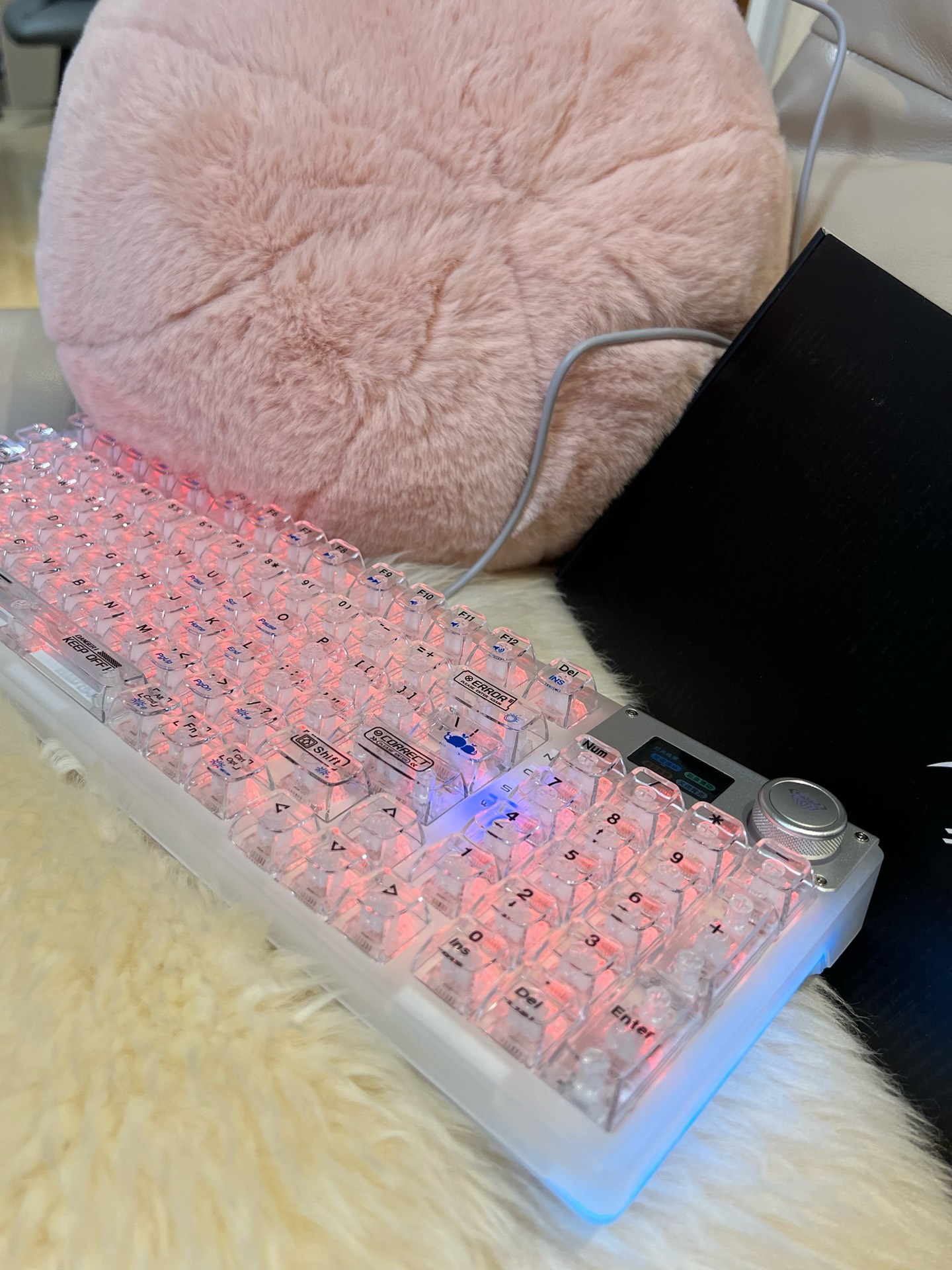 我发现个超适合送女生的礼物!就是这个带智能屏显的机械键盘~全透明设计颜值好戳我😍 三模连接很方便,办公打游戏都能用!按键手感也很细腻,按起来很舒服~不过它没有手托,长时间用手腕会有点酸🤔 但架不住它好看又实用哇,爱打游戏的女生收到肯定超开心🥳 图源网络侵删