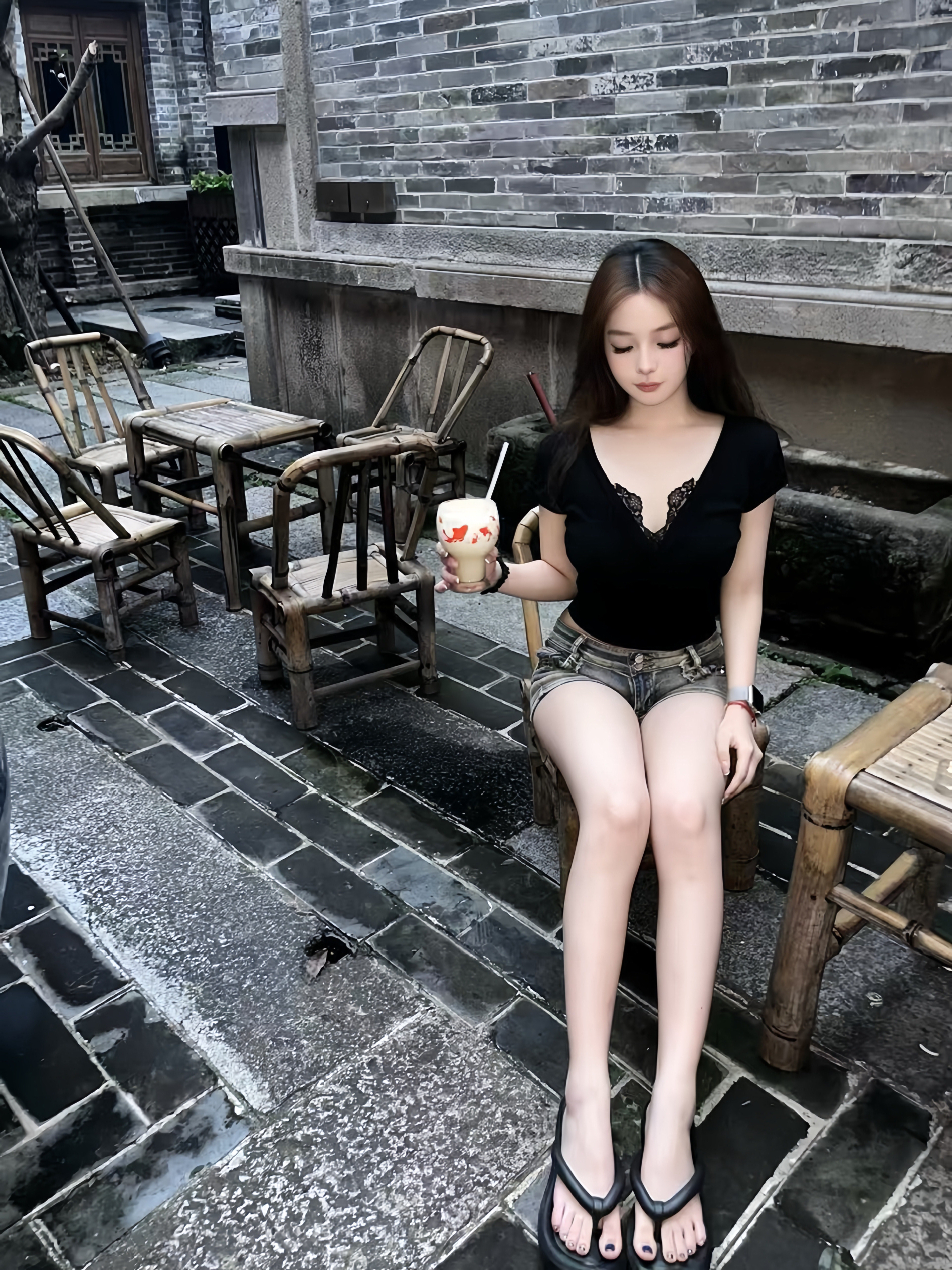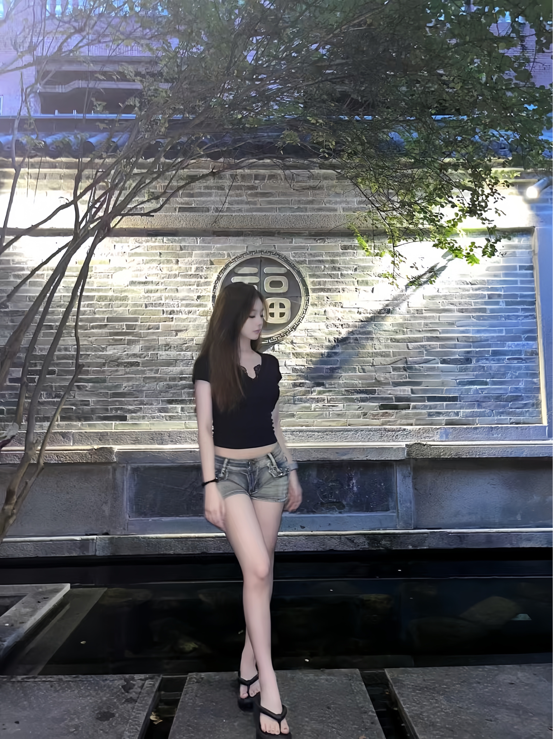 【夏日随性穿搭|邂逅中式庭院的静谧时光】 一身简约黑tee搭配浅色牛仔短裤,脚踏舒适厚底人字拖,慵懒中藏着恰到好处的精致感。站在斑驳砖墙前,绿意与圆窗勾勒东方韵味,仿佛时光在此刻慢了下来。 ✨穿搭tips: ▪️黑色短袖百搭显瘦,棉质面料透气亲肤 ▪️高腰牛仔短裤拉长比例,浅色系清新夏日 ▪️厚底人字拖悄无声息增高,漫步也不累脚 无需繁复修饰,一套轻松出街的造型,也能与古典场景完美融合...