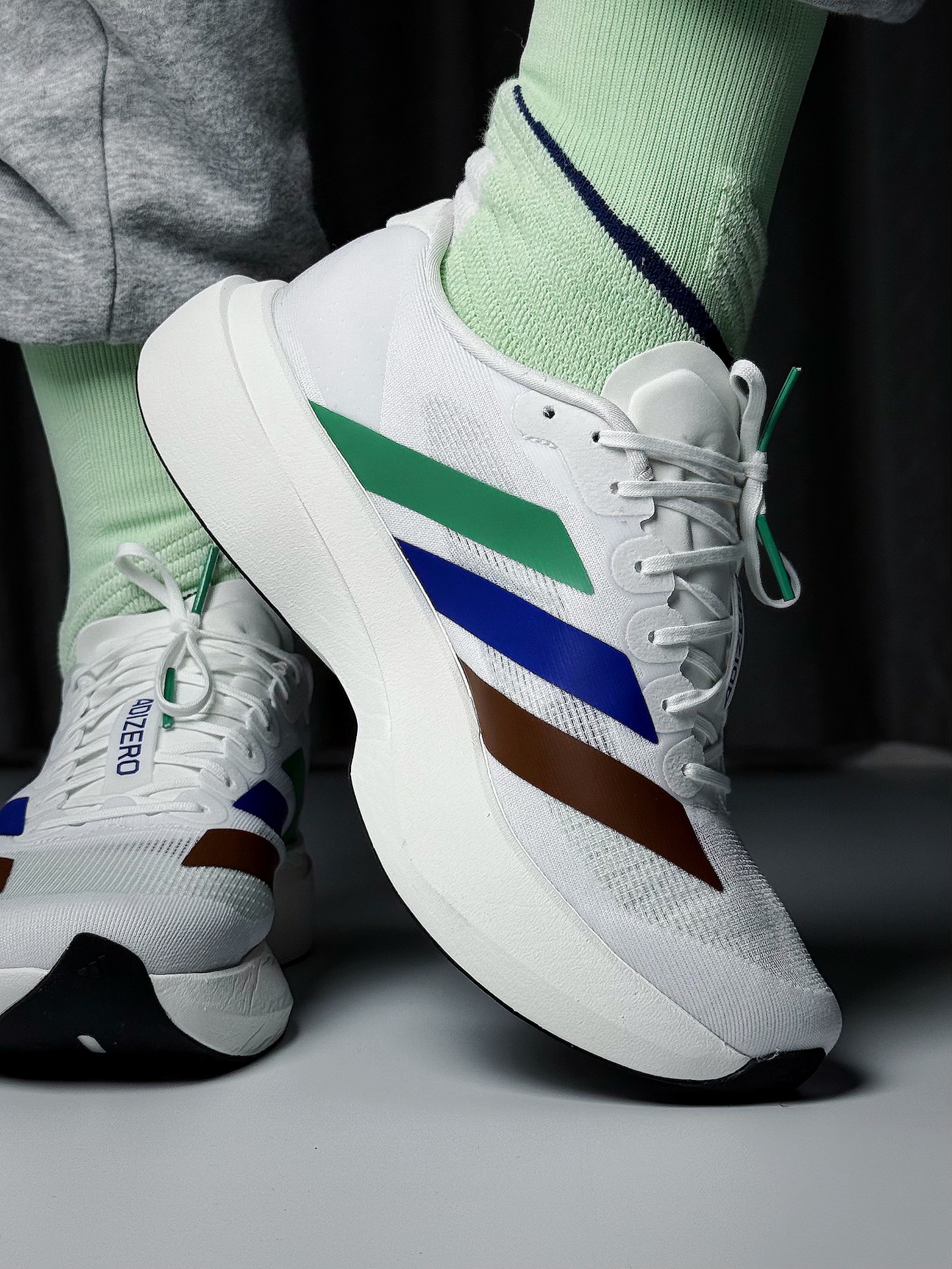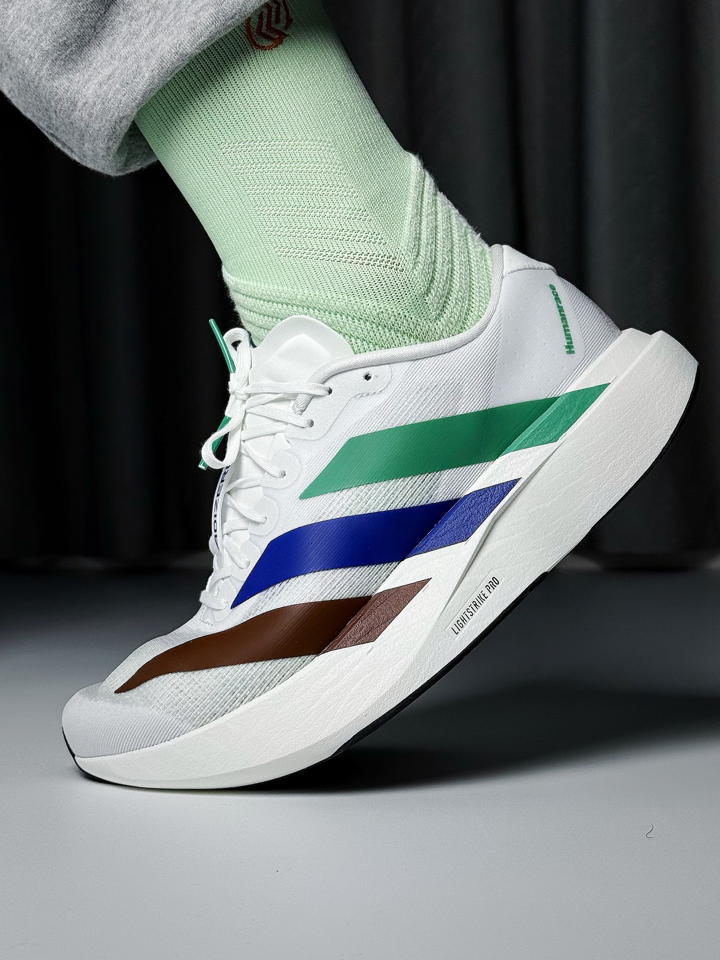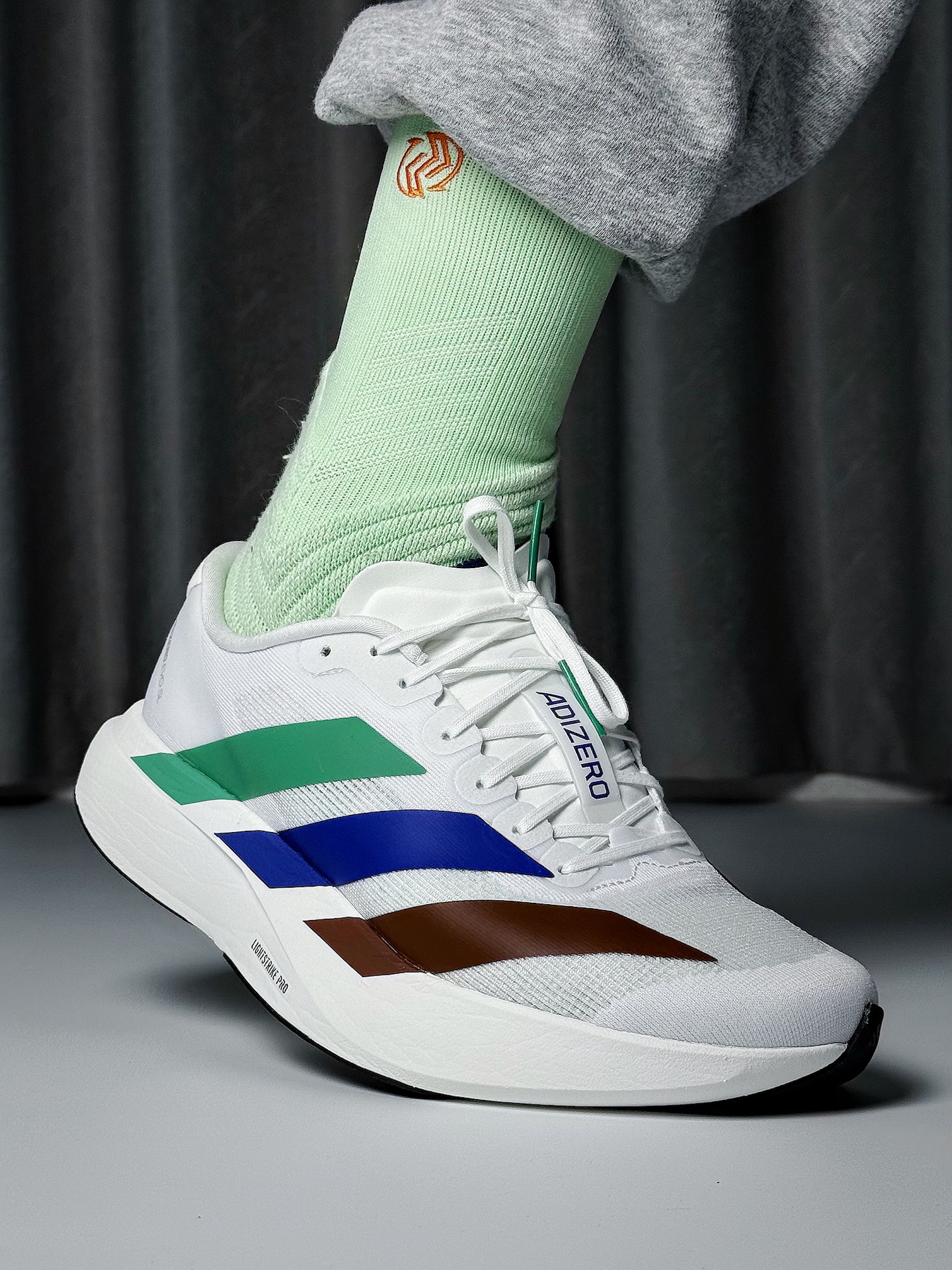 最近入手了Humanrace x adidas Adizero Evo SL跑鞋,必须分享一下 这双菲董联名款以纯白色鞋面为主,侧边LOGO为棕、蓝、绿设计,对应着大地、海洋与森林元素,另外在左脚后跟处印有Humanrace联名字样,虽然颜值这块独特了,但价格嘛[皱眉_blue]也够买两双普通款EVO SL了 中底为全掌Lightstrike Pro材质,缓震性能优秀,跑步时能有效吸收冲击力,...