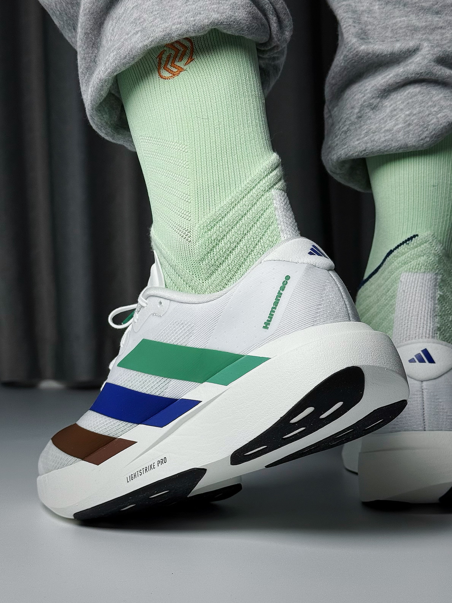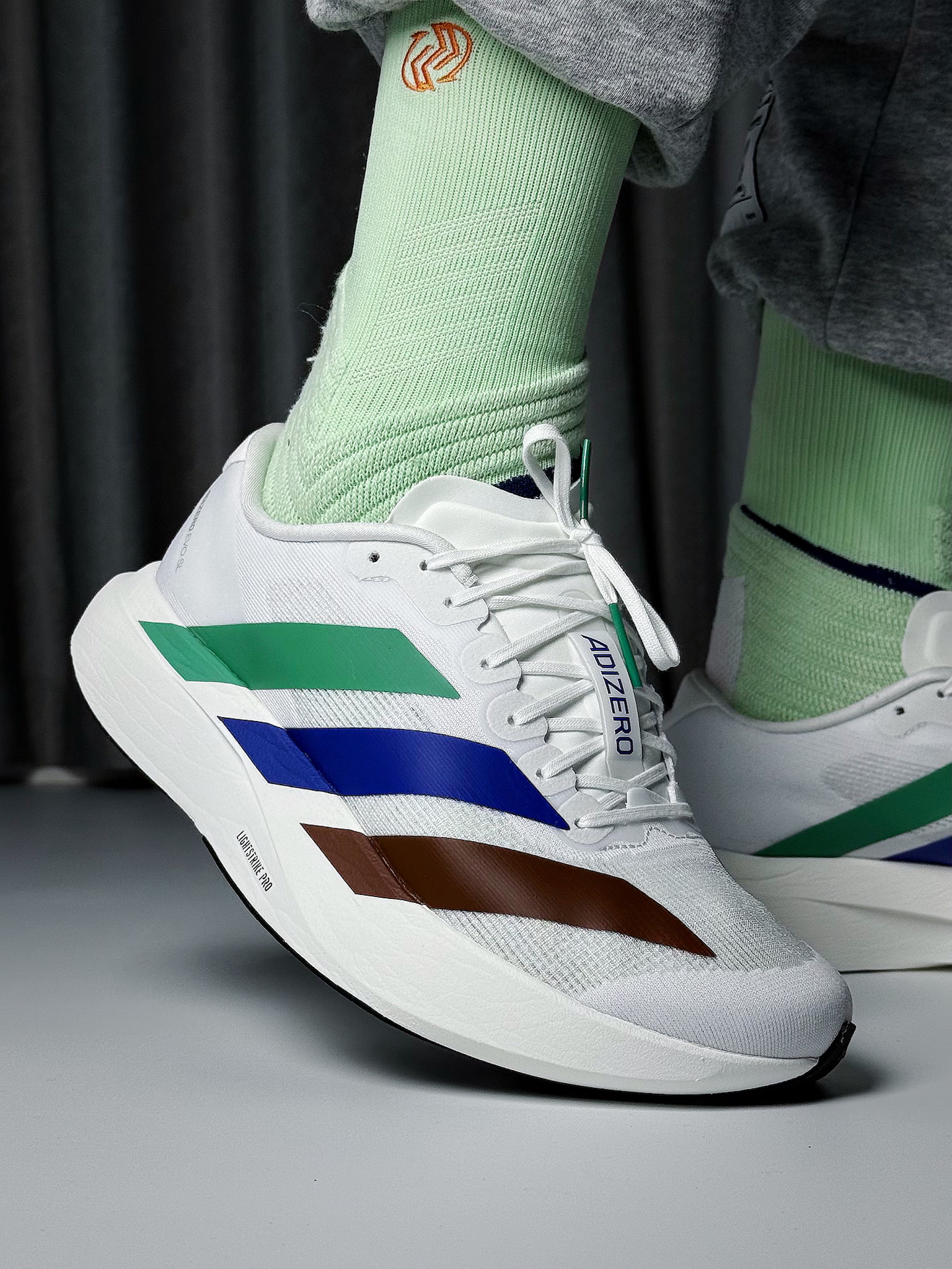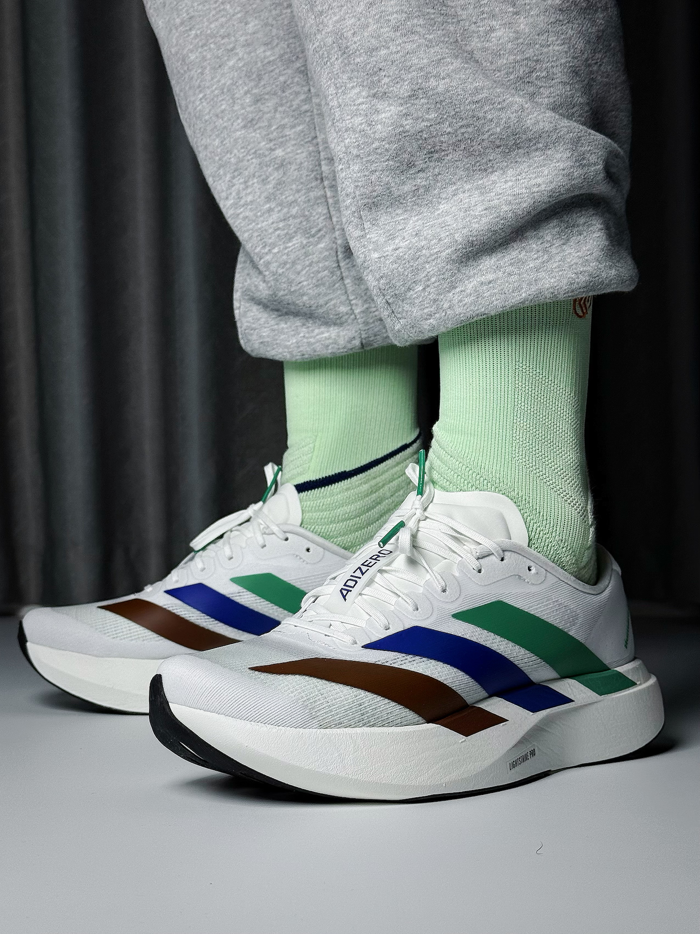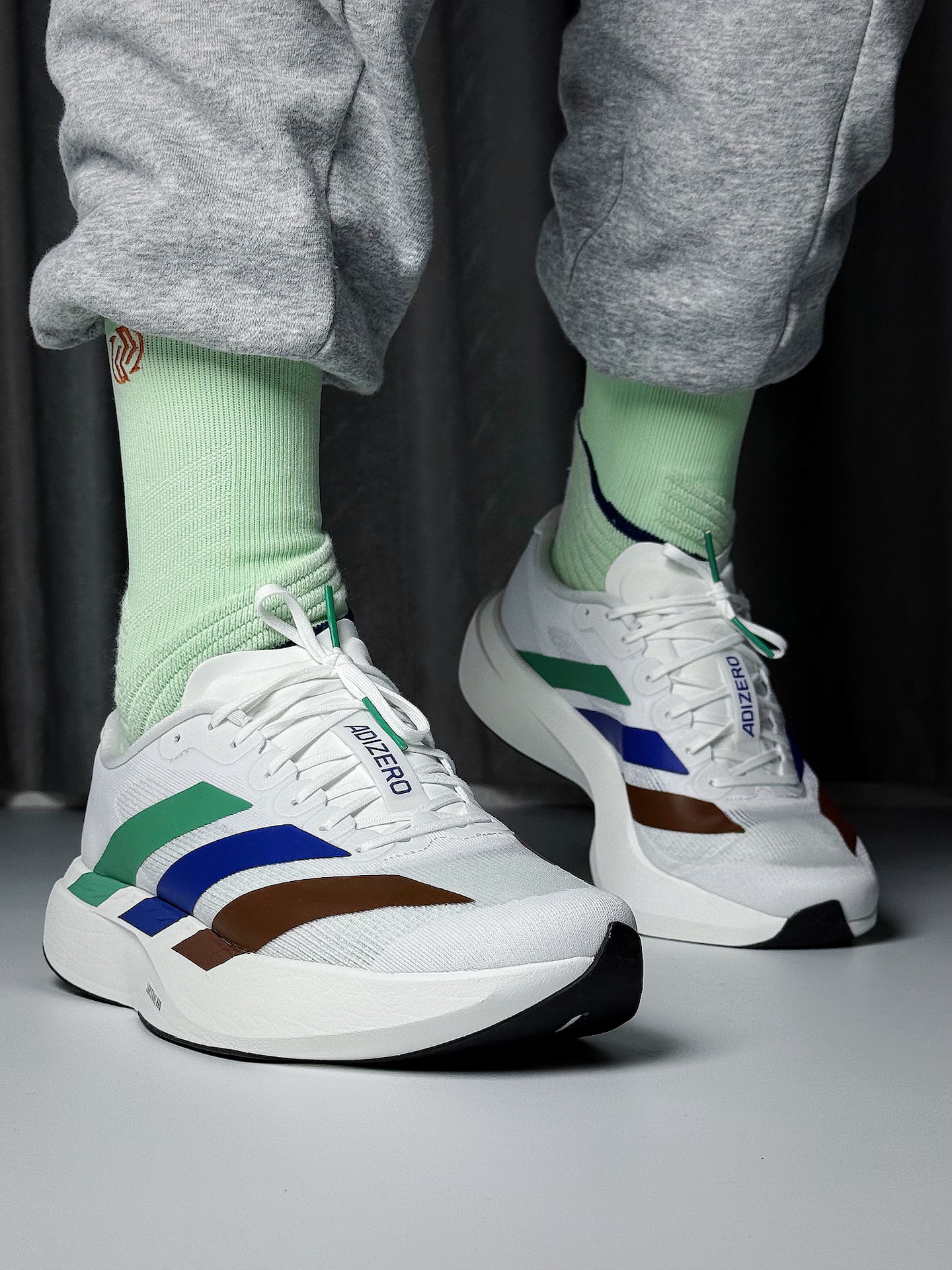 最近入手了Humanrace x adidas Adizero Evo SL跑鞋,必须分享一下 这双菲董联名款以纯白色鞋面为主,侧边LOGO为棕、蓝、绿设计,对应着大地、海洋与森林元素,另外在左脚后跟处印有Humanrace联名字样,虽然颜值这块独特了,但价格嘛[皱眉_blue]也够买两双普通款EVO SL了 中底为全掌Lightstrike Pro材质,缓震性能优秀,跑步时能有效吸收冲击力,...