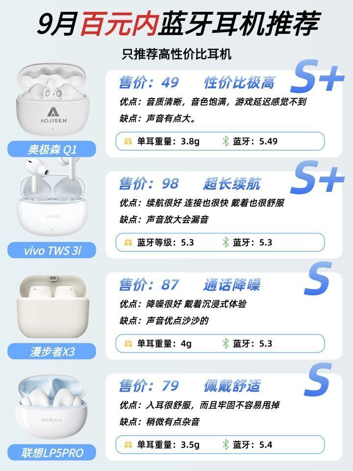 宝子们,我又来给大家挖宝了! 最近为了找百元内好用的蓝牙耳机,我真是煞费苦心,把市面上热门的款式几乎都试了个遍。 过程中踩过不少雷,也有过不少惊喜,终于整理出了这份超全的百元内蓝牙耳机测评。 吐血整理出来的这些蓝牙耳机,真的每一款都让我“上头”到不行 不管是音质、续航还是佩戴舒适度,都各有各的亮点 话不多说,这就把我的宝藏发现分享给大家!
