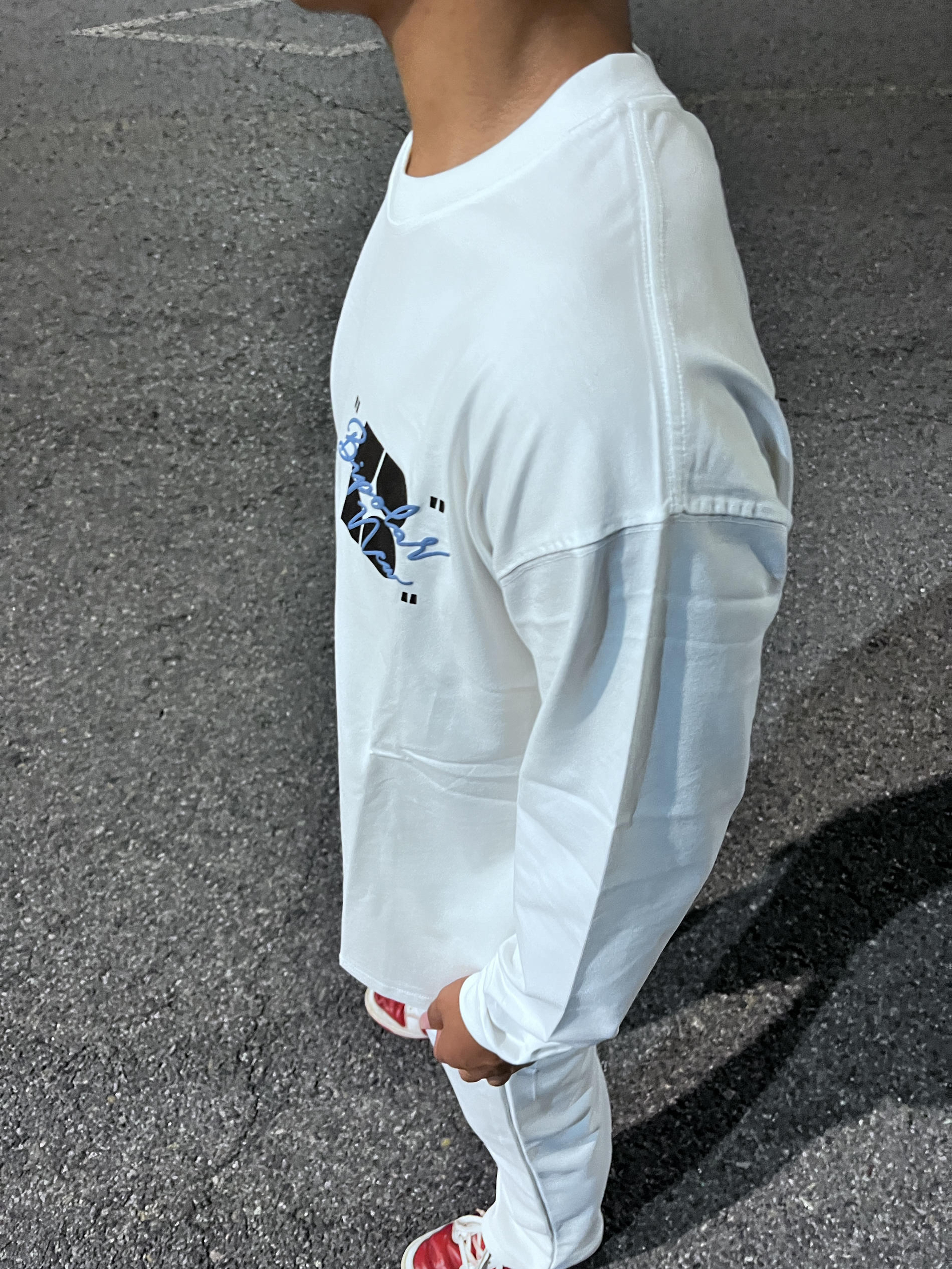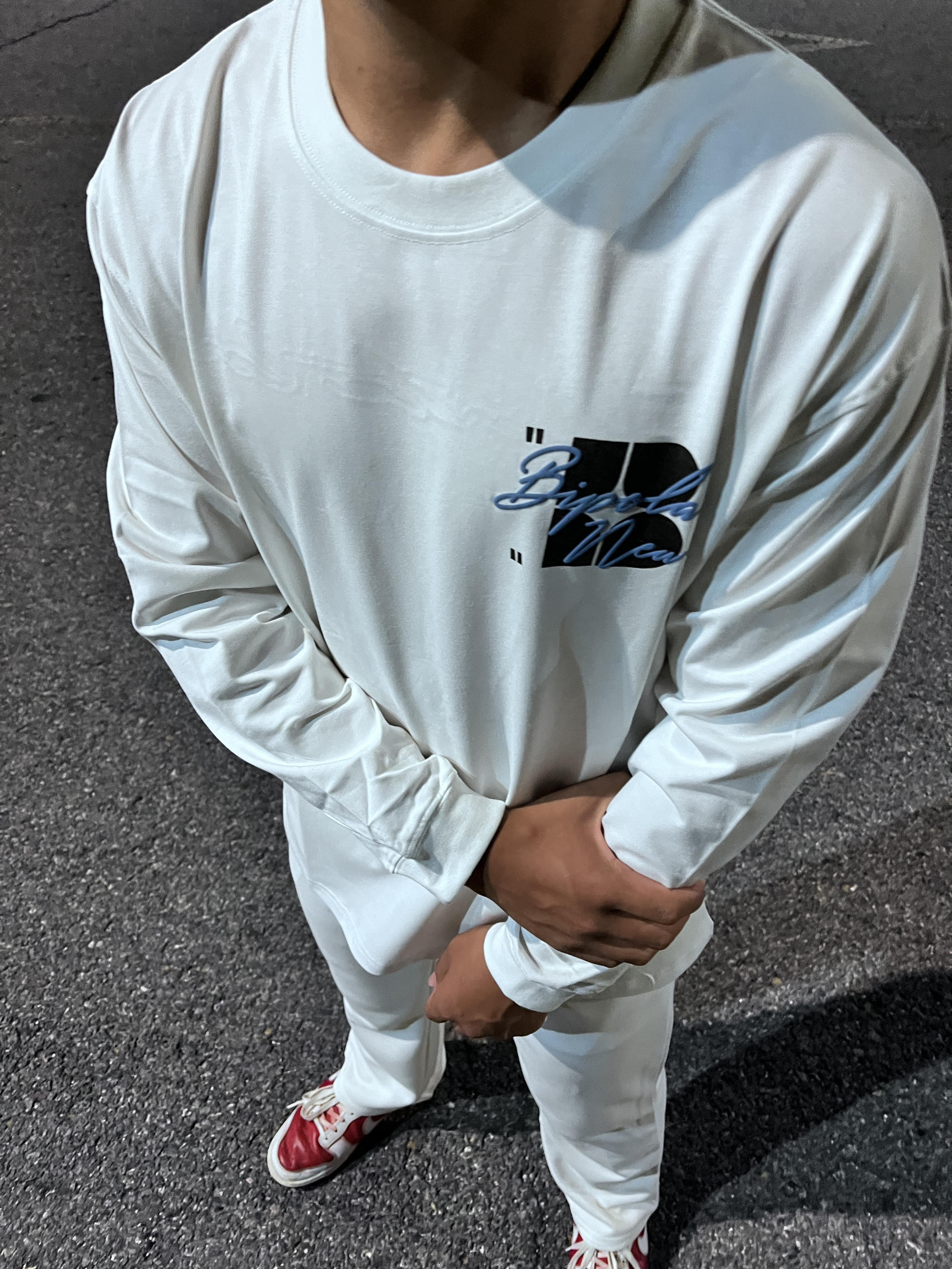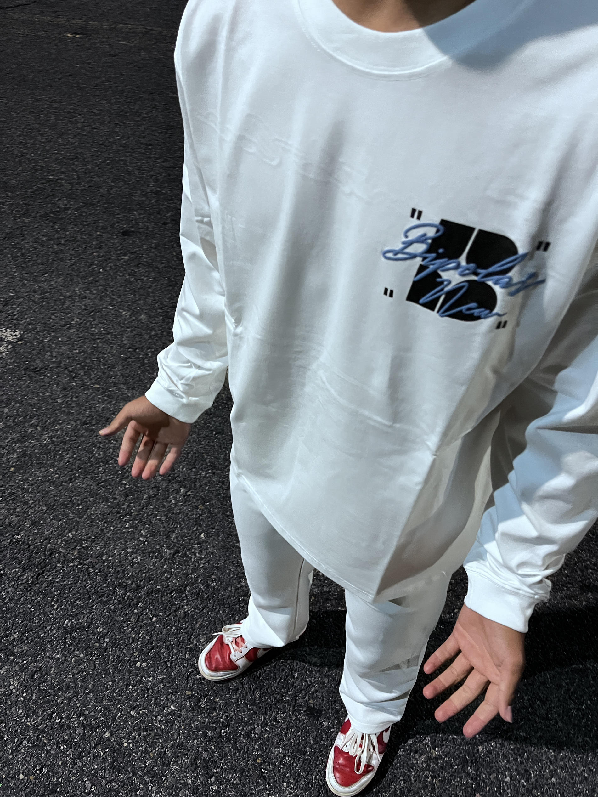 这款bipolar长袖T恤 白色色搭配蓝色的刺绣 走在路上不会太撞衫后背的断开字绣花设计超吸睛 纯棉面料超级舒服 夏天穿不闷汗 宽松版是宽松显瘦 学生党的百搭T恤