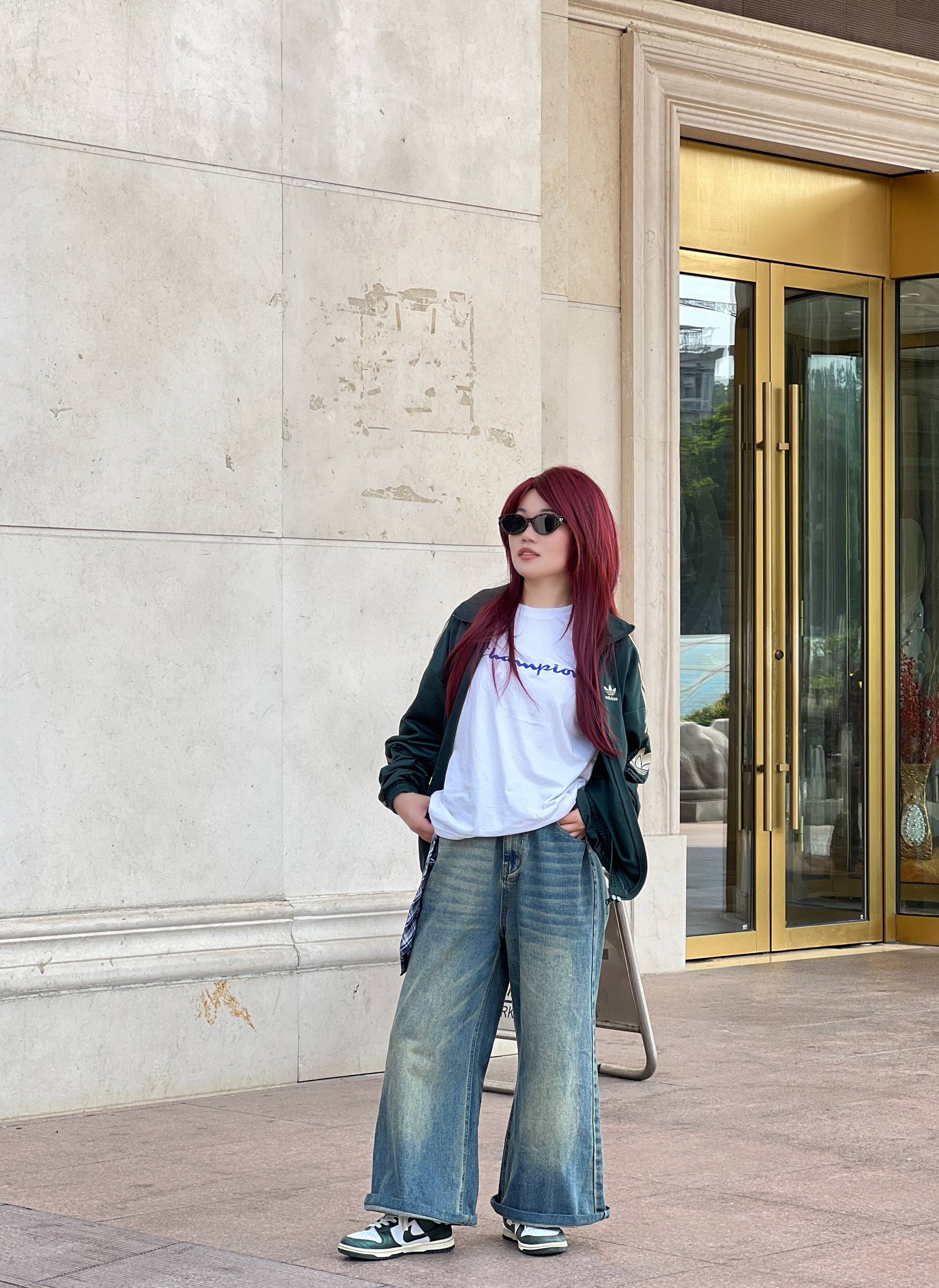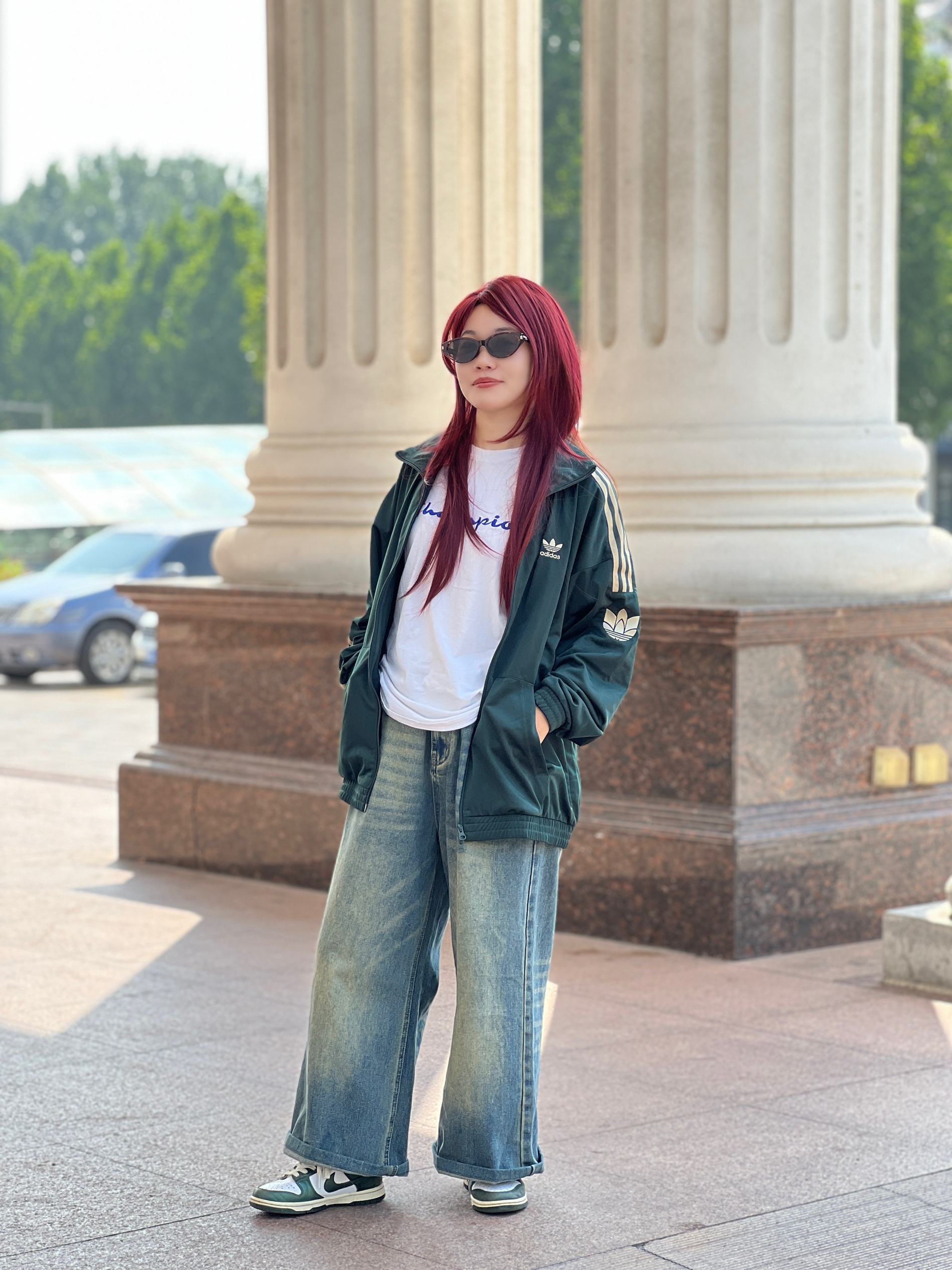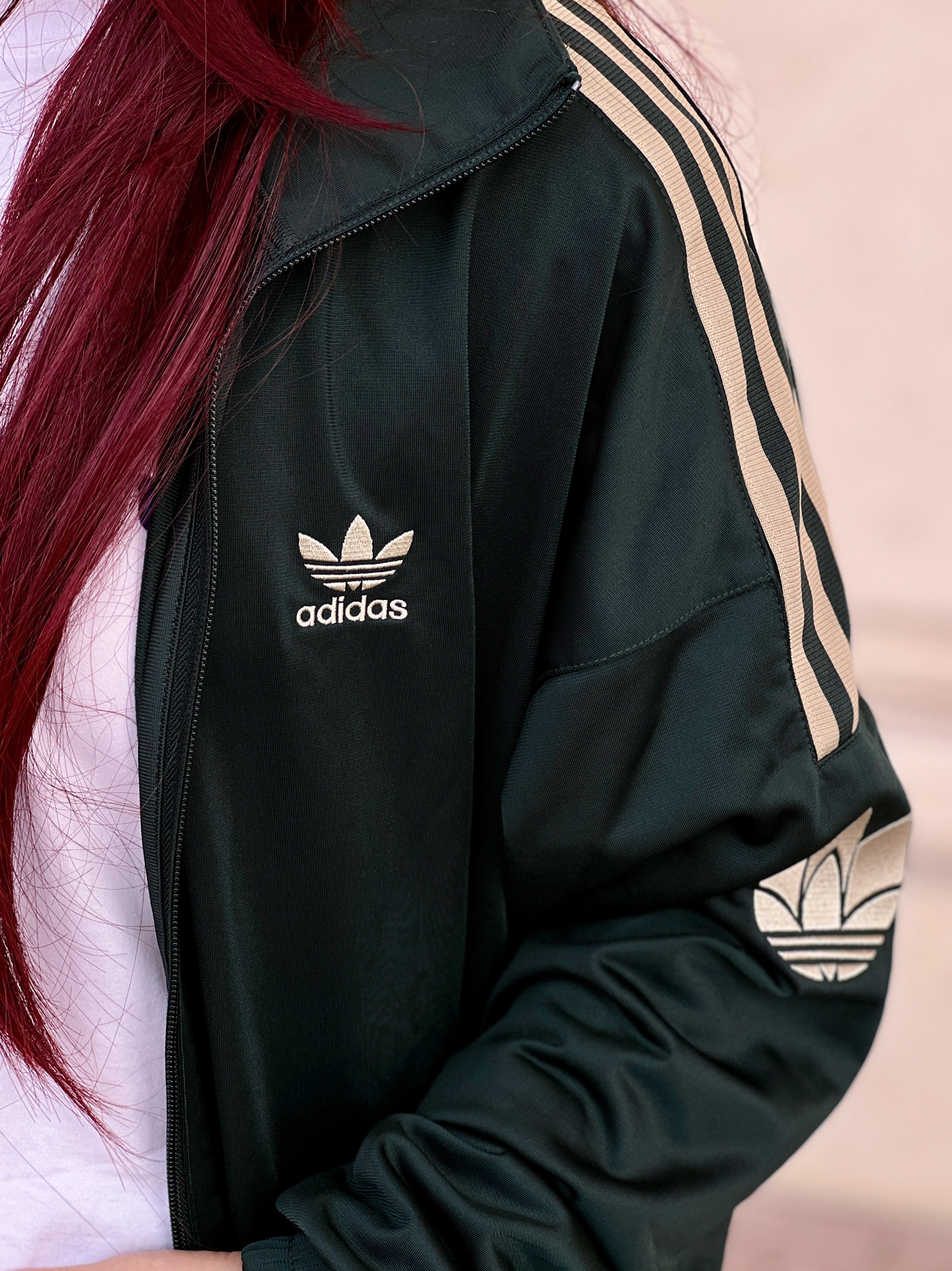 穿搭信手拈来👋🏻 墨绿色阿迪经典外套适合早晚温差大的初秋🍂 轻薄又透气,袖子上的金色阿迪经典标志✅很亮眼~ 复古色调的牛仔裤👖百搭不厌 鞋子选和上衣同色系的Dunk 好爱这种复古感~ 搭配复古风穿搭时,你们会搭配德训鞋还是老爹鞋呢❓