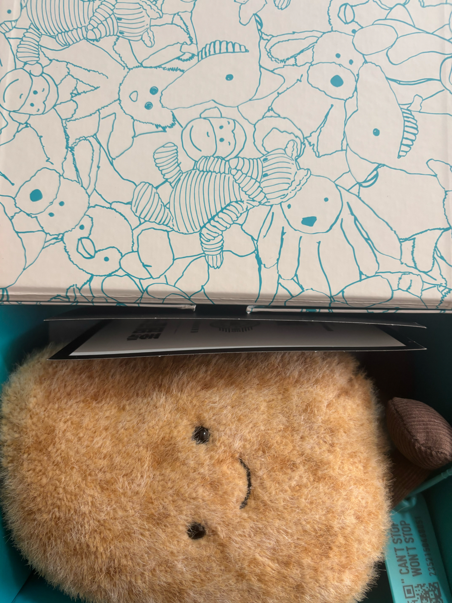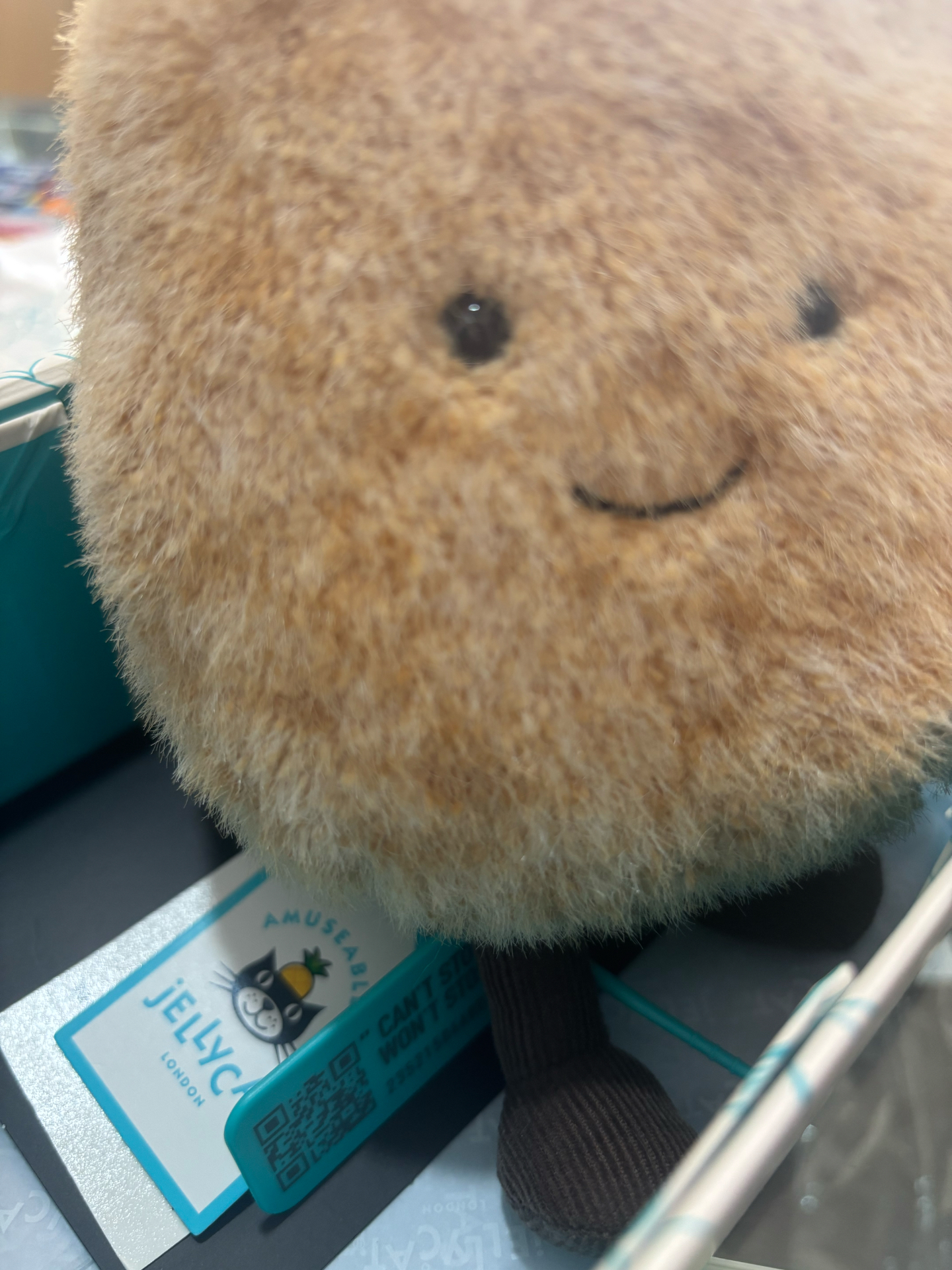 我收到这个毛绒玩具的时候,被包装可爱到了!盒子上满是JELLYCAT家的卡通形象,拆开后这颗“土豆”圆滚滚的,毛毛软乎乎,眼睛和微笑的表情好治愈~不过我觉得它价格不算低,要是预算有限得斟酌下。但喜欢可爱小物件、想给生活添点趣味的朋友,看到它大概率会走不动道,摆在床头或者抱着都很有幸福感,我现在就经常把它放旁边当小陪伴🥰。