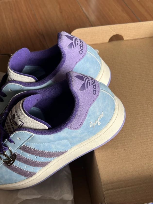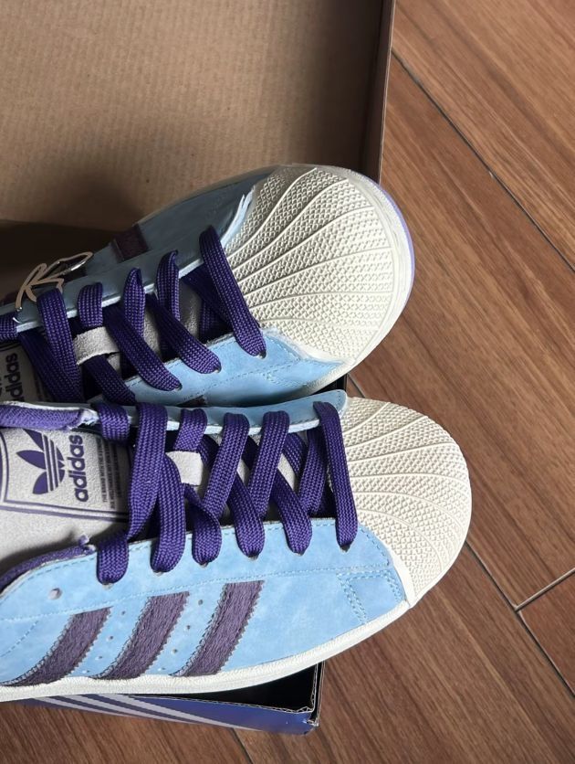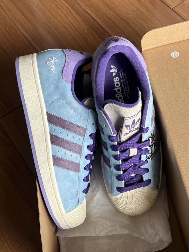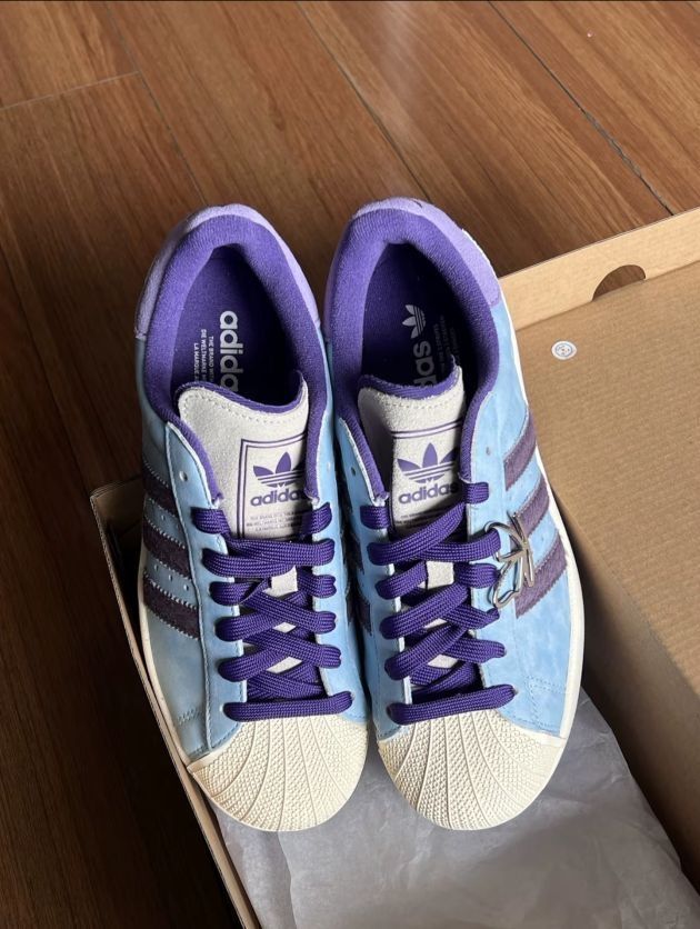 刚拿到这双SYM联名Superstar II贝壳头,哇这蓝紫色调真的绝了!像把晴空和薰衣草紫揉进了鞋面,复古又清新~鞋带上的小蝴蝶装饰是可拆卸的,甜酷随意切换。第一次穿脚感就很轻盈哦,经典贝壳头版型确实舒服,尺码按平常选就刚好。不过麂皮部分有点娇气,下雨天我不太舍得穿,平时拿湿布轻轻擦一下就行。配裙子、牛仔裤都很轻松,属于秋天怎么搭都不出错的那种!