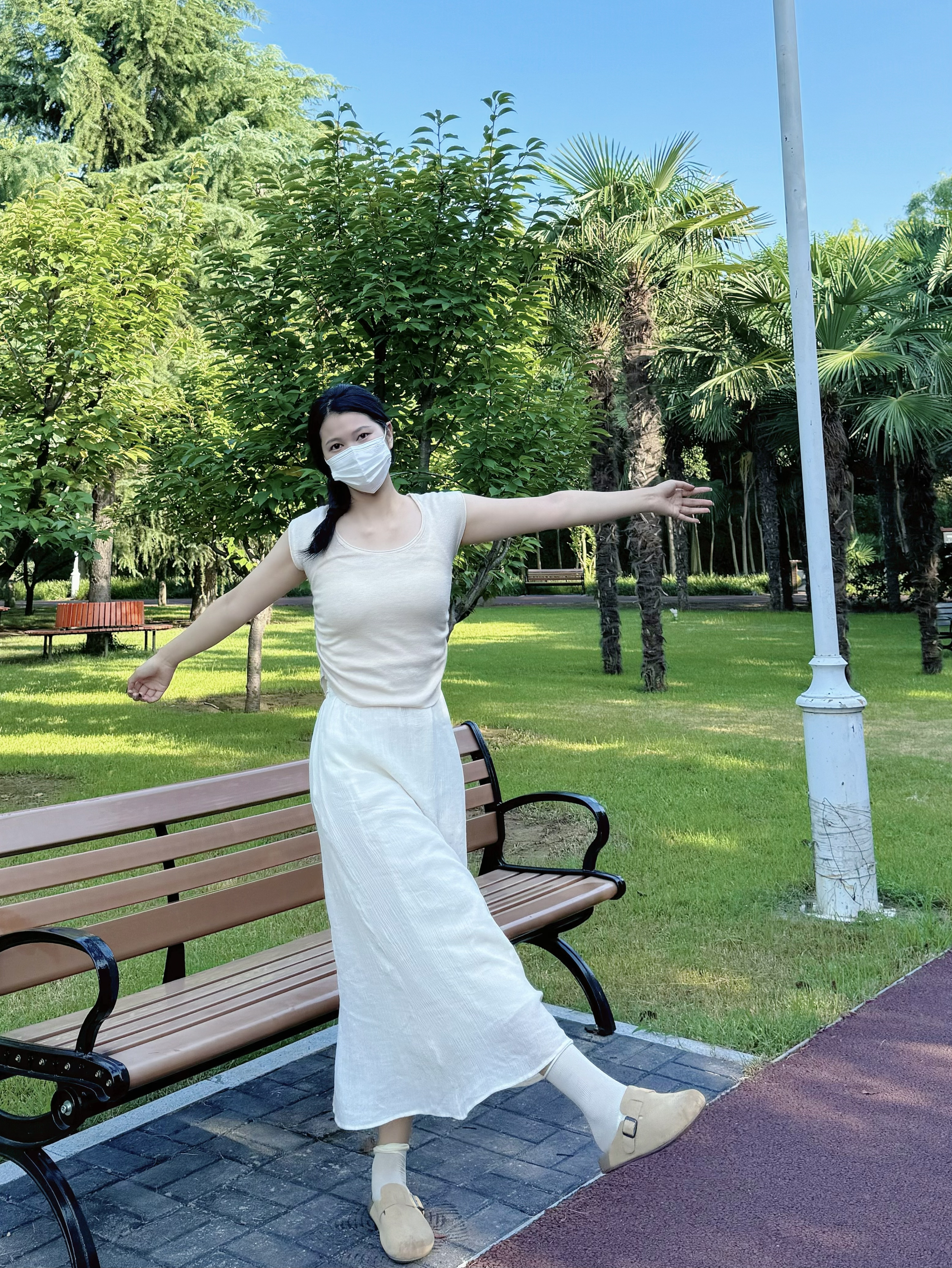 今天是比较简约的基础款搭配 一双黑的洞洞鞋搭配浅蓝色短裤 一件白色的基础款T恤还挺简单的 整体看起来有一种女大的感觉啦~