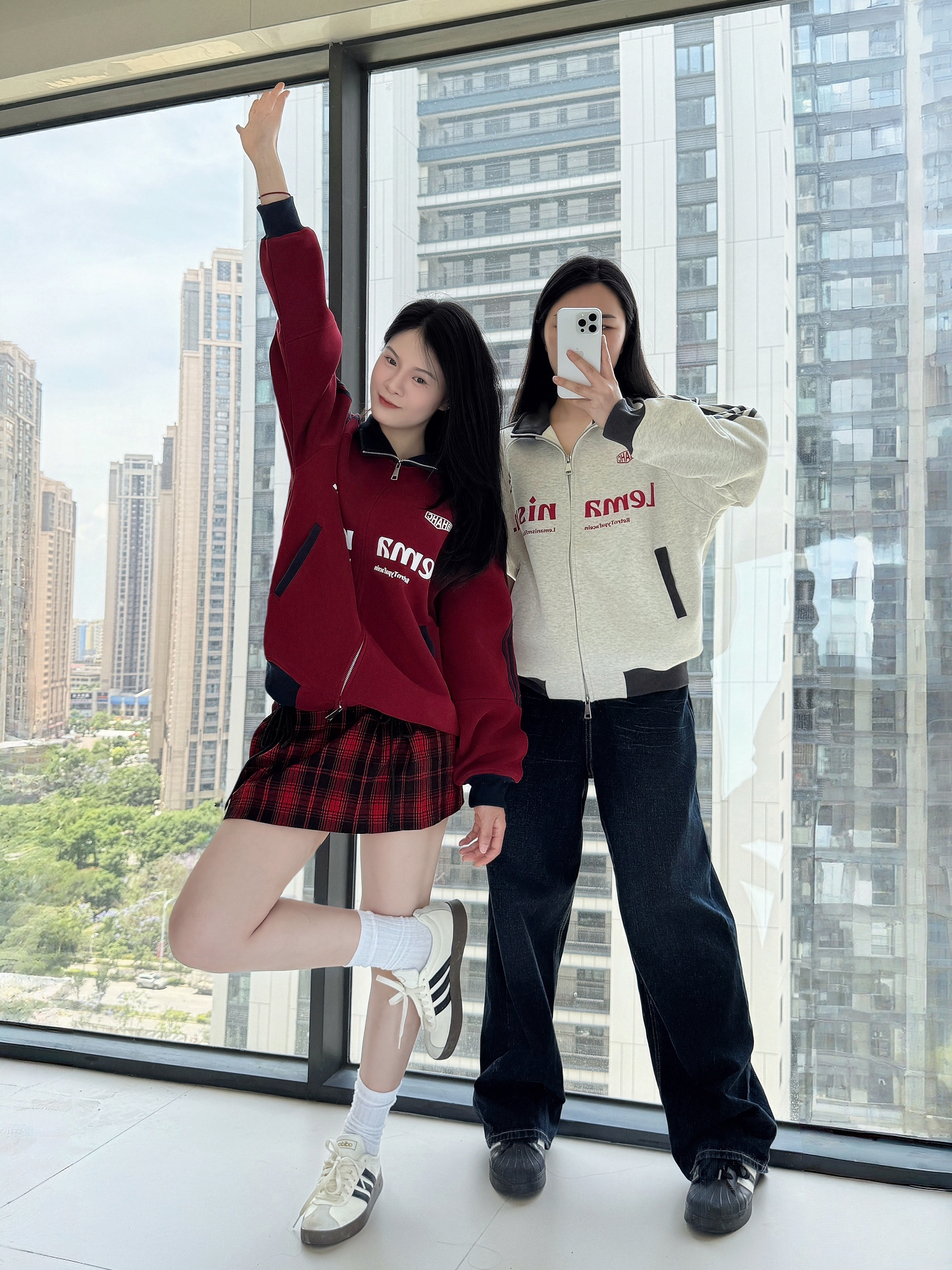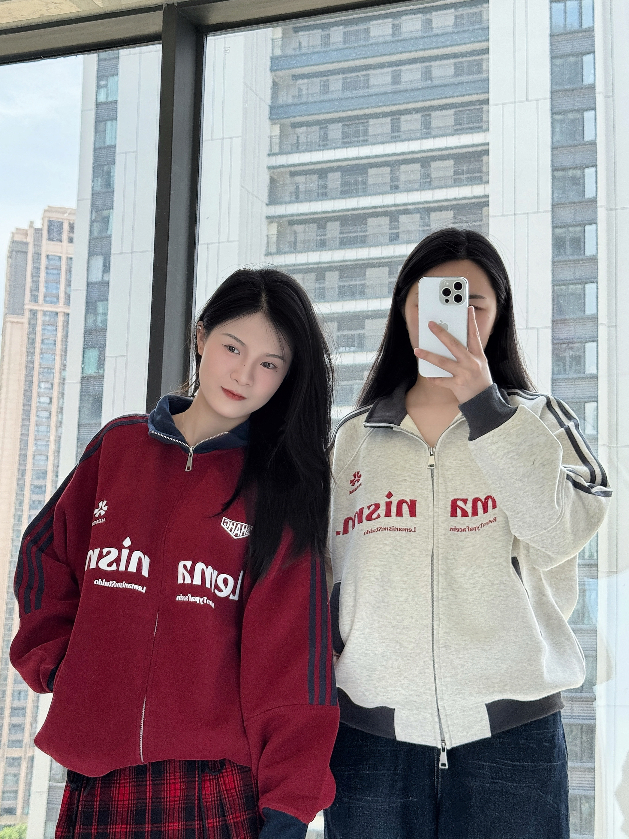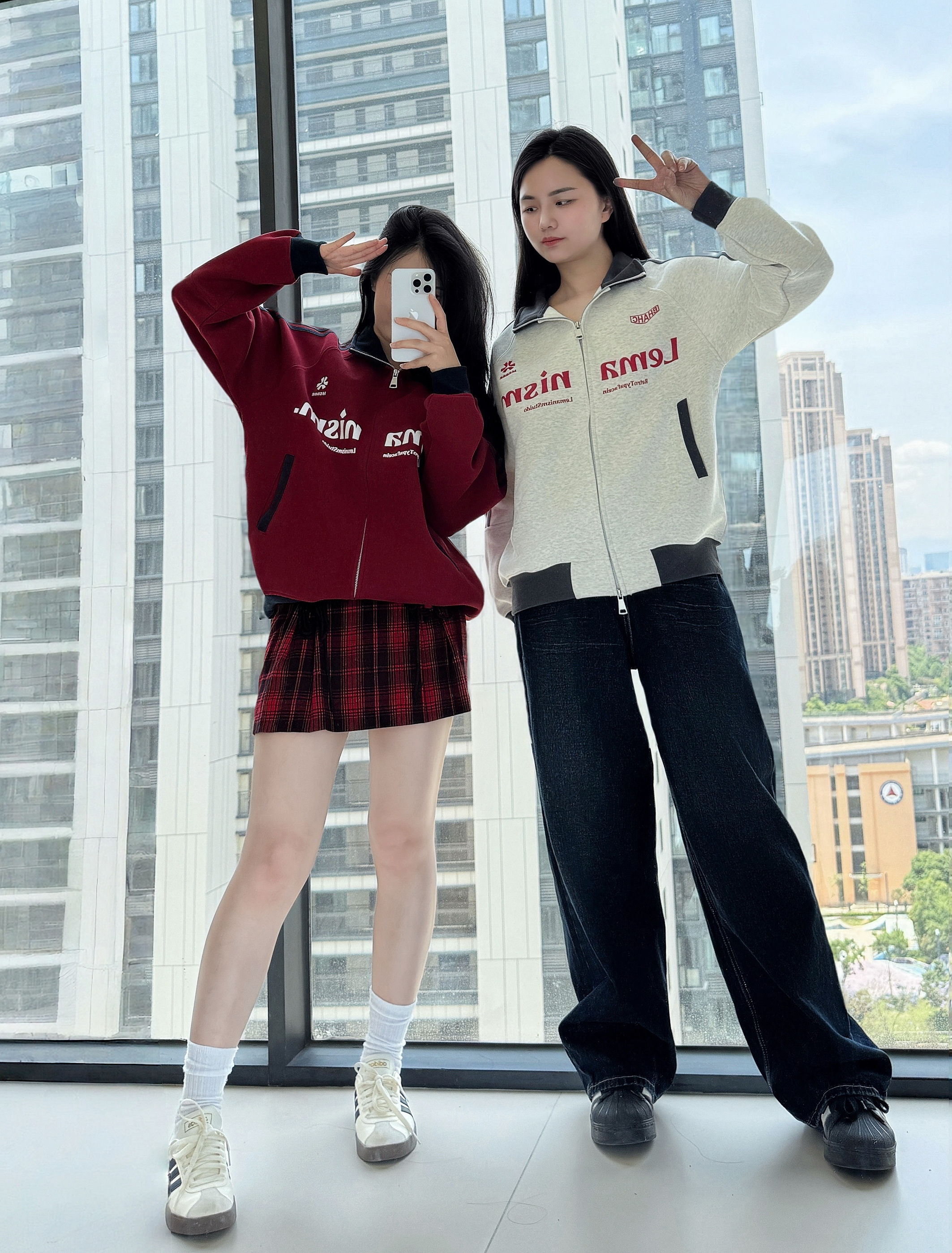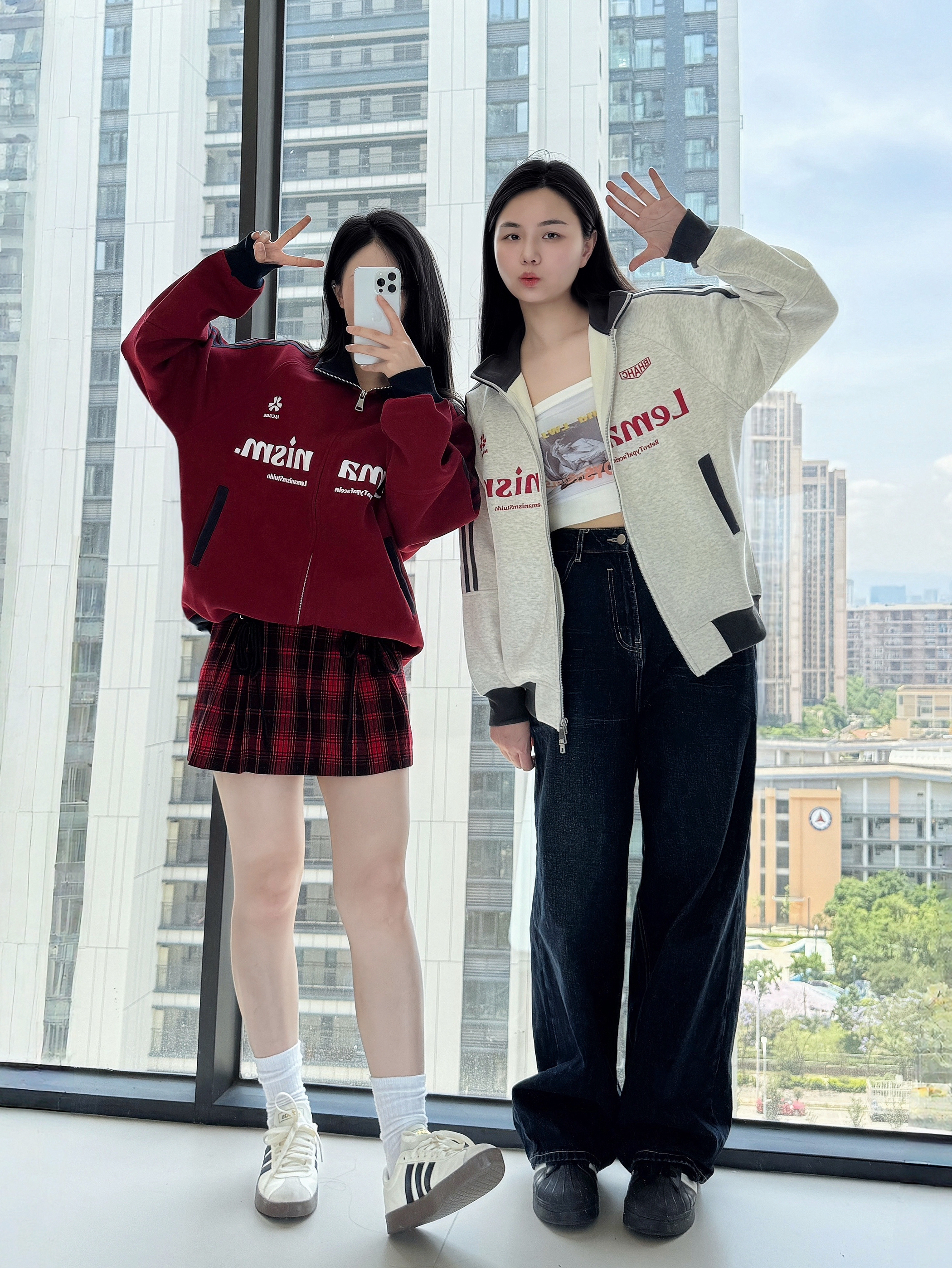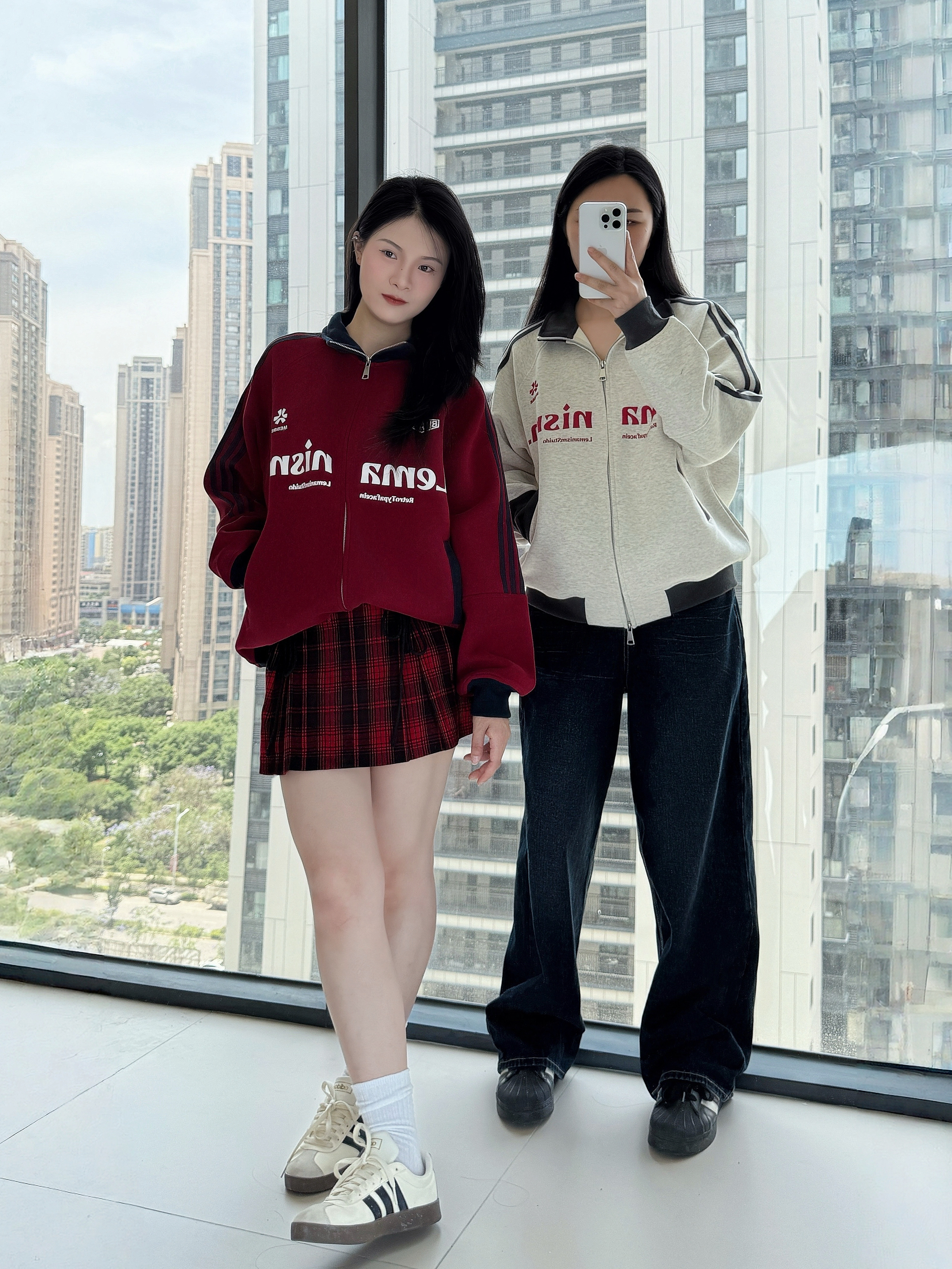 🌧️🌿 🫧🍃 突如其来的降温 又把外套穿起来了 🧥: LEMANISM 美式学院风夹克 复古红和今年流行的花灰色撞色搭配 加上品牌字母的logo创意 亲肤的面料保暖舒适的同时高街感十足💯 👖:搭配同色系红色格纹短裙👗 以及原色阔腿牛仔裤👖 👟:搭配阿迪达斯德训鞋/金标贝壳头