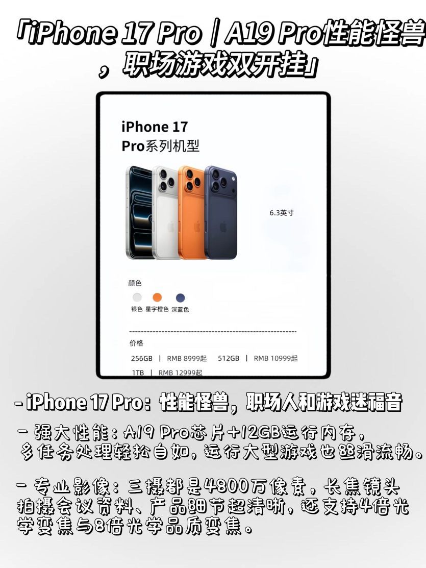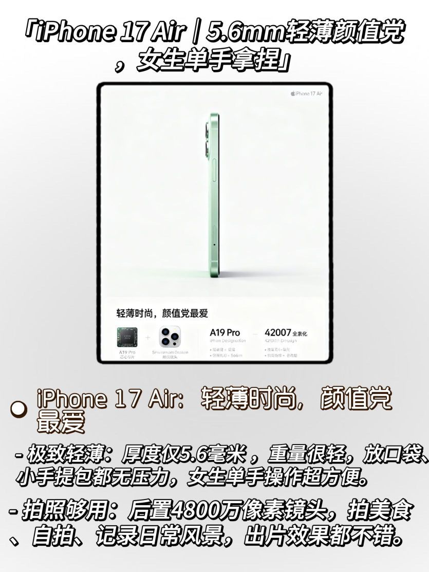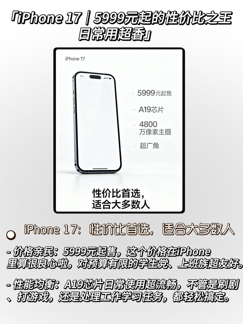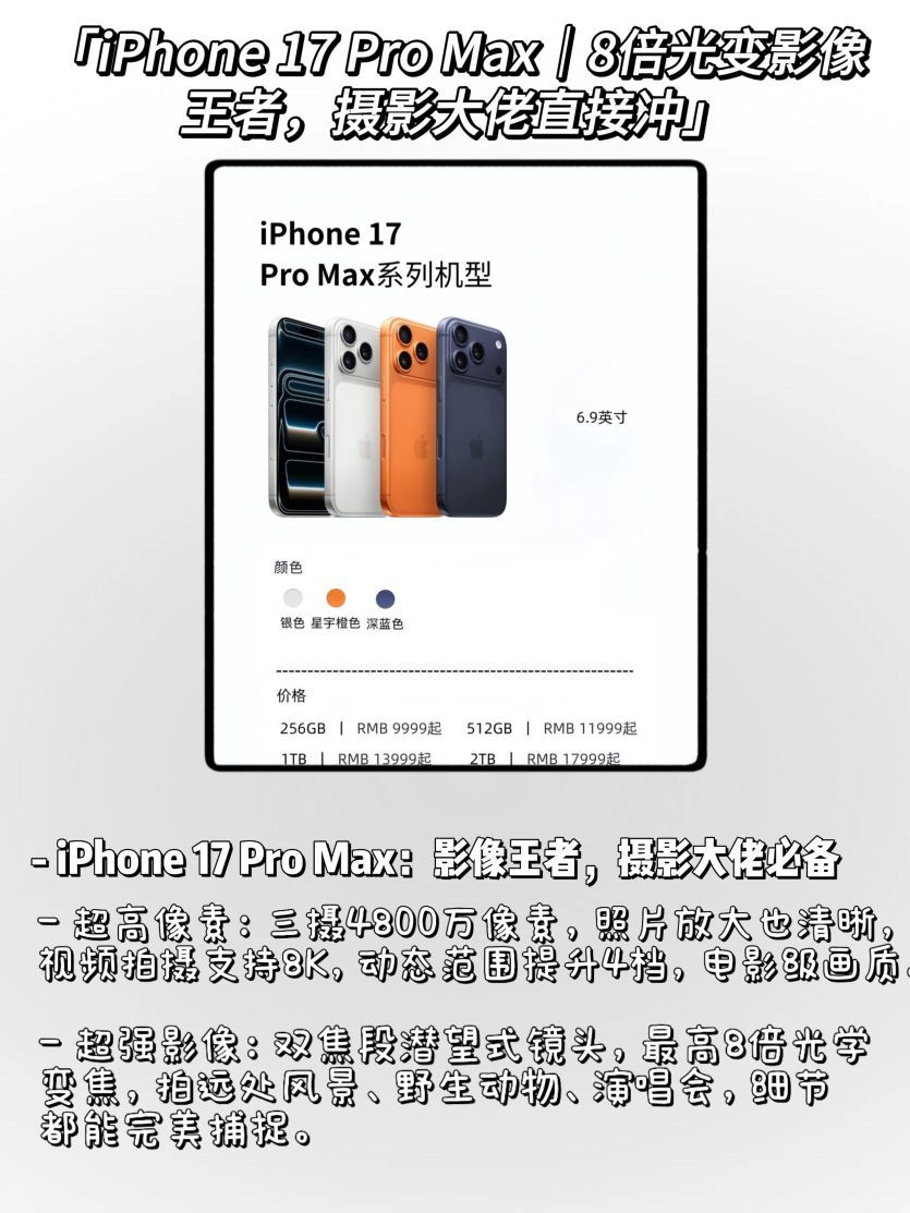 家人们还在纠结iPhone 17买哪款吗?快来对号入座!学生党或预算有限的,选标准版,价格亲民,性能日常够用。追求轻薄的姐妹,Air版超适合,又薄又轻,颜值还高。经常办公、对性能要求高的职场人,Pro版多任务处理超厉害。摄影爱好者直接冲Pro Max,影像能力超强,8倍光学变焦,拍啥都清晰,快来挑出你的心动款吧!