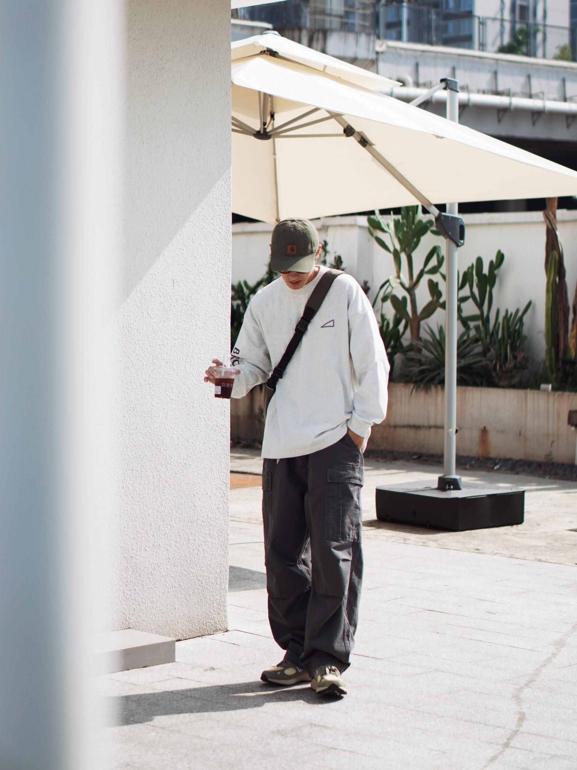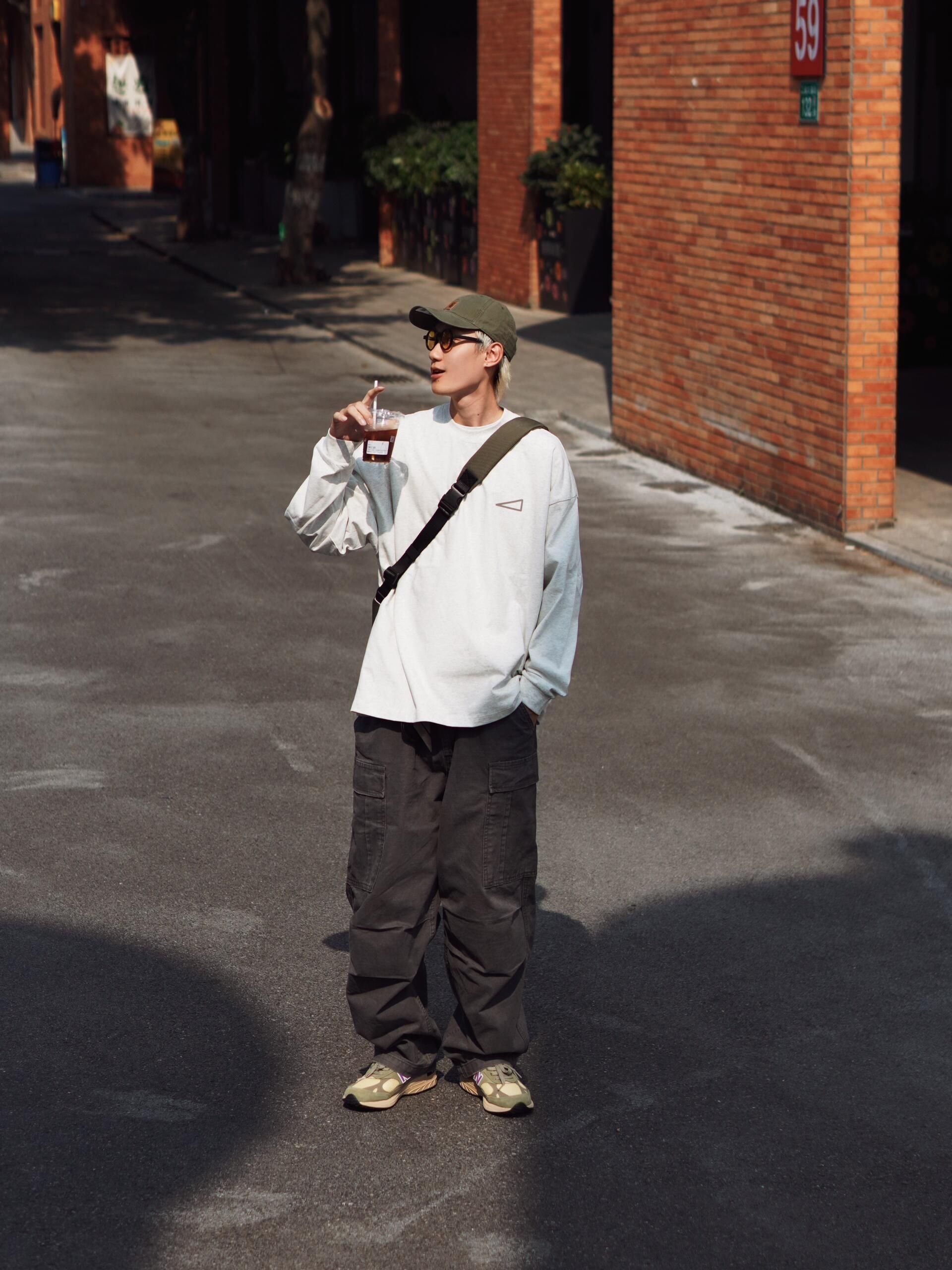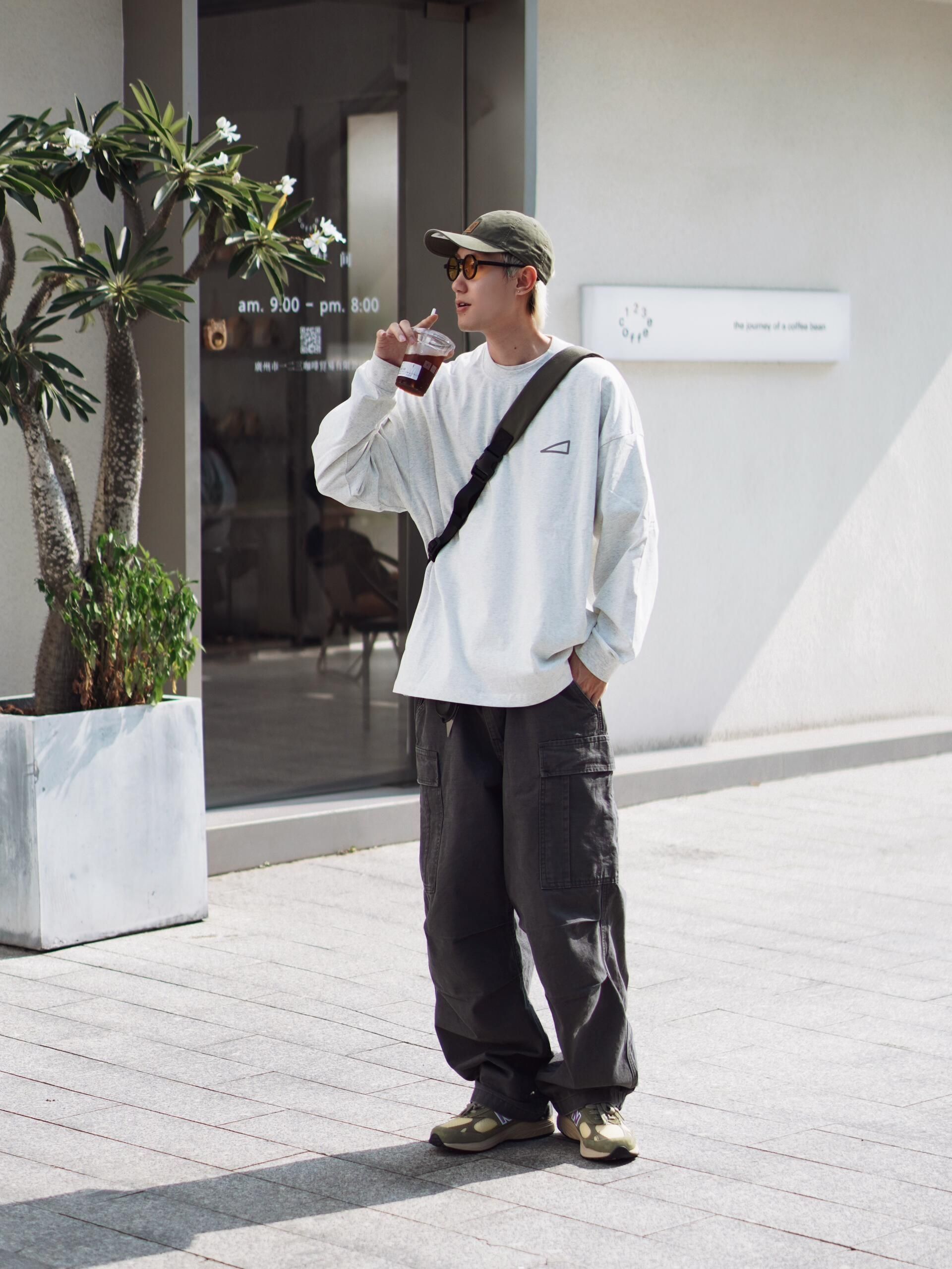 🎈一套慵懒随性的日系工装风穿搭,把秋日的舒适感拉满~ 🎈上衣选了件浅灰色的oversize长袖,宽松的版型自带随性氛围,胸口的小三角标细节感拉满,单穿就很有层次。 🎈下装是深灰色的工装阔腿裤,大口袋设计复古又实用,阔腿的剪裁对各种腿型都很友好,走路带风的感觉谁懂! 🎈搭配了橄榄绿的棒球帽和同色系的老爹鞋,呼应整体色调的同时,让风格更统一。再挎上一个黑色斜挎包,日常出街装个手机、耳机完全...