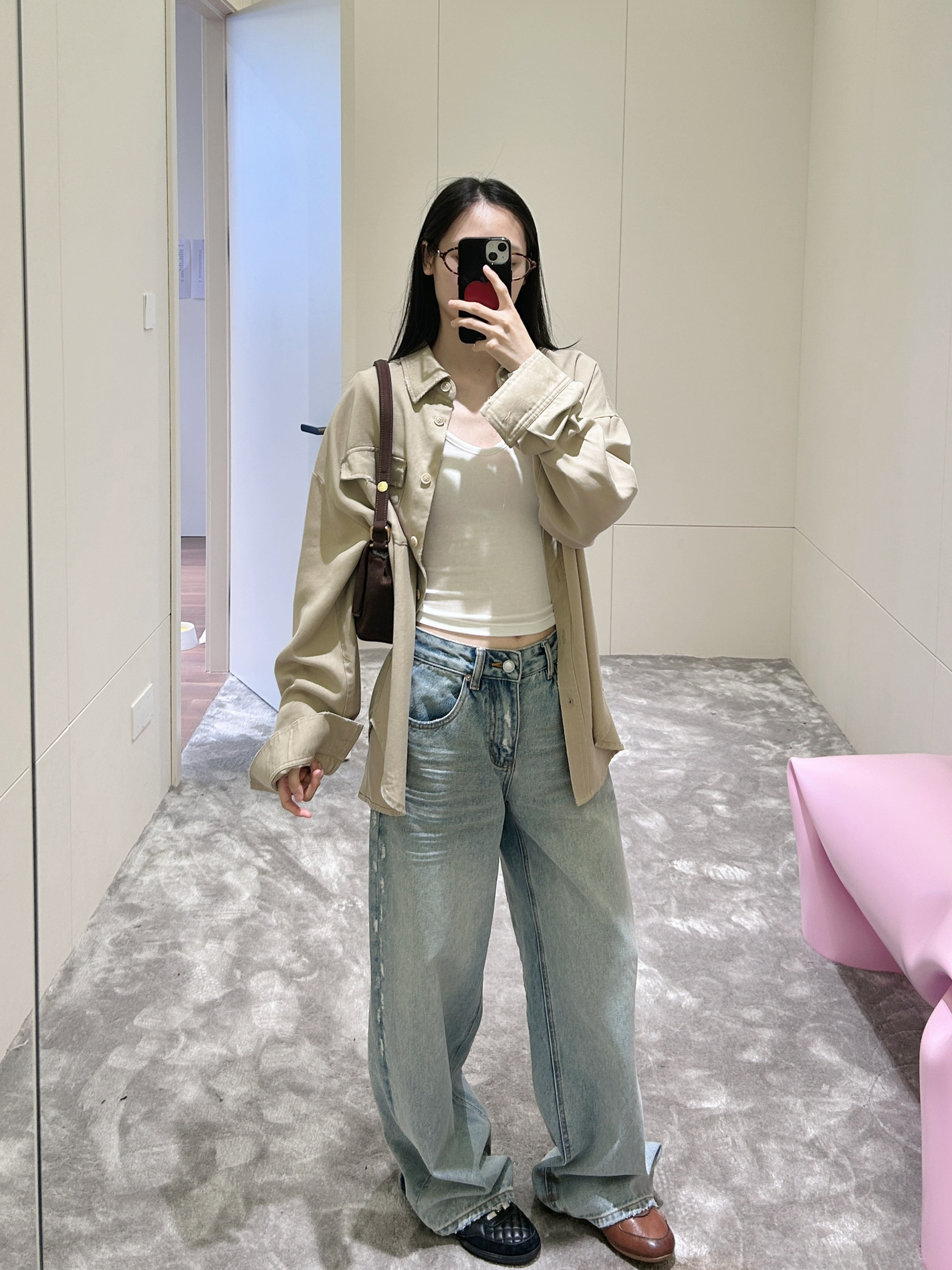 今天尝试了一套日常又很有质感的穿搭~上衣选了件浅卡其色的衬衫,宽松的版型,随性又自在,内搭一件白色小背心,简约又能凸显层次感。下装搭配的是浅蓝色阔腿牛仔裤,宽松的裤型对各种腿型都很友好,还能营造出慵懒的氛围,走路带风超有感觉。脚上穿了一双拼色小皮鞋,为整体造型增添了一丝精致感,再挎上一个棕色的包包,整体色调和谐,日常出街或者通勤都很合适~