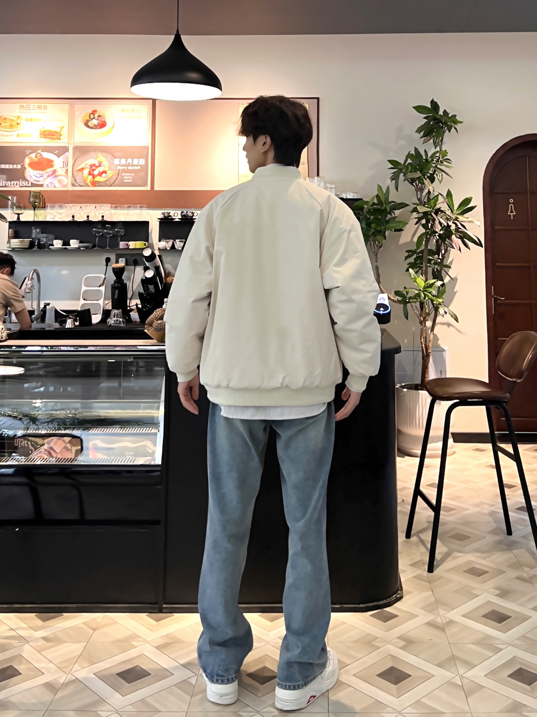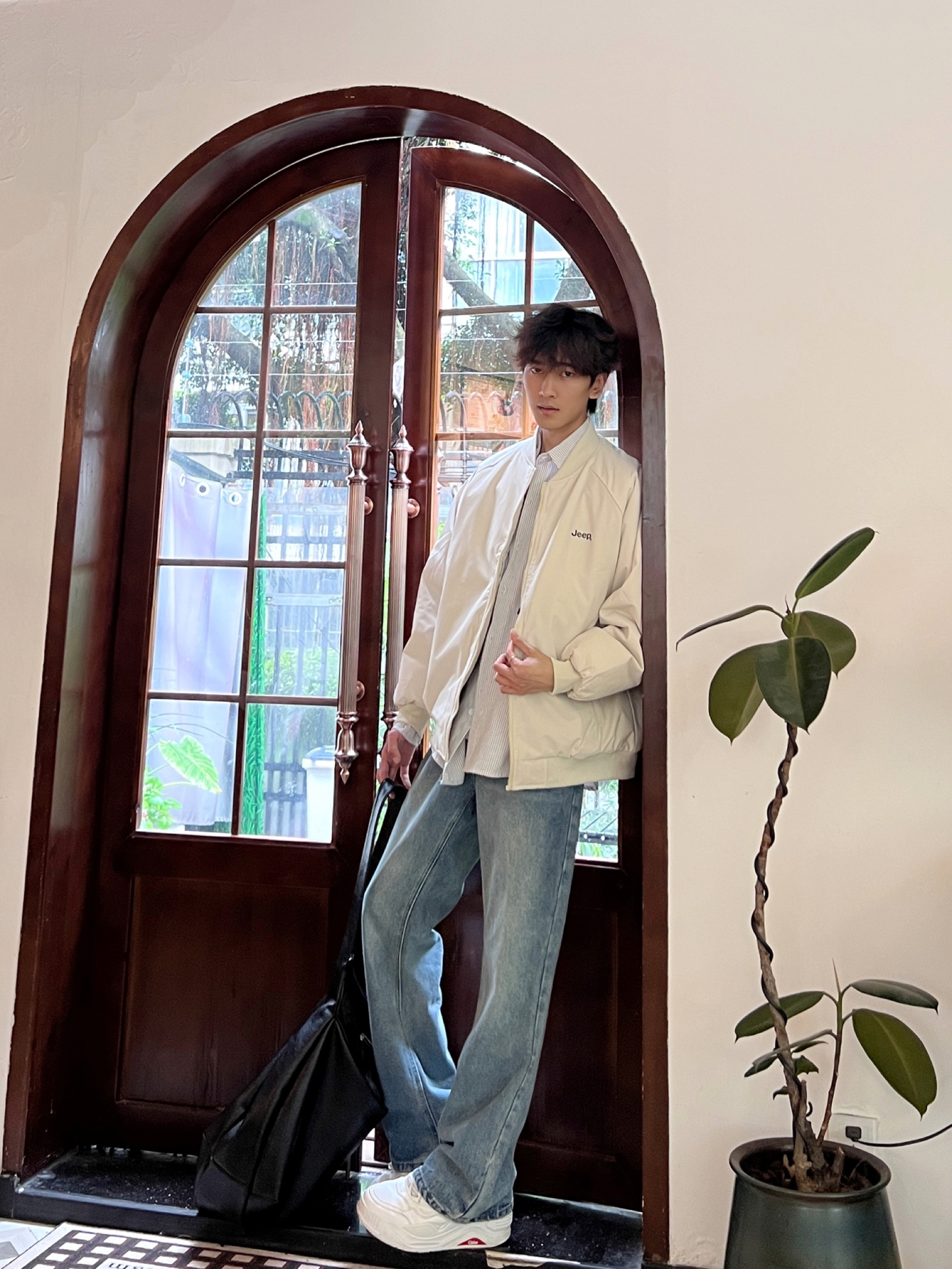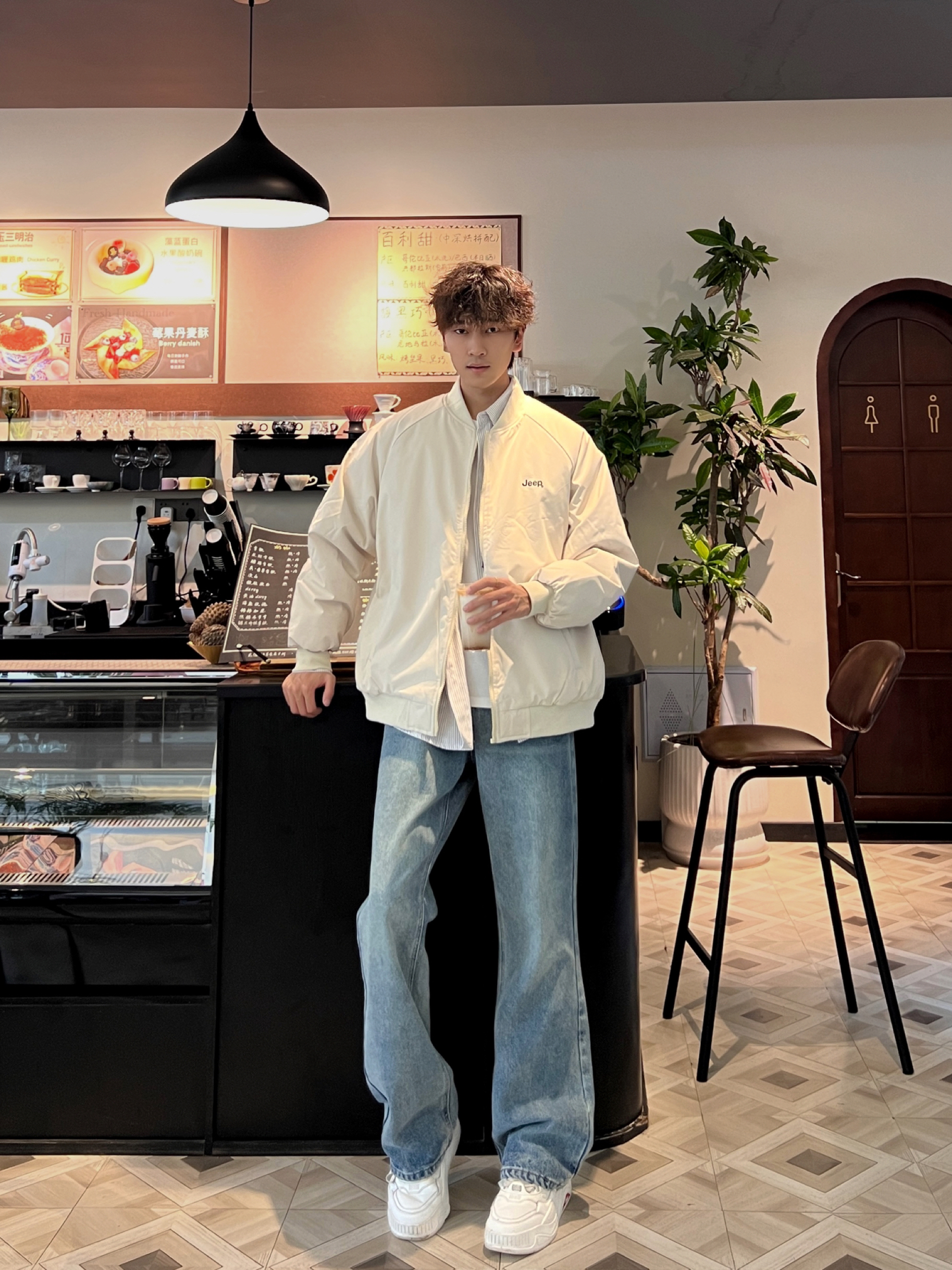 👔白色夹克👖浅蓝色牛仔裤👟白色板鞋 身高180体重110尺码上身L 👔 Jeep家的美式复古工装夹克 纯色系上身简约百搭 内搭多样化 面料柔软舒适 偏短款设计上身显腿长