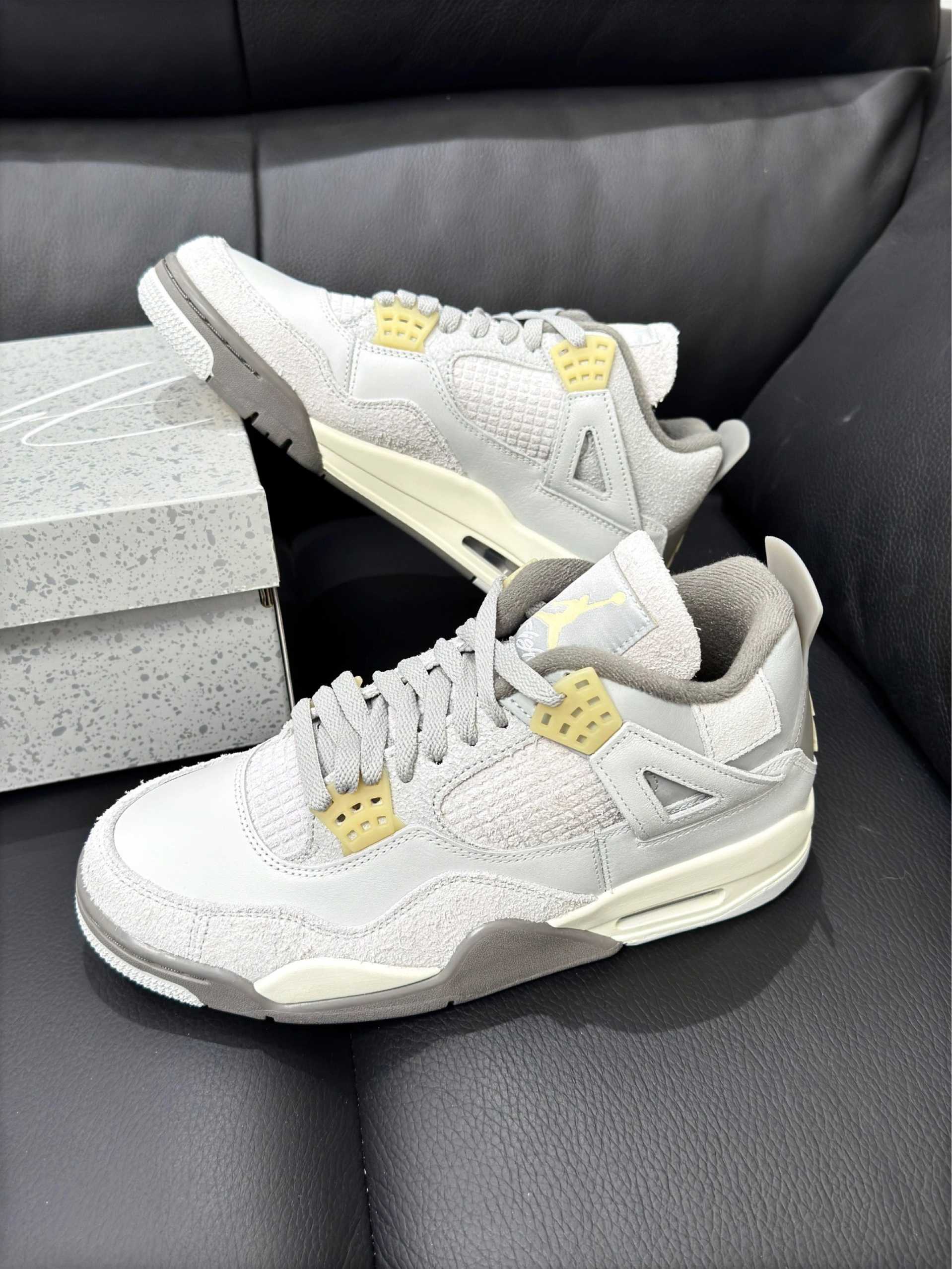 酷帅酷帅的aj4来啦🐰 曾经火的一塌糊涂的鞋子 现在拥有依旧很开心~ 虽然它没有绝杀级别的吸睛力 但是多看几眼,就很耐看👀 整体采用不同的灰色,层次感丰富 鞋面采用翻毛皮+皮革材质,质感满满 整个颜值表现还是很突出的 脚感舒适度没问题,穿搭属于百搭型!