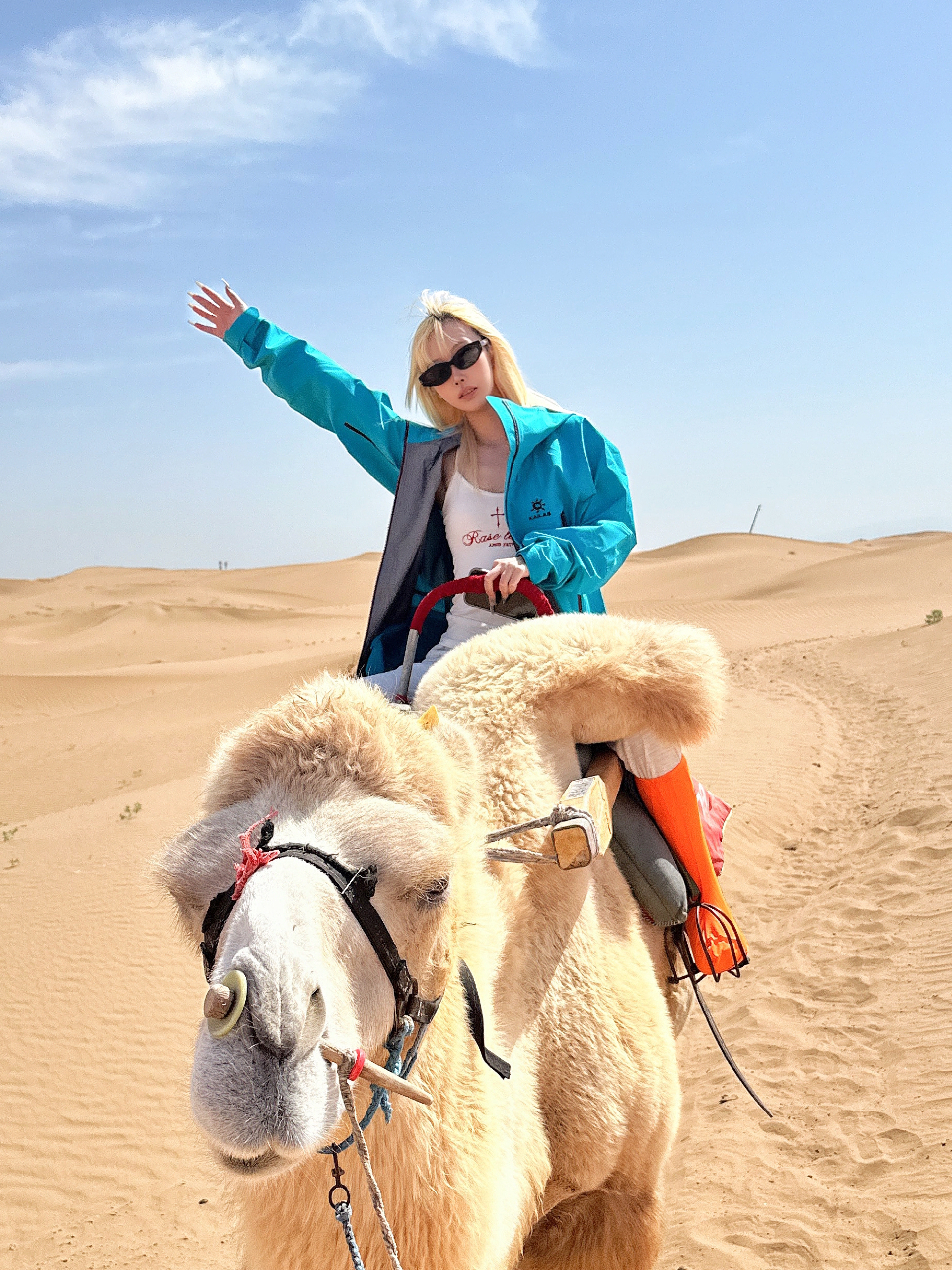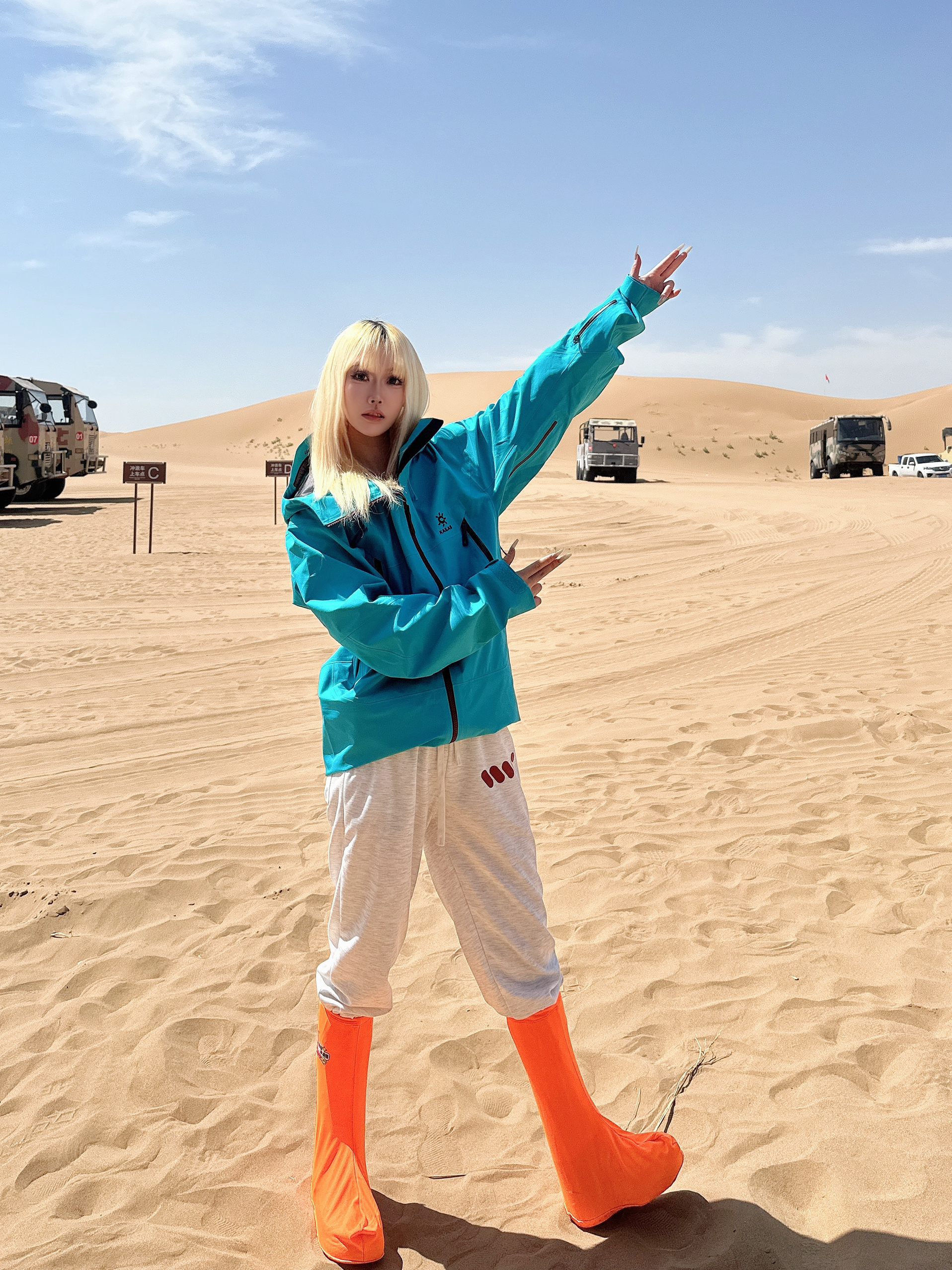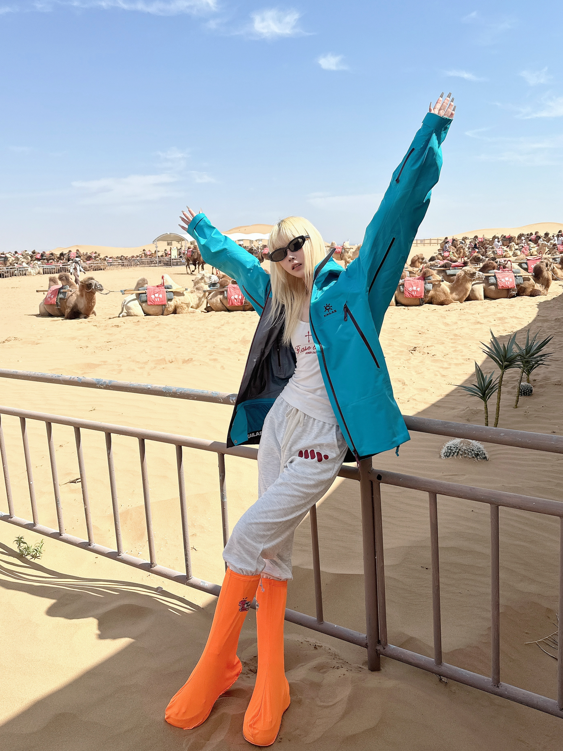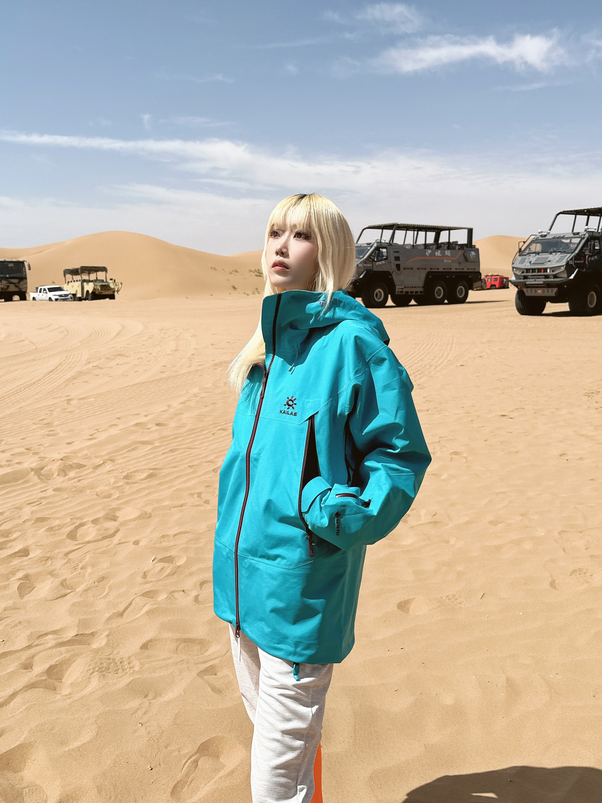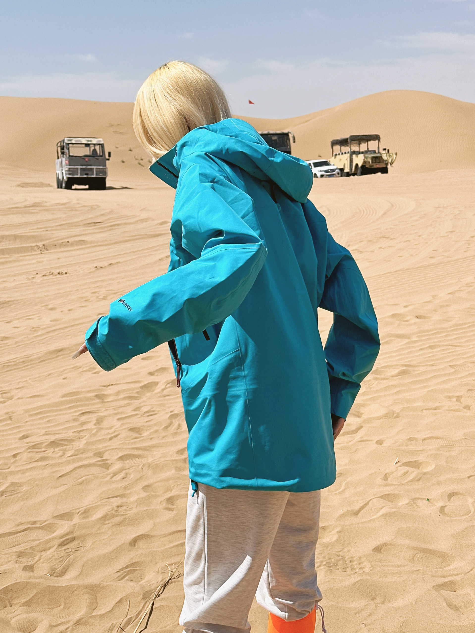 这件硬壳冲锋衣真的救了大命!! 沙坡头狂风乱吹 我躲在帽子里稳稳的🌪️ 透气真的可 沙漠暴走一天也没闷汗 一身轻便还防晒 蓝色在黄沙里意外出片📸 活动超自如 随便一拍都是户外大片感✨ 9月15全网首发!!还不赶紧冲 是真上镜的旅行穿搭❄️