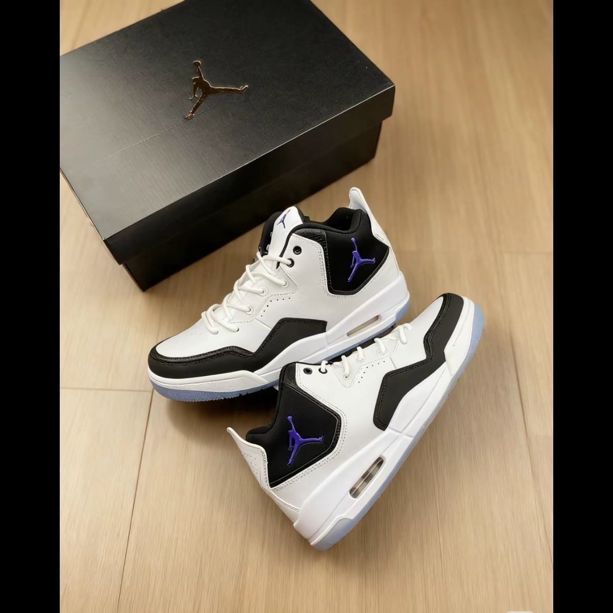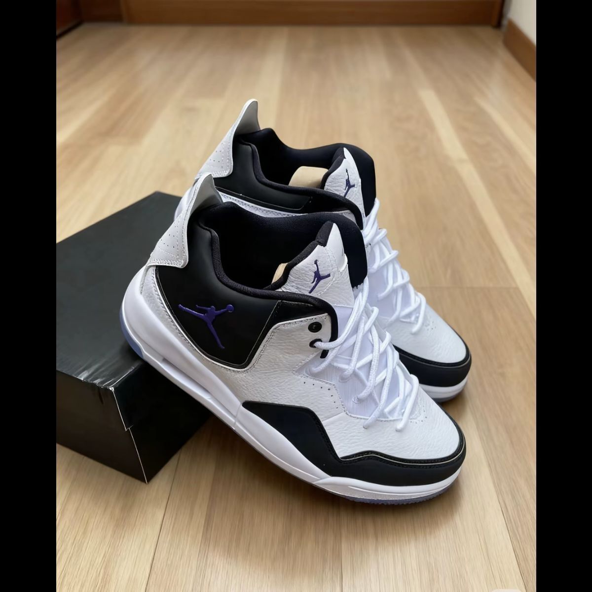 拿到Jordan Courtside 23 Concord时,指尖最先触到的皮革质感很扎实,不是轻飘飘的那种。黑白主调混着几处紫标,复古味儿一下子就出来了,像从老篮球杂志的插图里“抠”出来的鞋型。中帮设计挺贴心,日常走路或者去球场随便投投篮,脚踝被裹着的感觉很踏实。最惊喜的是鞋底防滑,有回下雨天踩在光溜溜的地面上,也没打滑,安全感给够了。复古款的好处就是百搭,牛仔裤、运动裤往上一搭都不违和,属于那...