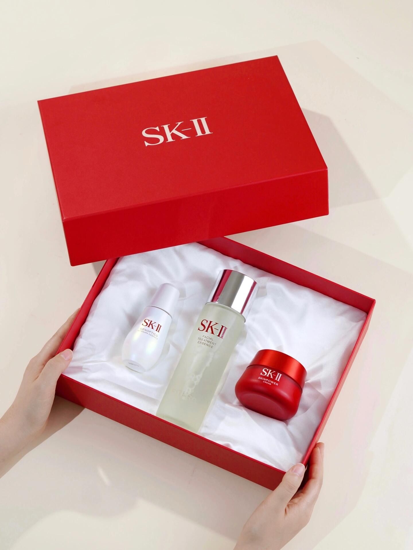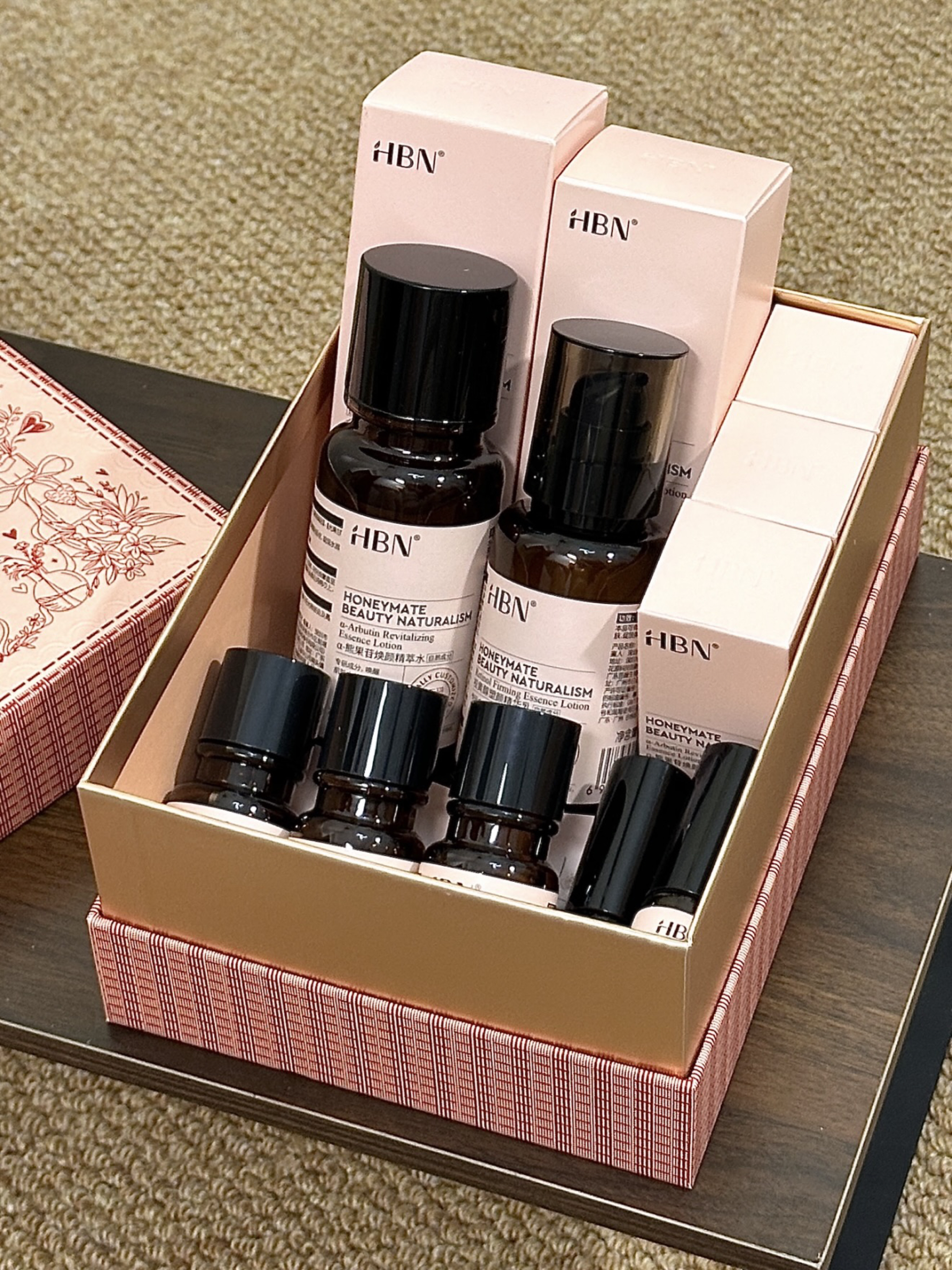 就是HBN介套限定礼盒🎁 包装粉嫩精致 浪漫氛围拉满! 里面有发光水和精华乳,还送了贼多小样 发光水质地清爽 用前我会摇一摇 激活里面的小气泡 熬夜后我还会用它湿敷 补水去黄敲管用! 精华乳是淡黄色乳液质地 很好推开 还带着黄金微粒 真是抗老紧致界的老大哥~ 坚持每天用 皮肤状态是焕亮水嫩了不少 再也不怕熬夜后垮脸暗沉! 不敢想女孩子收到有多幸福~