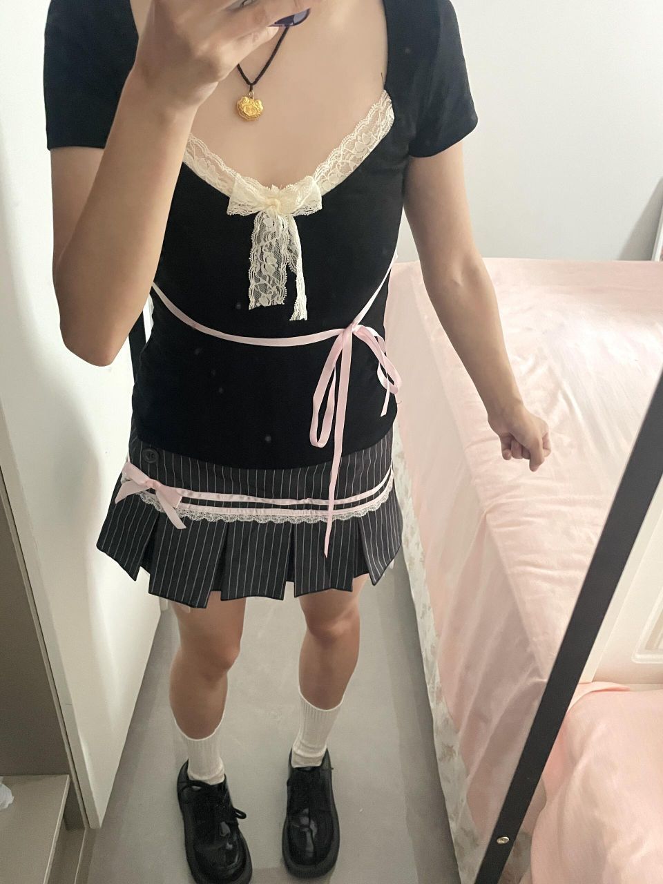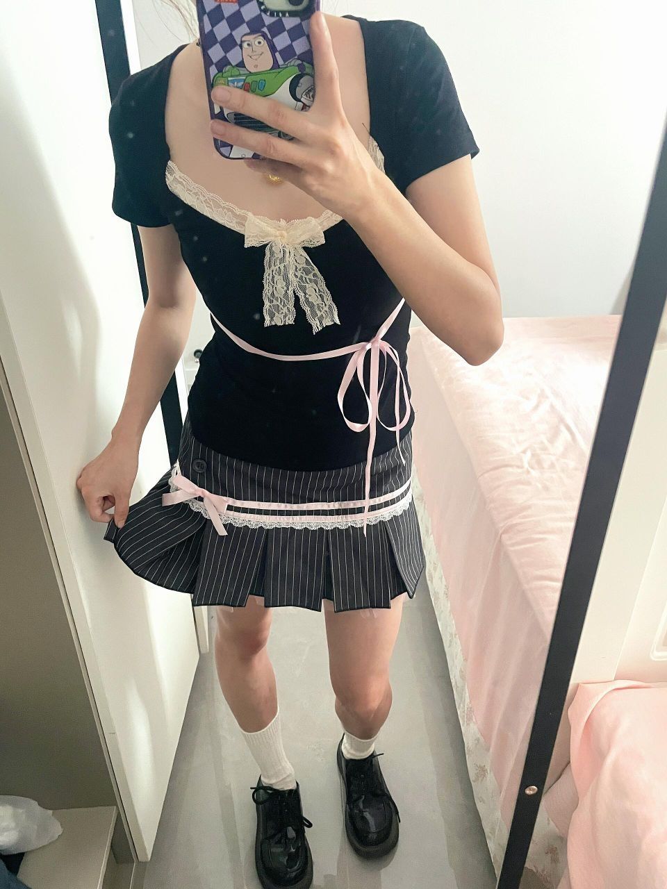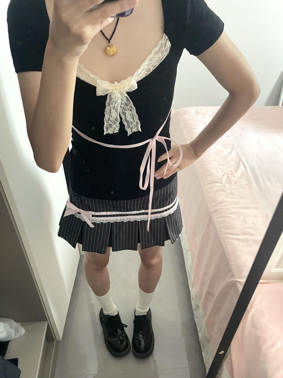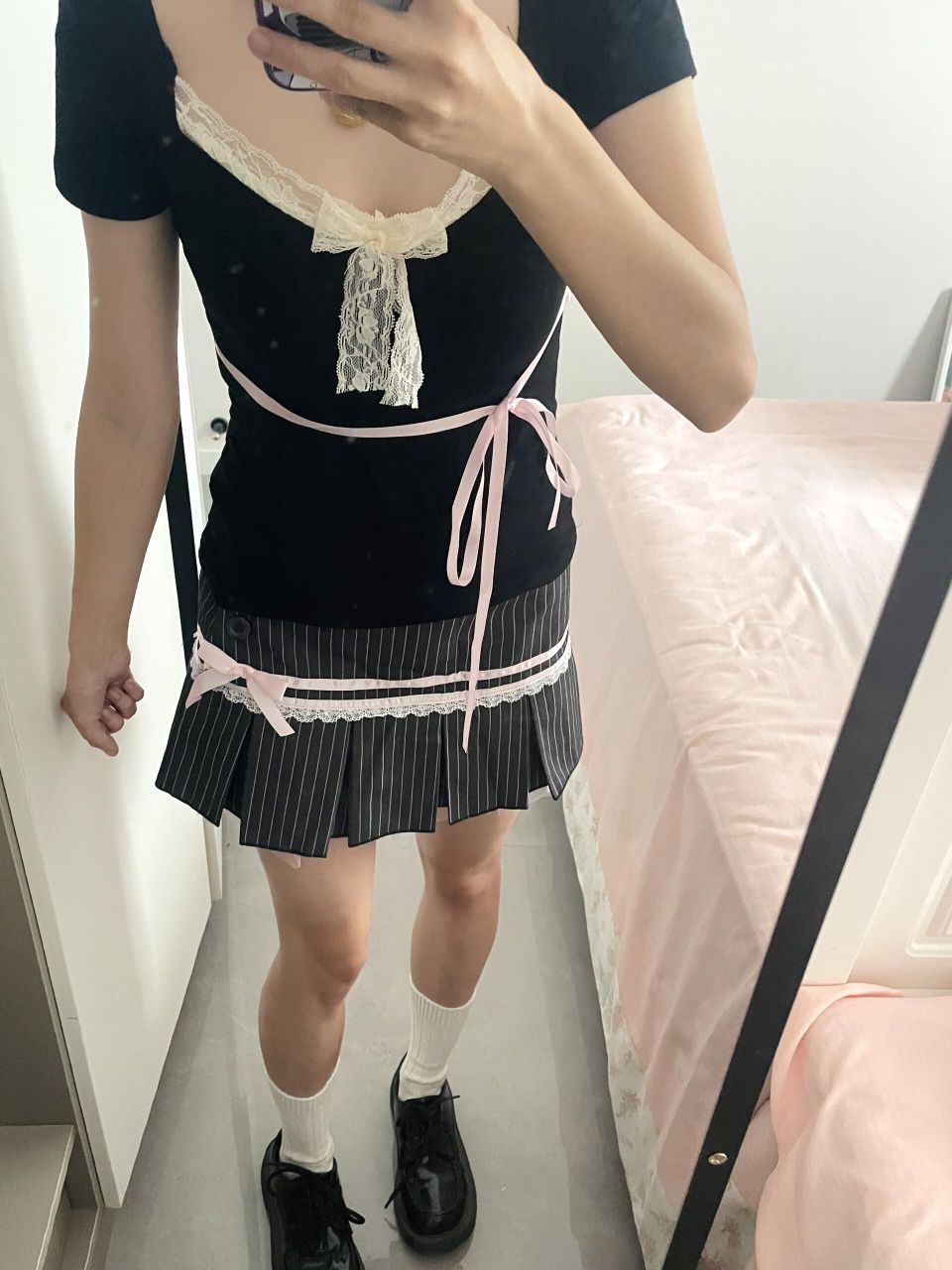 甜美蕾丝拼接蝴蝶结系带t搭配短袖,一身下来真的超好看,姐妹们无脑冲