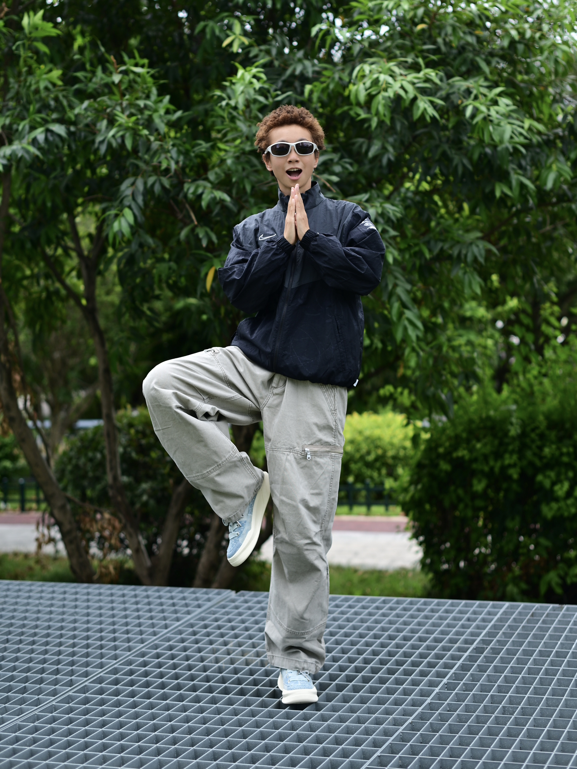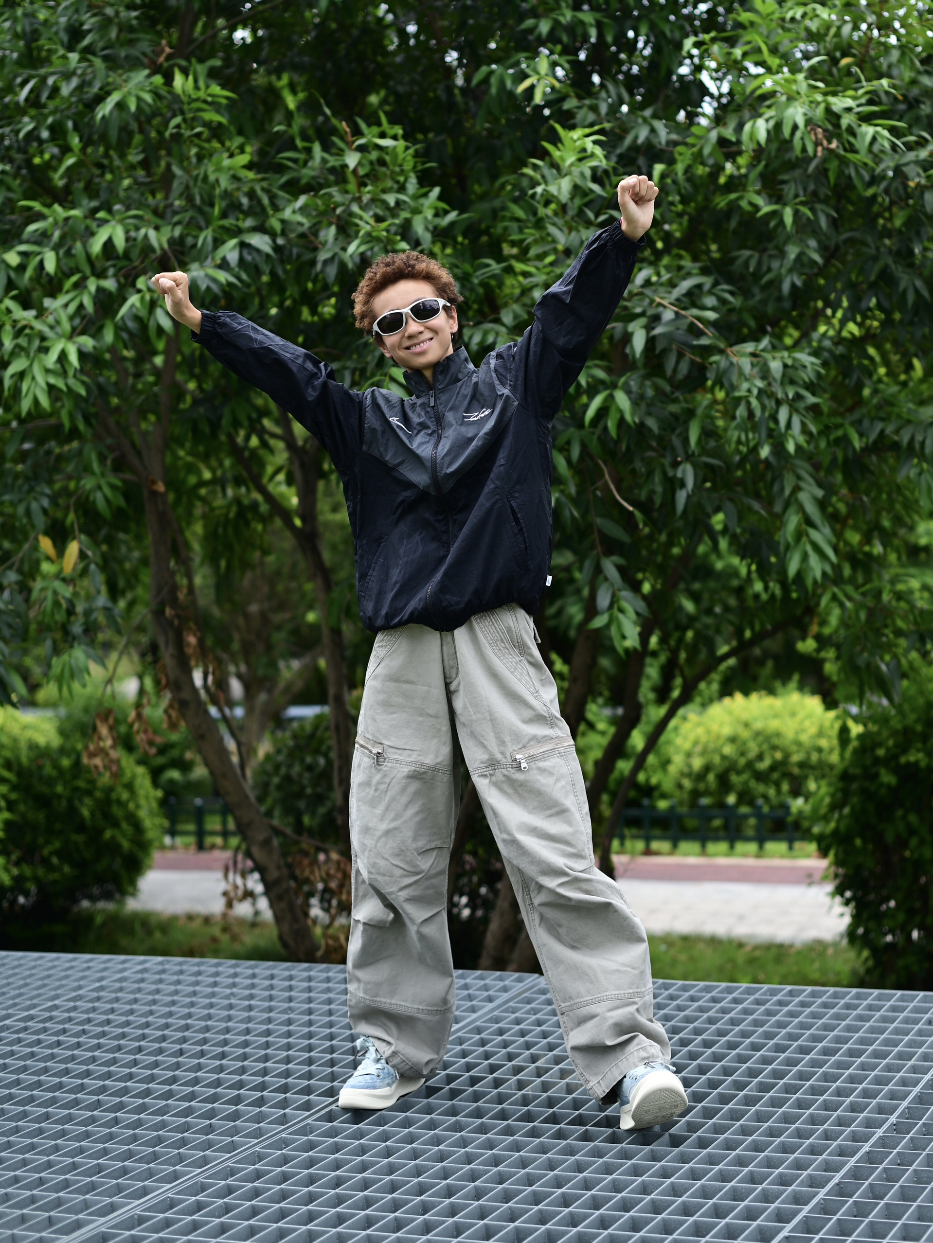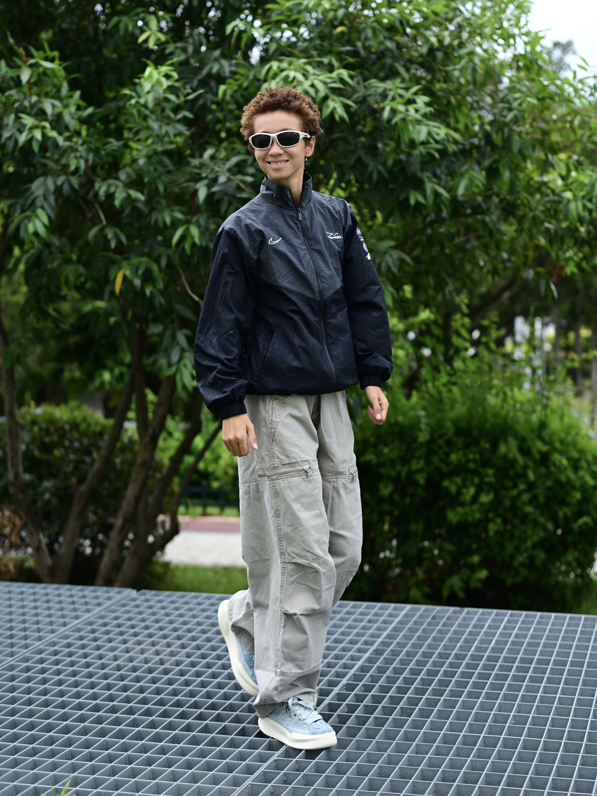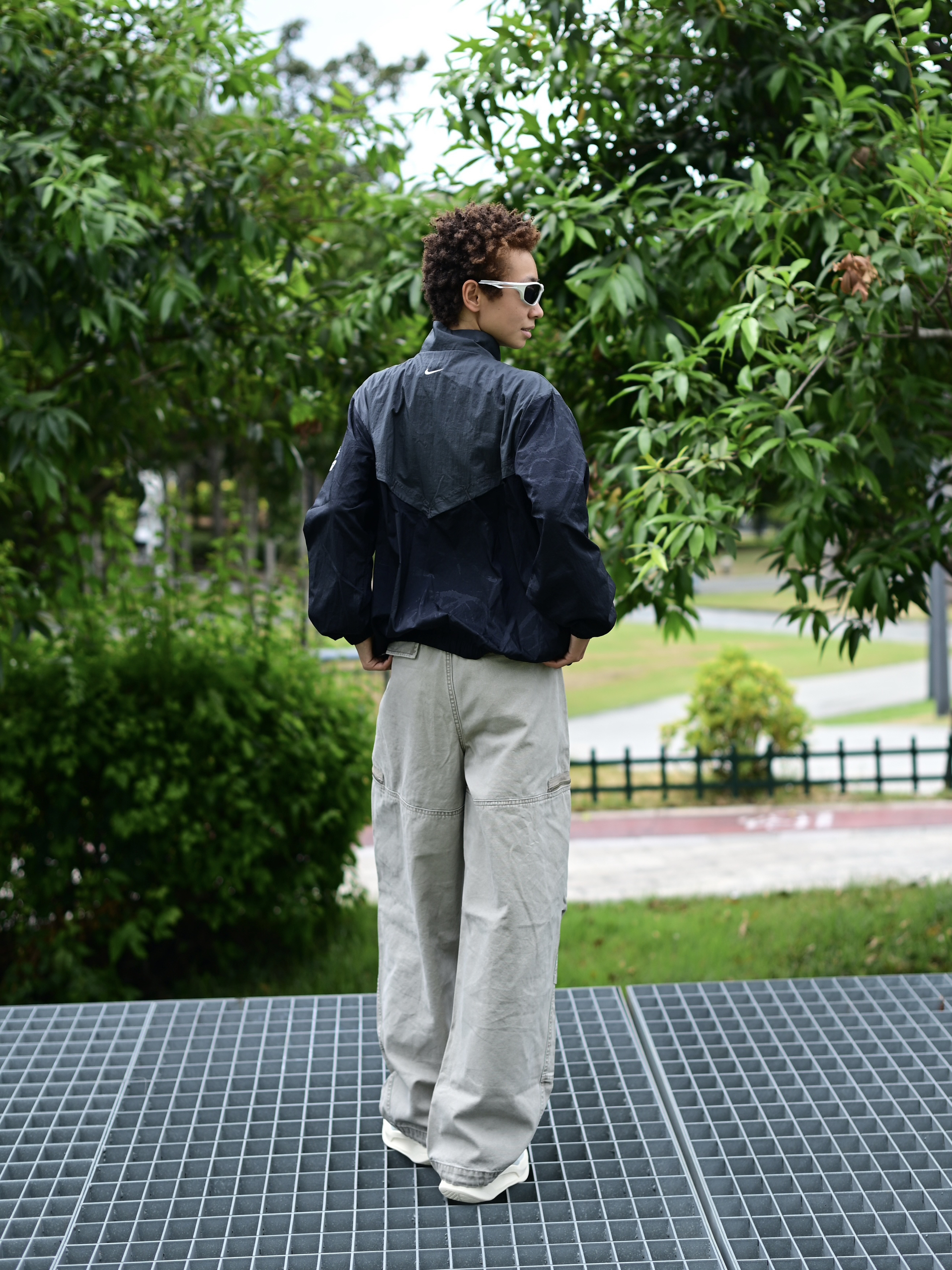 欢迎进入哇圆哇圆哒的穿搭分享频道 172CM|55KG 👔:m👖:m|👟:39码 上身黑色复古外套 复古调拉满了耶 下半身搭配灰色工装长裤 穿上俺的冰蓝系板鞋 出门咯~