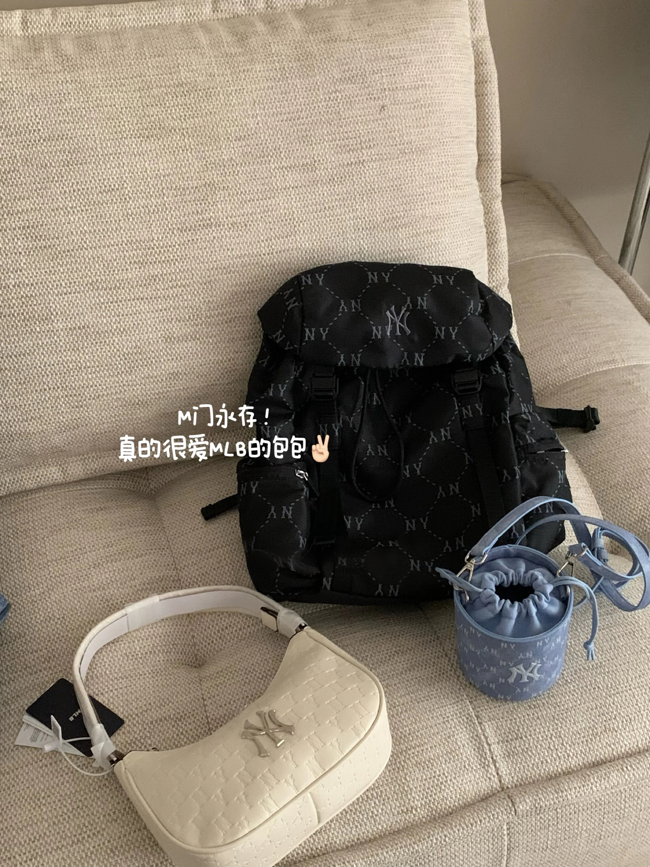 中午好啊姐妹们👭 今天给大家分享几只氛围感mlb👜 💡搭配小心机 • 腋下包搭配小香风外套或针织衫 秒变气质女神 • 小背包搭配卫衣 牛仔裤 潮酷感十足 • 托特包搭配西装或连衣裙 通勤约会都能hold住 ⚠️温馨提示 • 包包材质多为pu和帆布,日常用湿布擦拭即可,避免暴晒和接触尖锐物品。