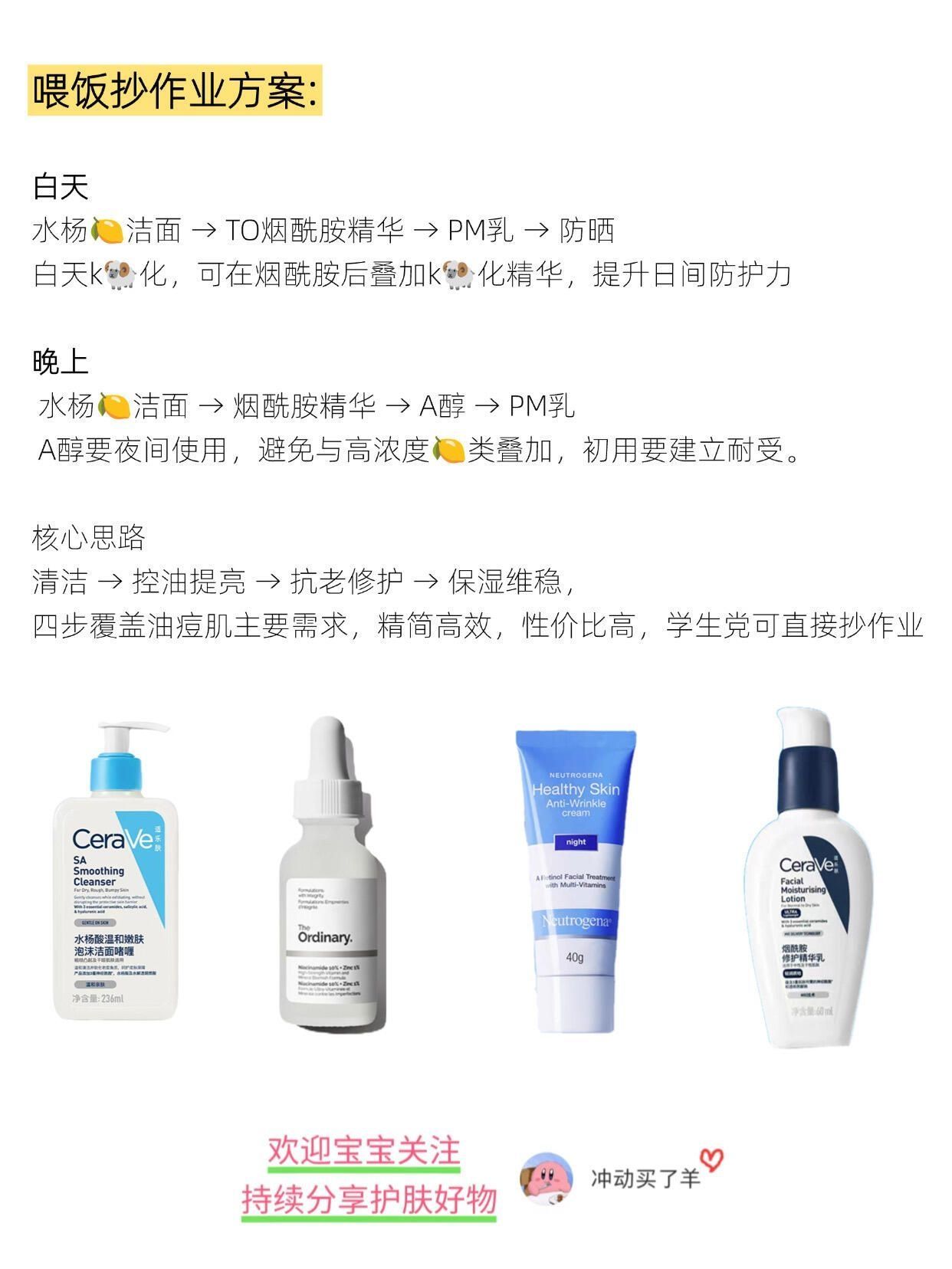 油痘肌护肤其实没有那么麻烦, 这四个性价比的经典产品只有油痘肌才能懂, 油痘肌直接🔒住,让你低成本高收益护肤! (无广!有广吃s!) 控油,k老,祛痘,美白提亮全拿下 ①水杨🍋洁面(控油清洁) ②To烟酰胺(控油美白) ③小蓝管A醇(k老) ④pm(保湿维稳) 喂饭抄作业方案: 白天 水杨🍋洁面 → TO烟酰胺精华 → PM乳 → 防晒 白天k🐏化,可在烟酰胺后叠加k🐏化精华,提升日间防护力 晚...
