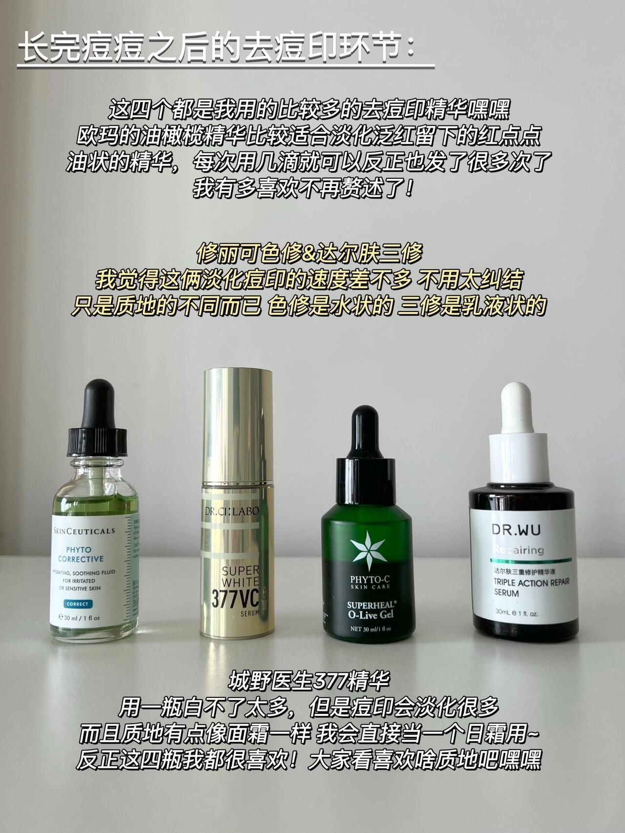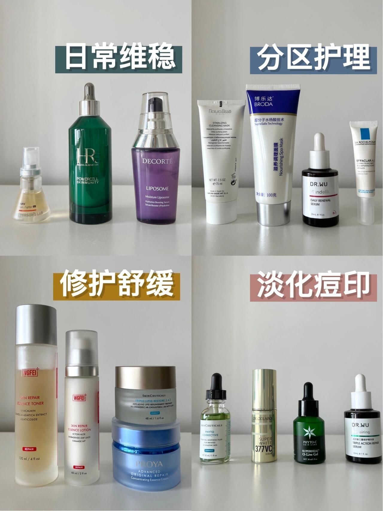 按图片顺序: 1.毕生之研五环精华2.0 赫莲娜绿宝瓶精华,黛珂小紫瓶精华 2.悦碧施清洁面膜,博乐达面膜,达尔肤杏仁酸精华,理肤泉ai乳 3.威格菲水乳,修丽可242面霜,珀莱雅源力面霜 4.修丽可色修精华,城野医生377,欧玛油橄榄精华,达尔肤三修精华