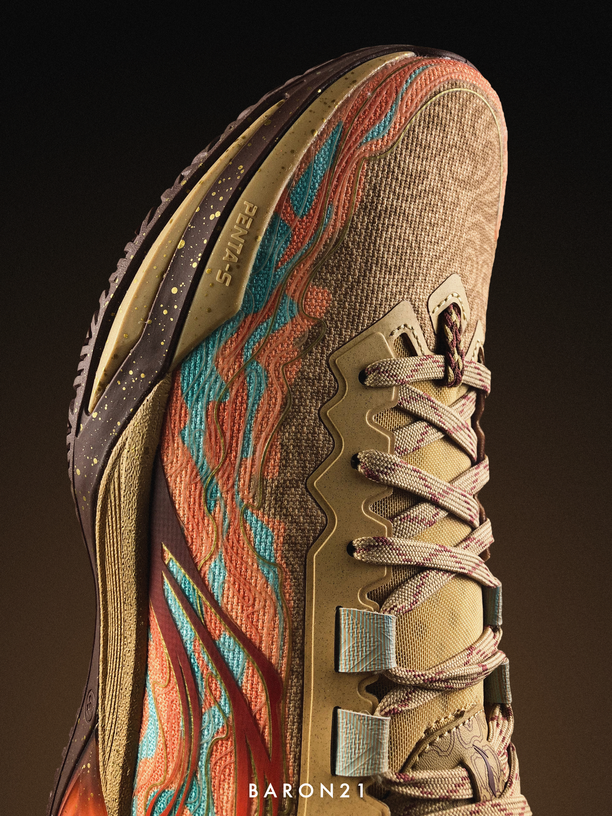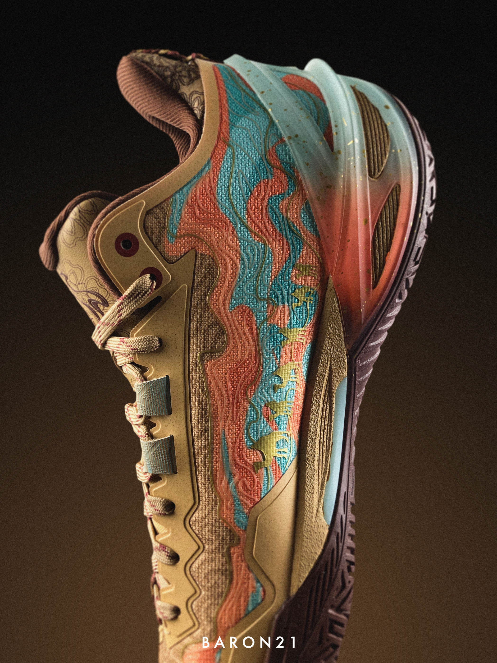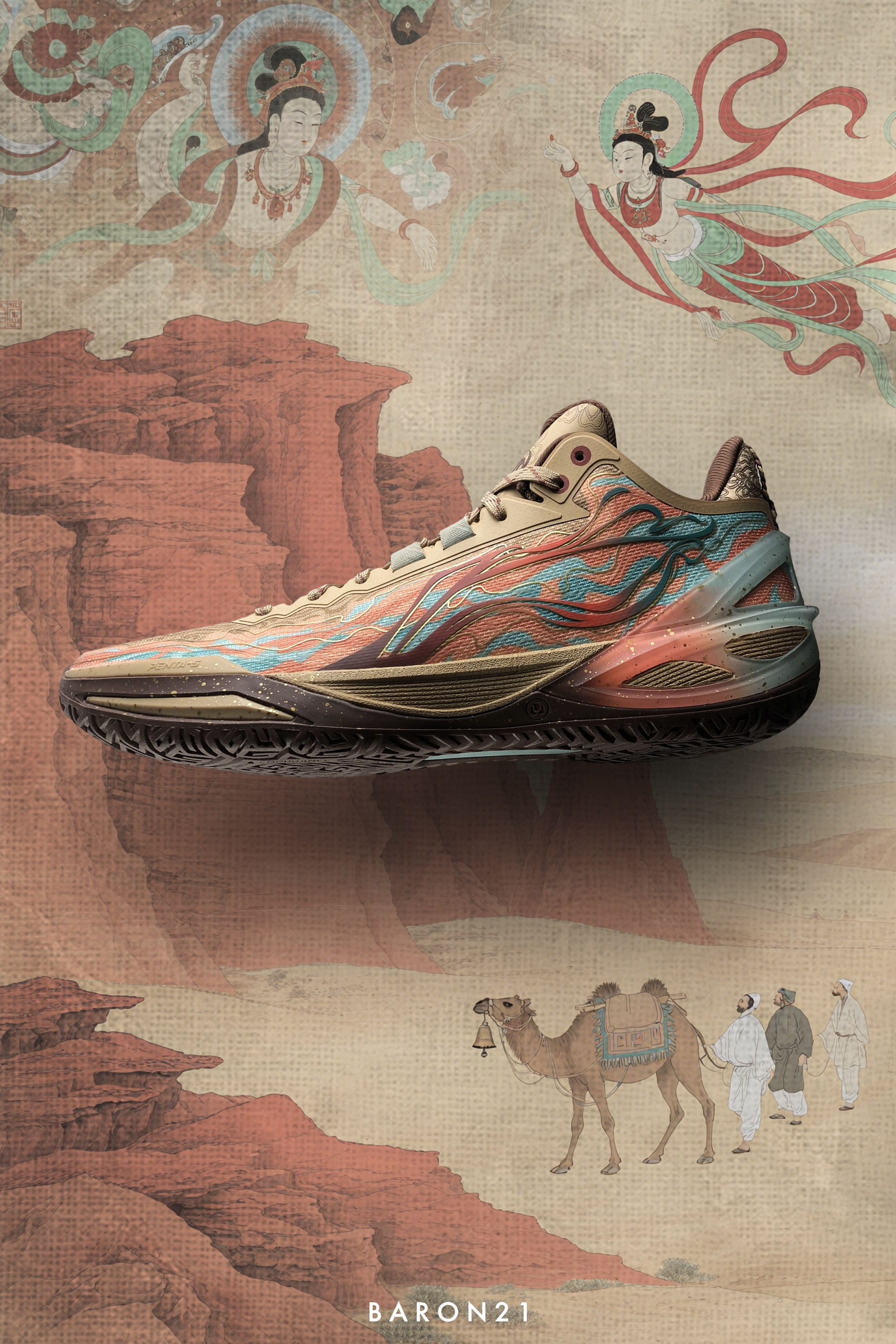 这双利刃6雅丹灵感来源于:丝绸之路上敦煌节点的特殊自然风景。鞋身配色由沙色和棕色组成,还原了古代丝绸之路的韵味。在外侧的李宁LOGO上,设计师加入了敦煌“飞天”壁画的元素,同时结合特殊胶印,质感很独特!而内侧,则印上了中原与西域商贸队伍的图案。鞋面与其他配色也有不同,设计上采用了雅丹地貌的特殊纹理和敦煌壁画的线条风格。TPU也通过消光工艺和特殊贴膜还原飞沙走石。这些元素融合在利刃6雅丹的身上,不仅...